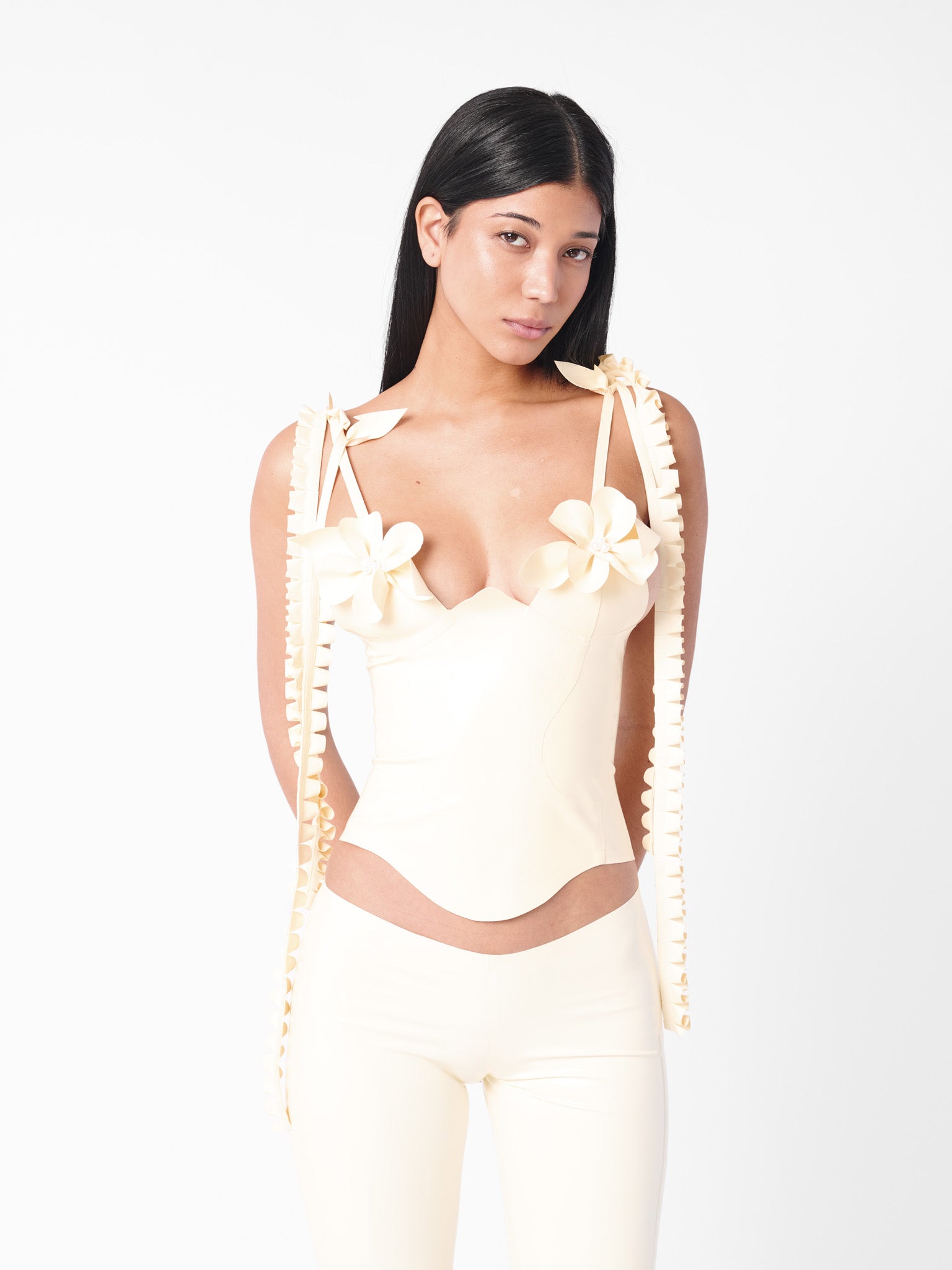 One of our favourites, with a twist. Introducing the Annamaria corset top, adapted from our best-selling latex mini dress introduced in AW23, debuted by JT. The Annamaria is expertly crafted from luxurious off-white latex in our London atelier, with delicate flower petals and leaves blooming from the bust, complete with gleaming beaded pearl detailing. Featuring intricate pleated ties to drape the shoulders and signature corset fastening at the back, you can nip in your waist to your heart’s desire.