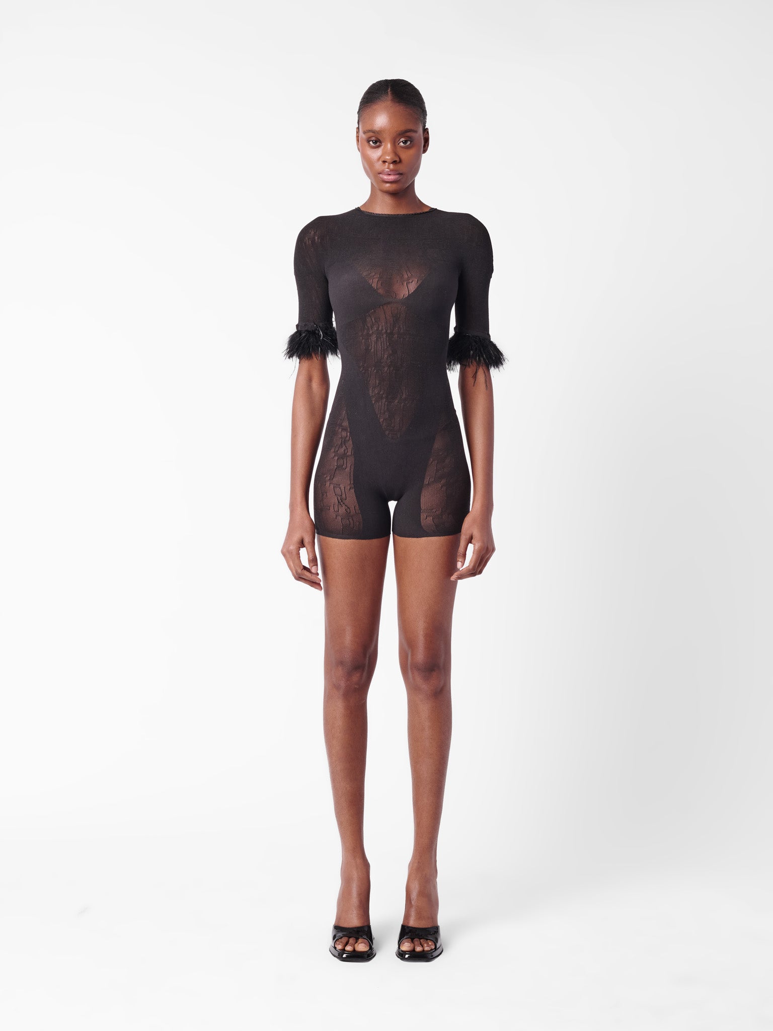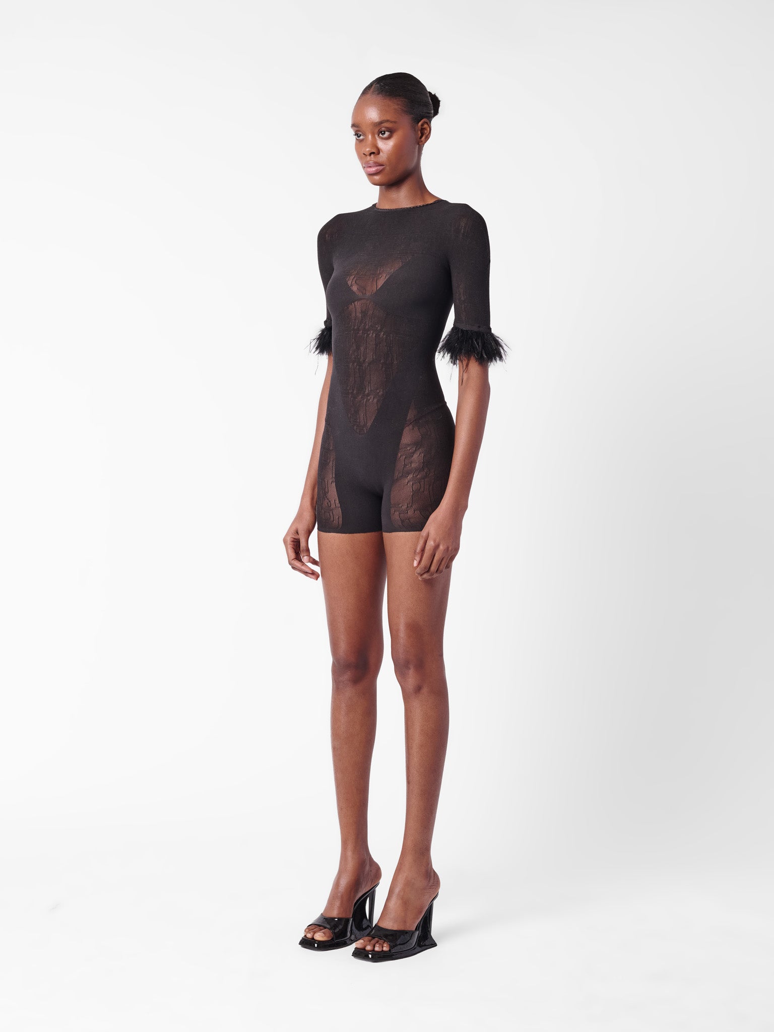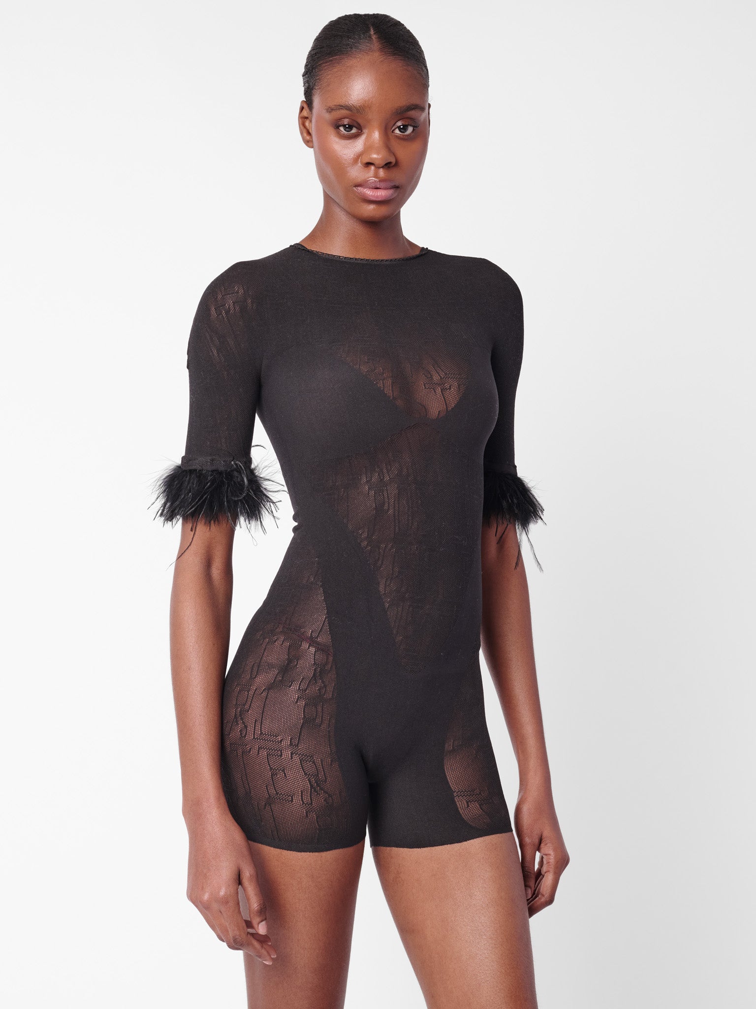 Designed with a custom logo black lace, the Vanderbilt jumpsuit features marabou feather detailing on the sleeves & provides opaque coverage for where you need it most. Perfect for a daytime date or evening event, layer with our outerwear jackets and style with our statement heels for the complete look.