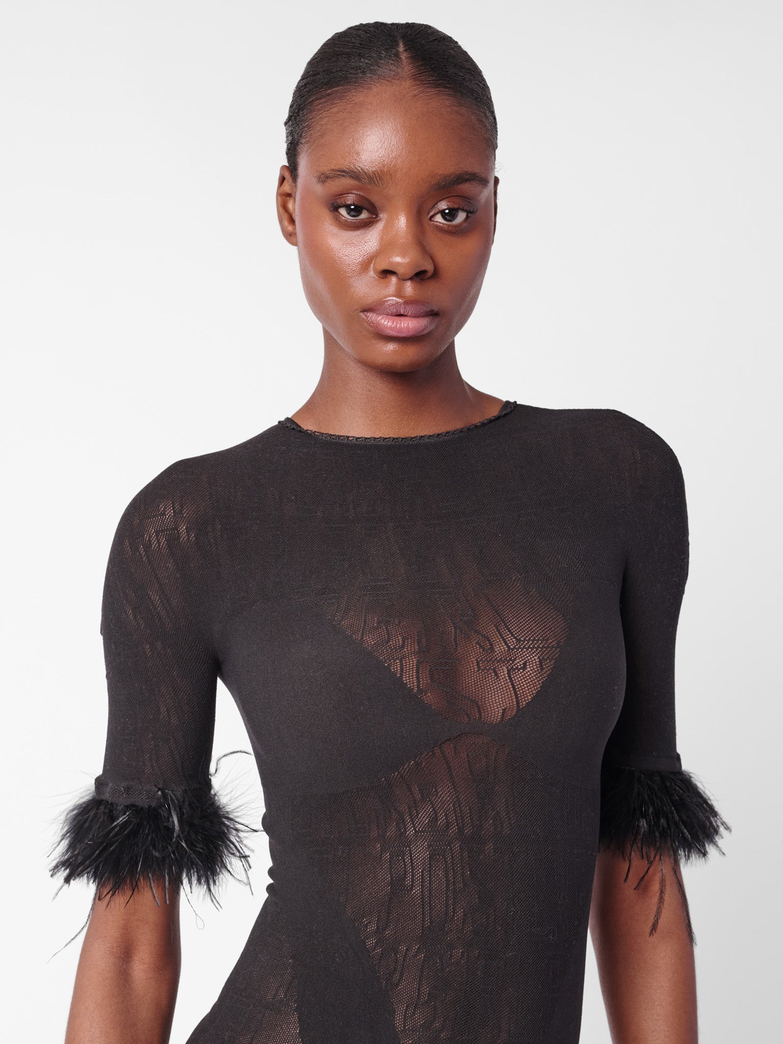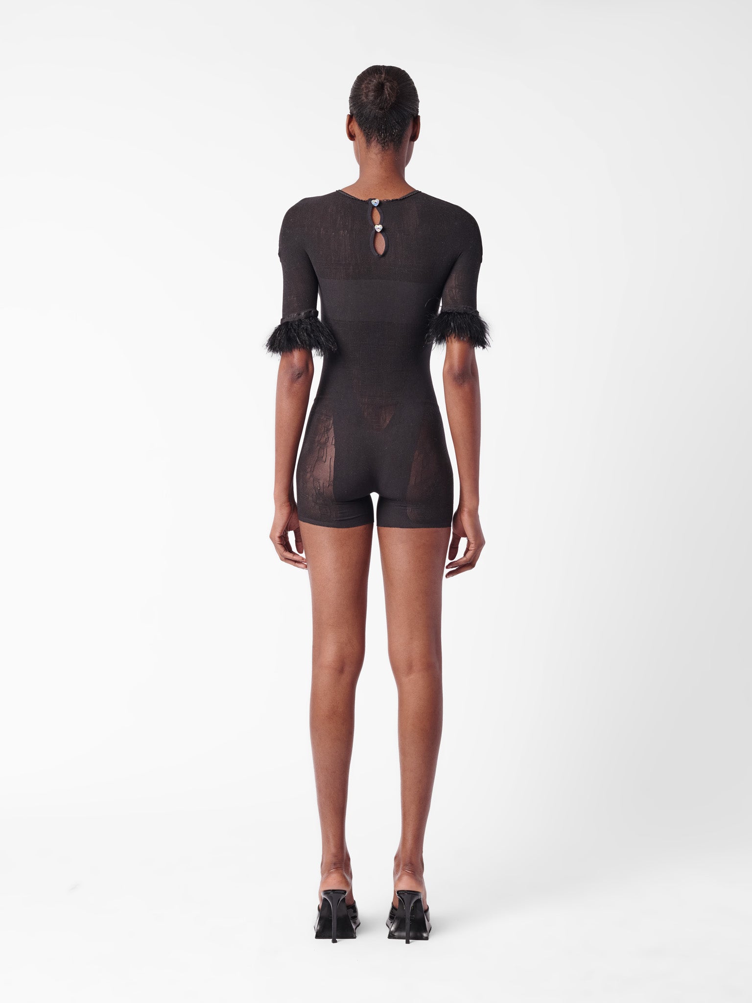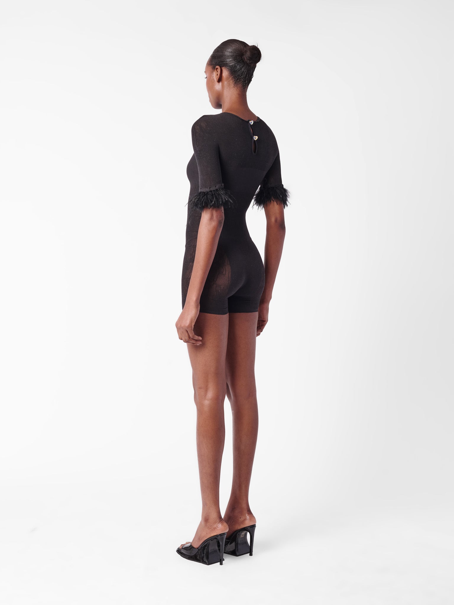 Designed with a custom logo black lace, the Vanderbilt jumpsuit features marabou feather detailing on the sleeves & provides opaque coverage for where you need it most. Perfect for a daytime date or evening event, layer with our outerwear jackets and style with our statement heels for the complete look.