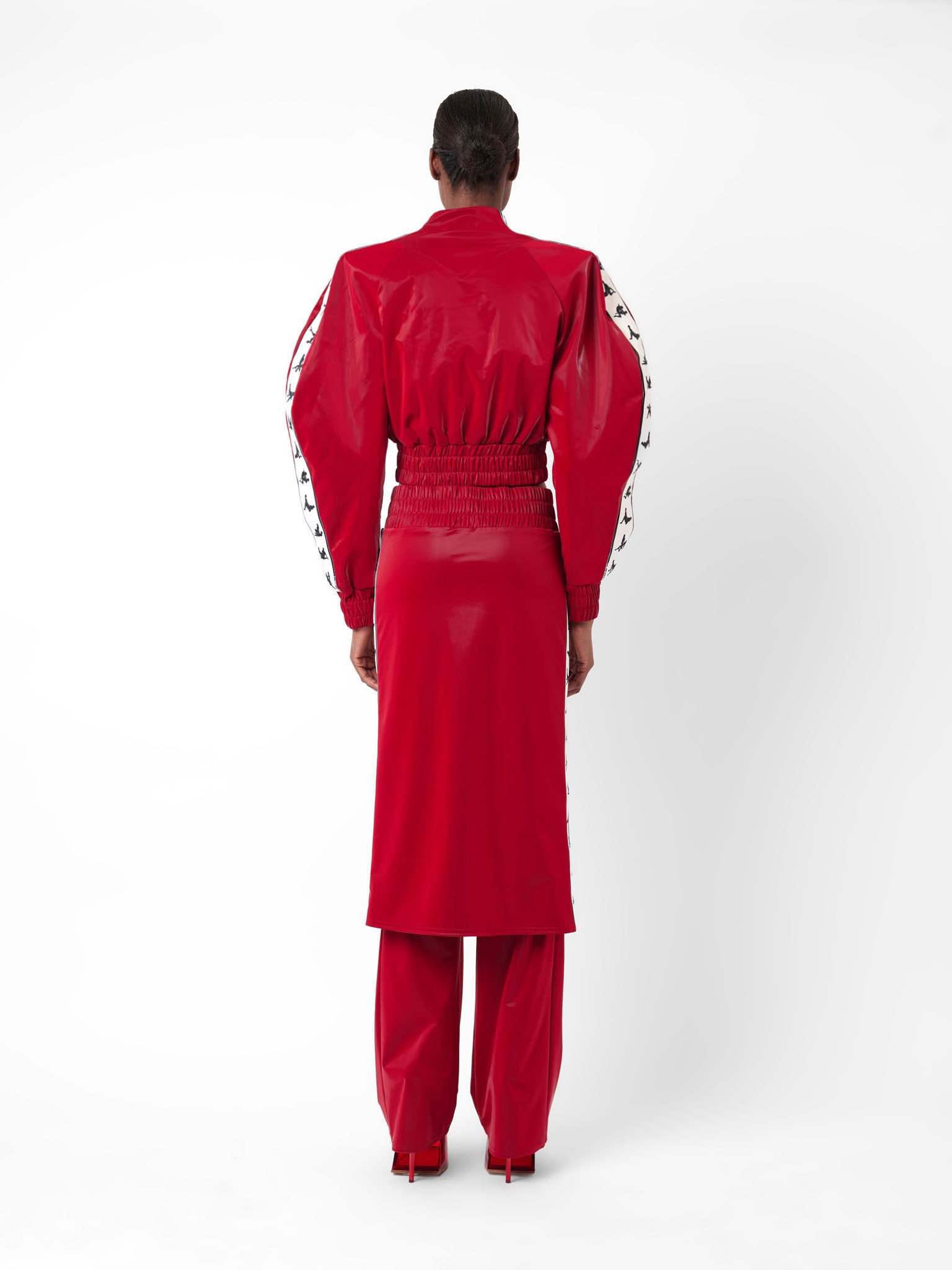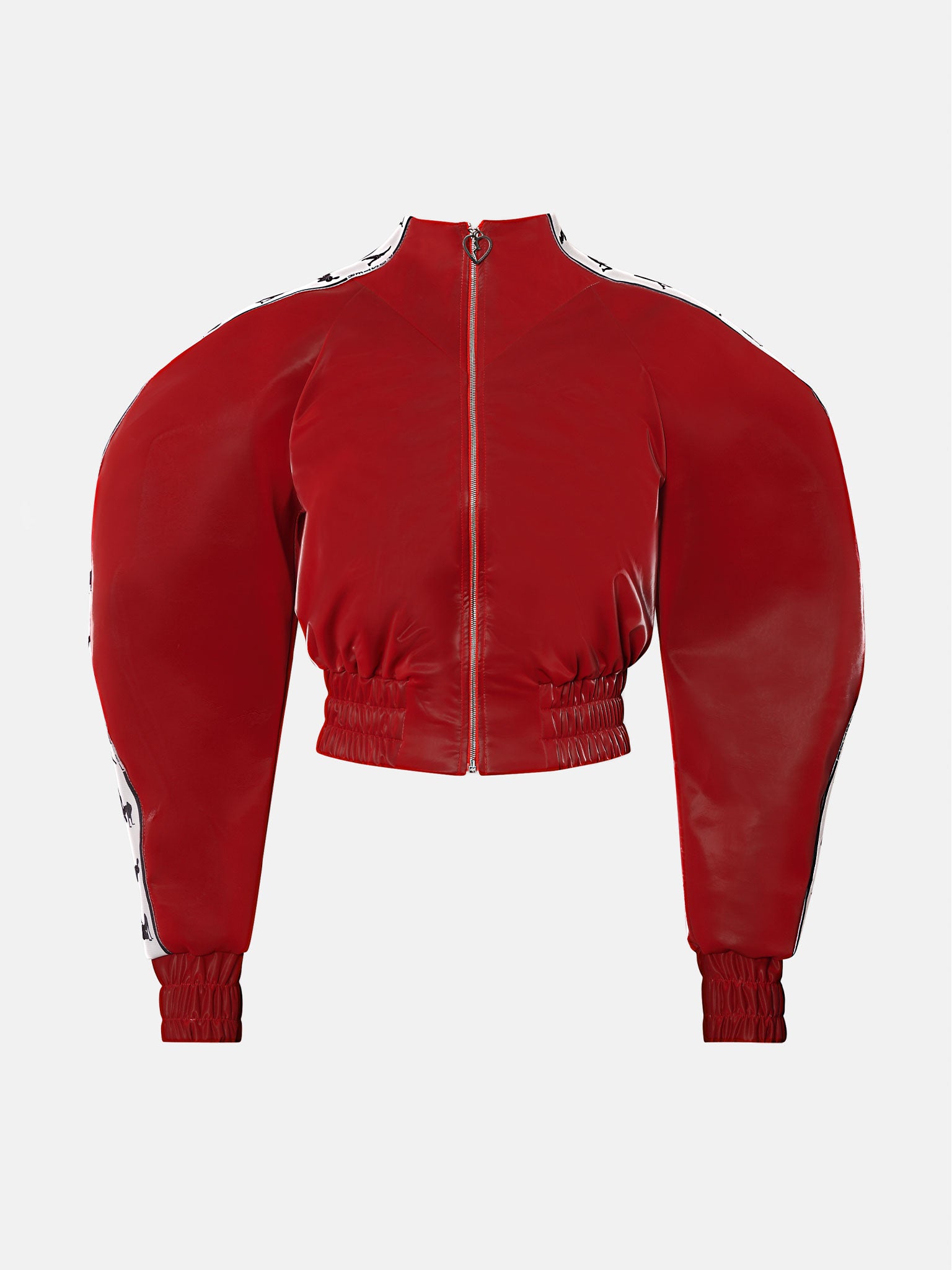 Our Premier Tracksuit Top is bad and boujie. With exaggerated button sleeve shoulder pads with PG heart logo custom zip puller, attached to a silver center front zip. Designed with an elasticated waistband hem in a slightly cropped style. The glossy fabric is fully lined.
