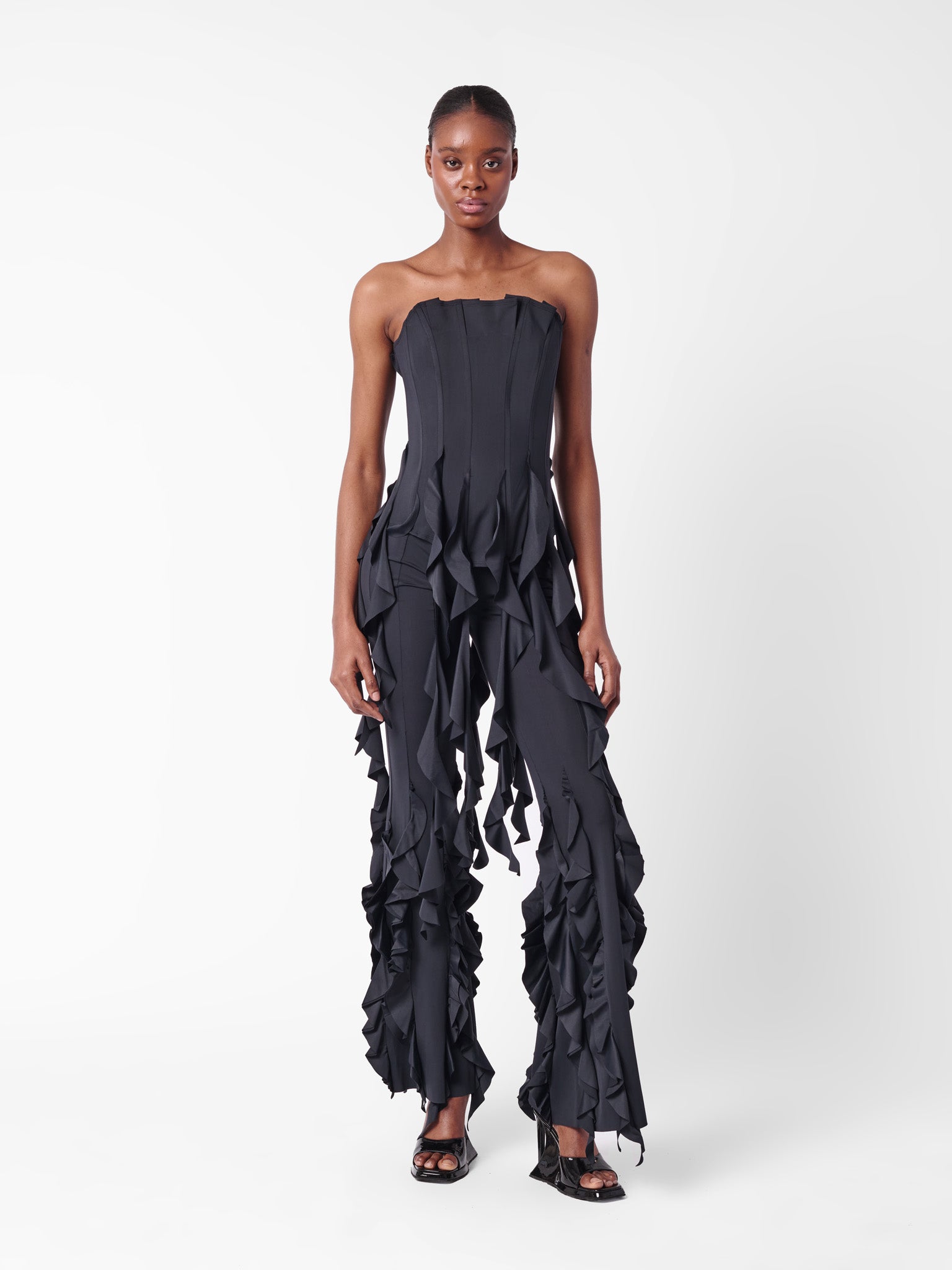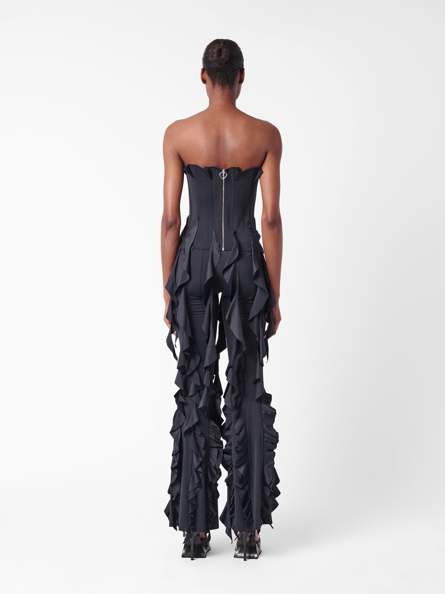 Ruffle some feathers, tonight is about you. The Rhona Ruffle Trousers are designed with draped ruffles and panelling details, all made from recycled lycra. They sit low rise and don't include a zip, for a clean and fitted look. Dont stress because they do stretch and have an elasticated waistband.
