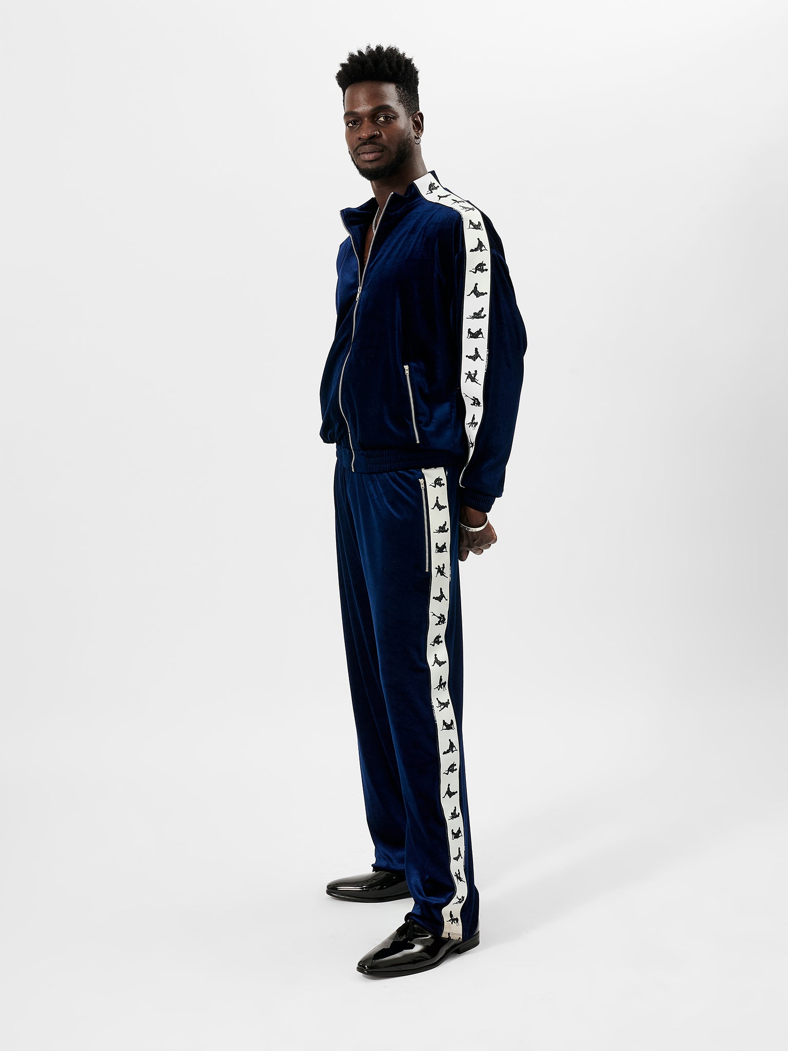 Introducing our unisex S*x Tape Tracksuit Bottoms. Designed in a blue velour fabric, it features a kama sutra sex tape that runs down each leg as well as pockets at each side. Pair with the S*x Tape Tracksuit Jacket for the complete look.