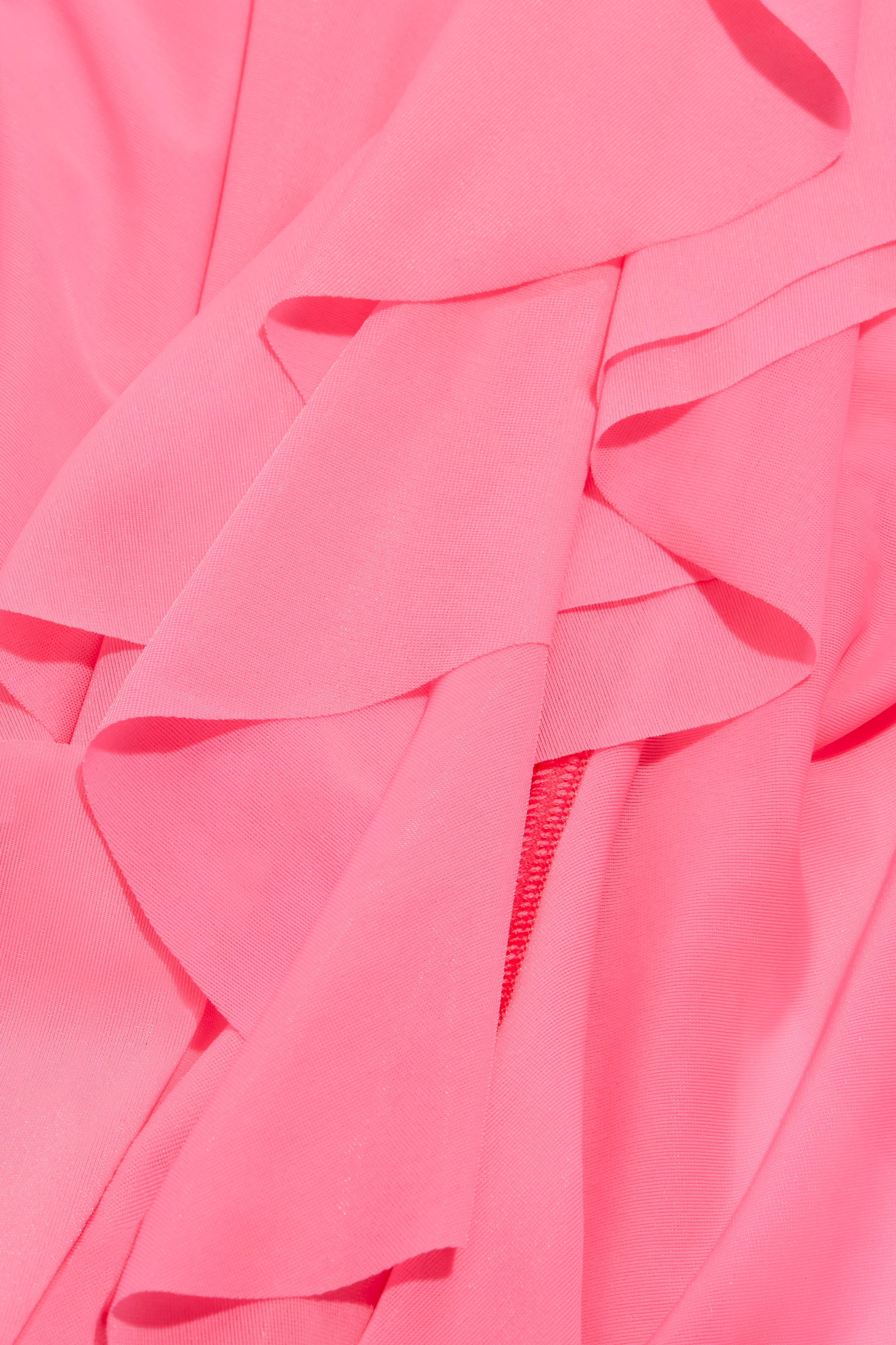 Brand new for SS23 is the Dakota dress. Crafted in London in luxurious Pink Texas semi sheer stretch mesh, this mini dress features a halter neck, a plunging open neckline secured with spaghetti straps secured with golden hardware, draped flowing frills and panelling detailing.