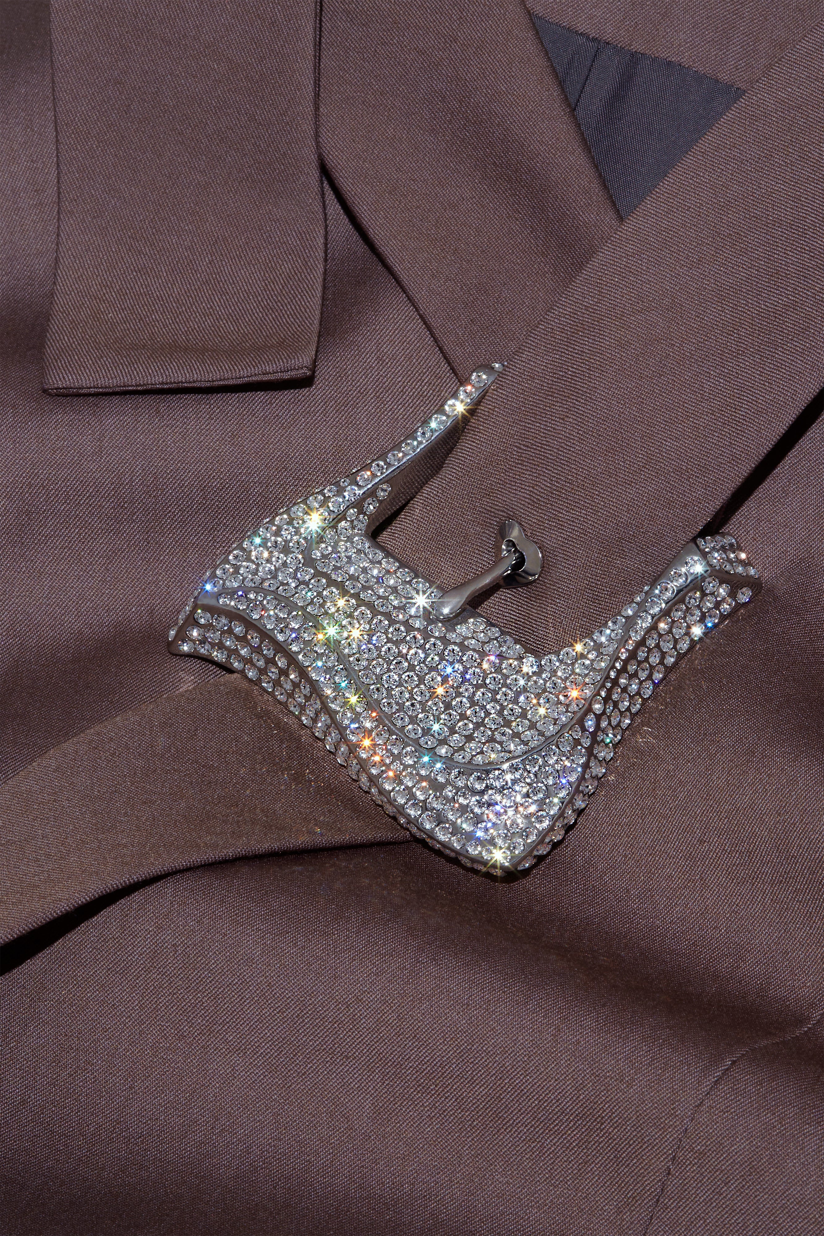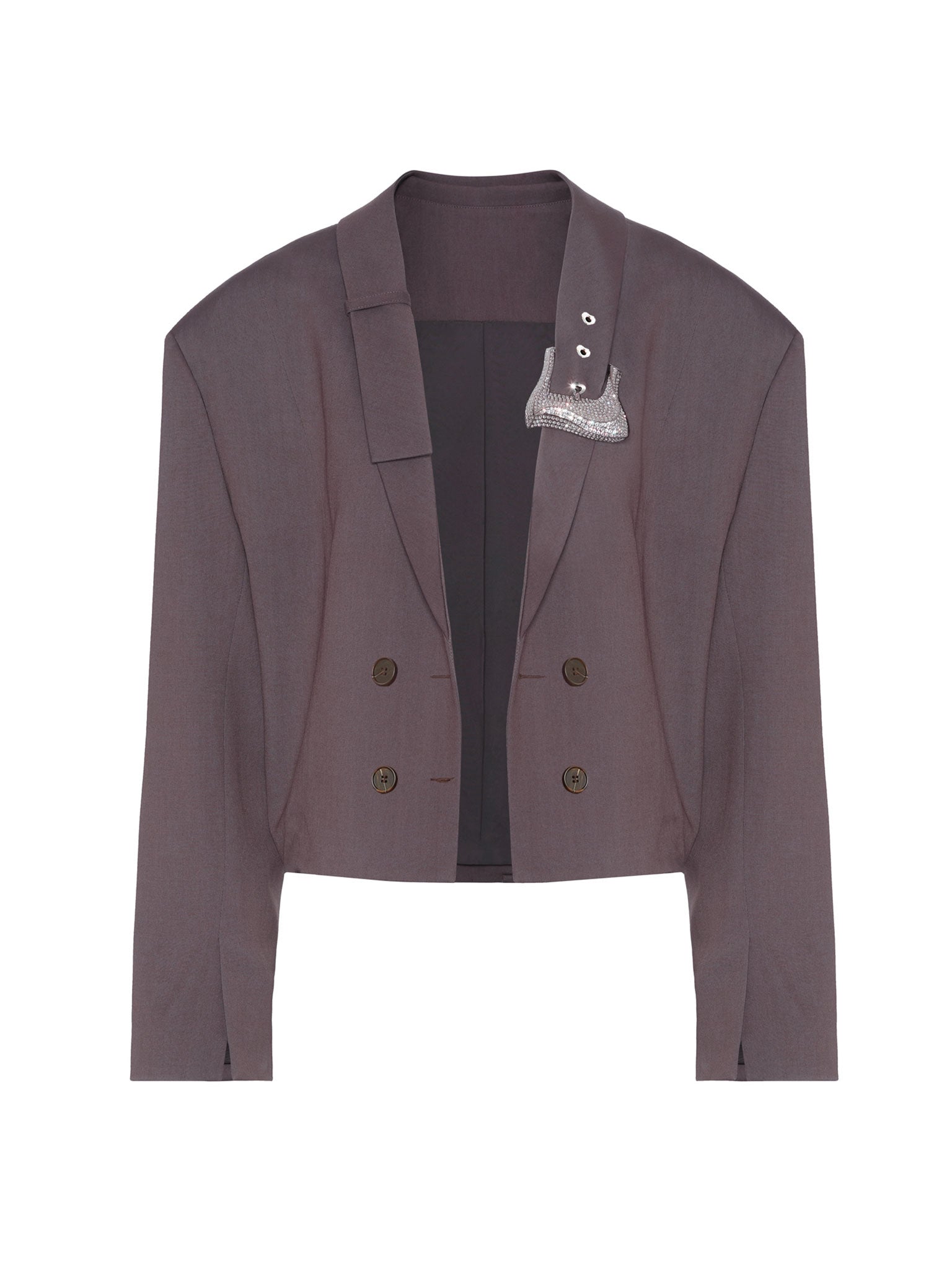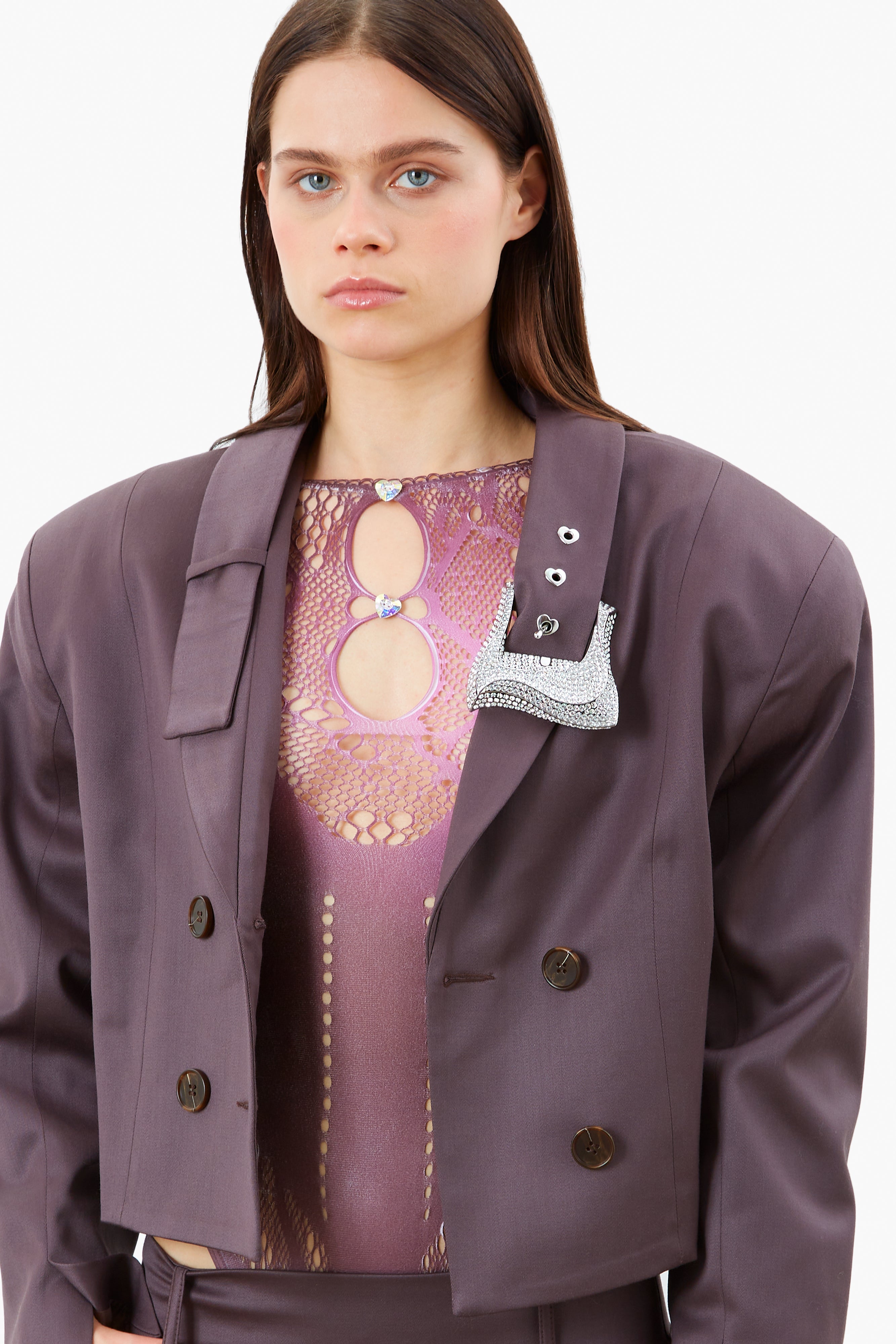 The Suzan Copped Blazer is this seasons staple piece. Crafted in London with exquisite tailoring techniques, this double breasted blazer features our dazzling diamanté buckle, statement lapel and layered shoulder pads for a boxy oversized fit. Fully Lined.