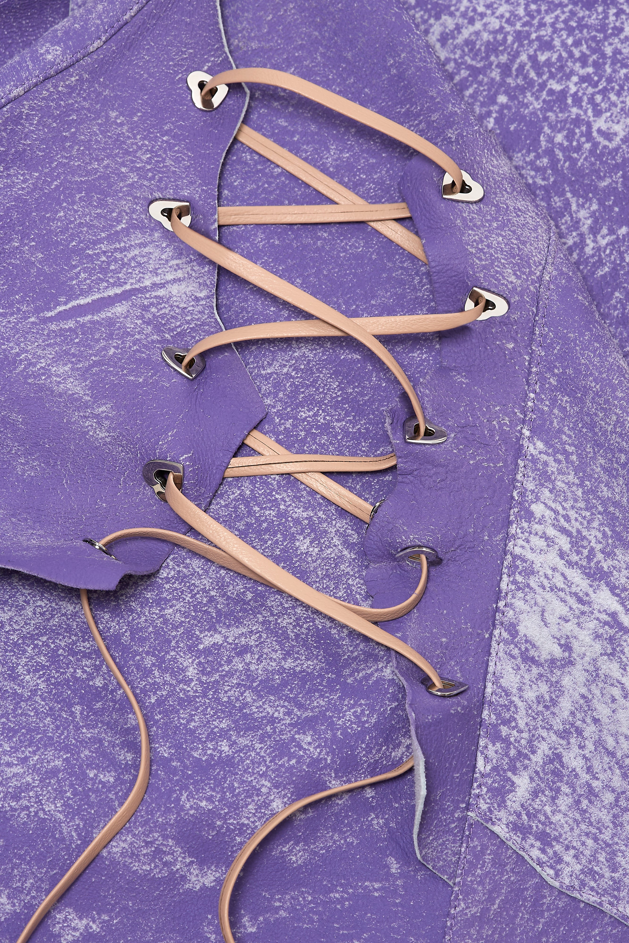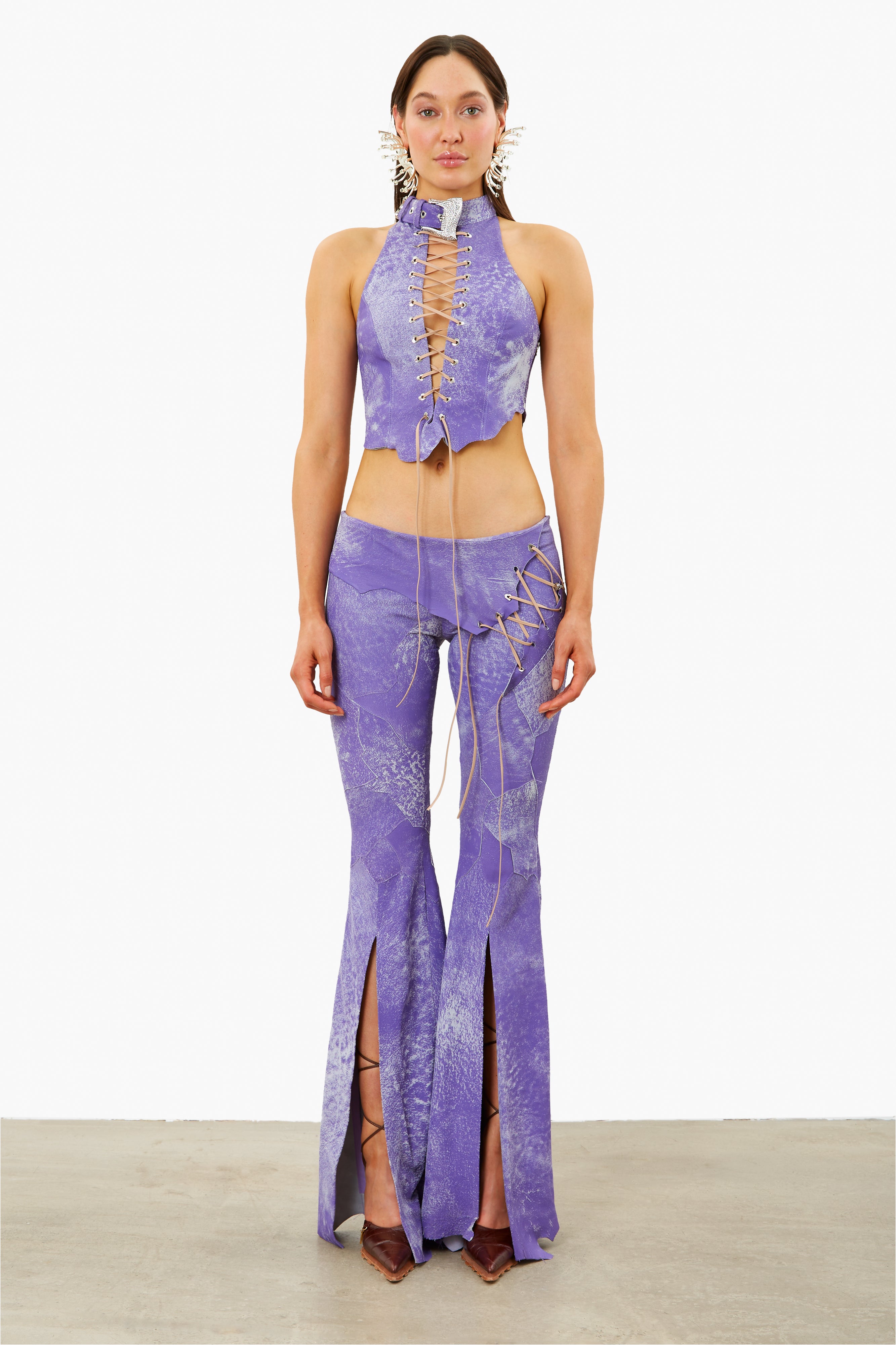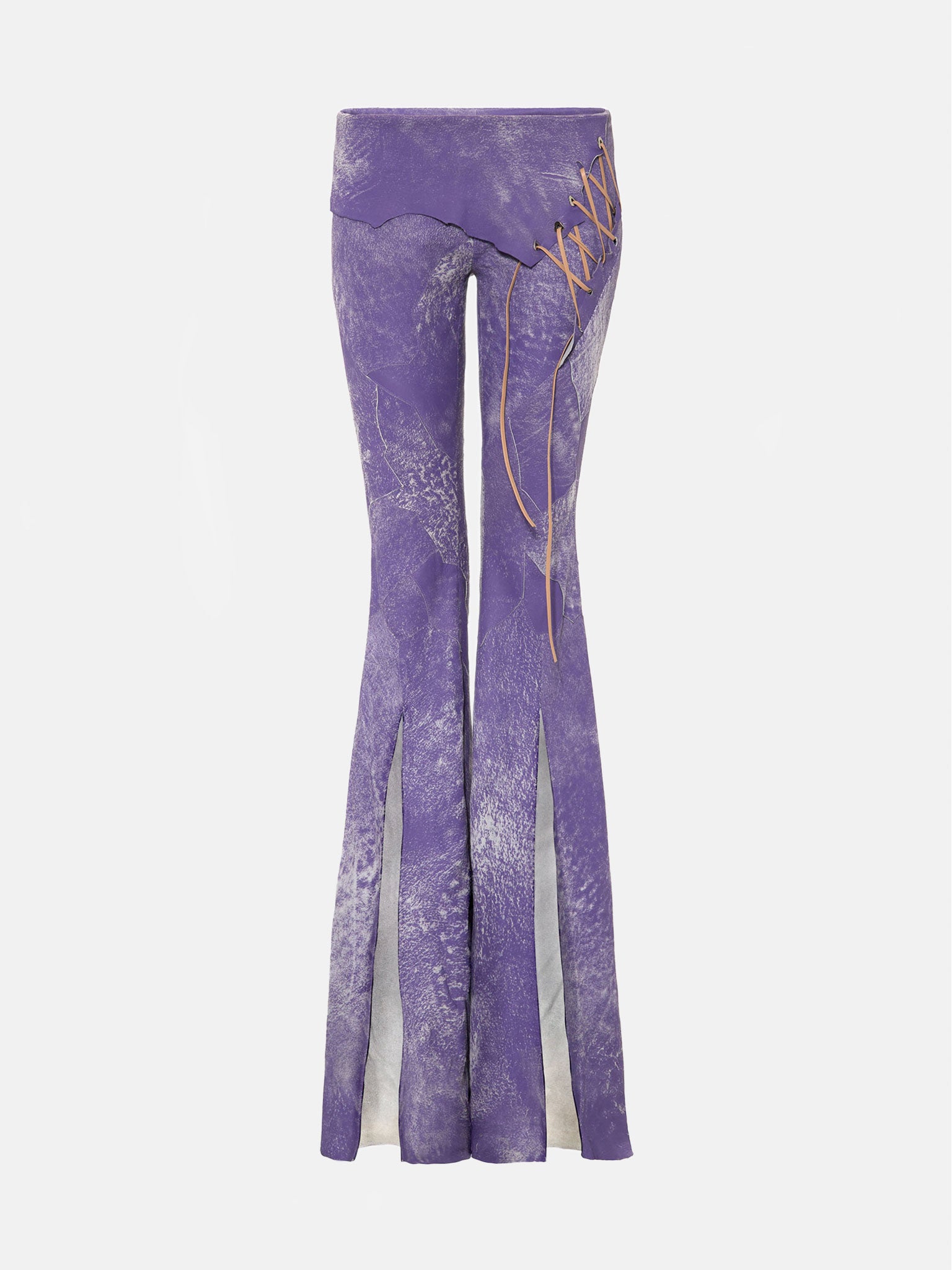 The Tatjana Trousers showcased on the SS23 runway. Crafted in London with exquisite tailoring techniques, these distressed Poison leather trousers feature intricate patchwork detailing and a skirt overlay with lacing detail. Secured with leather lacing cord and silver heart eyelets.