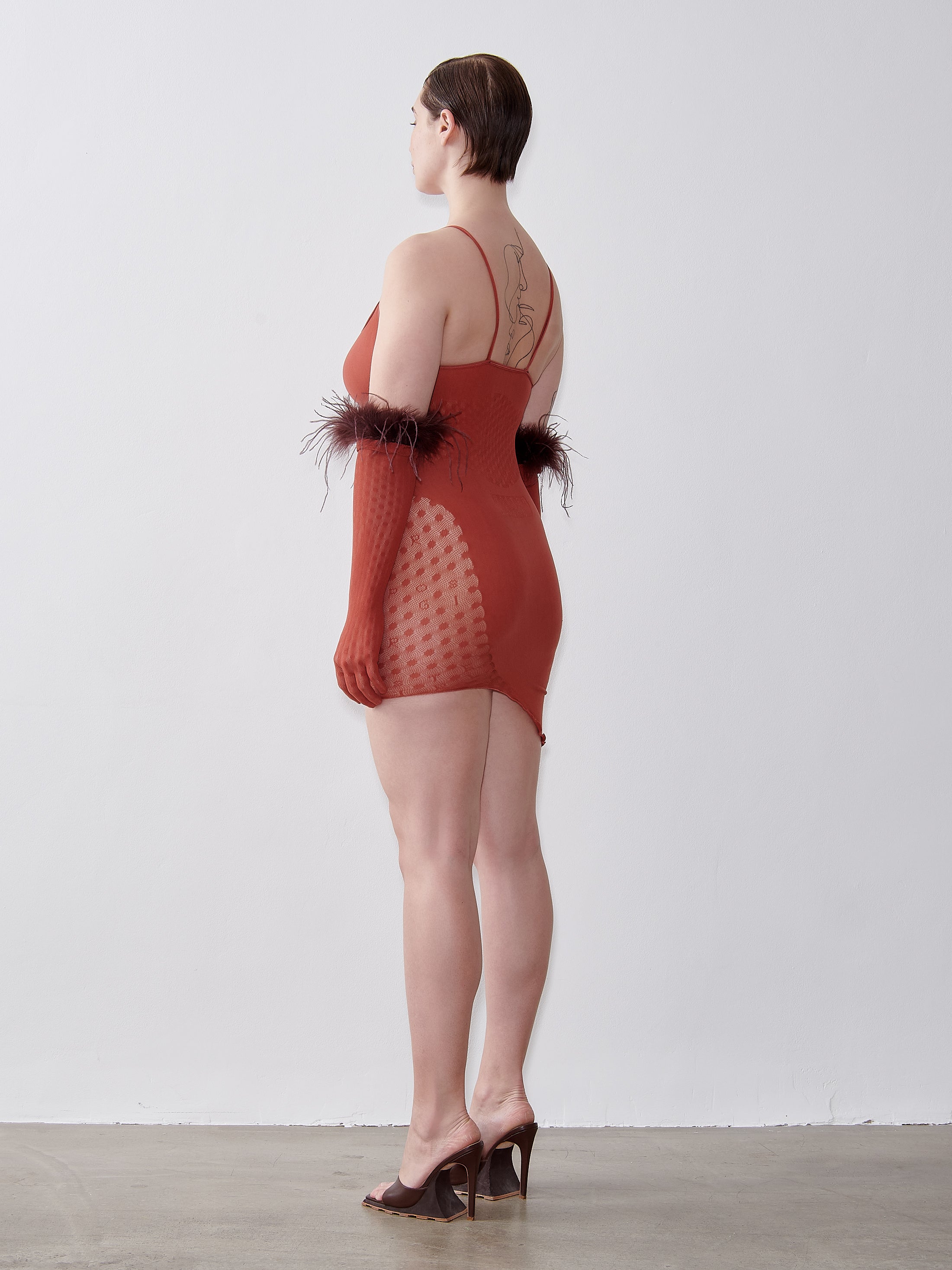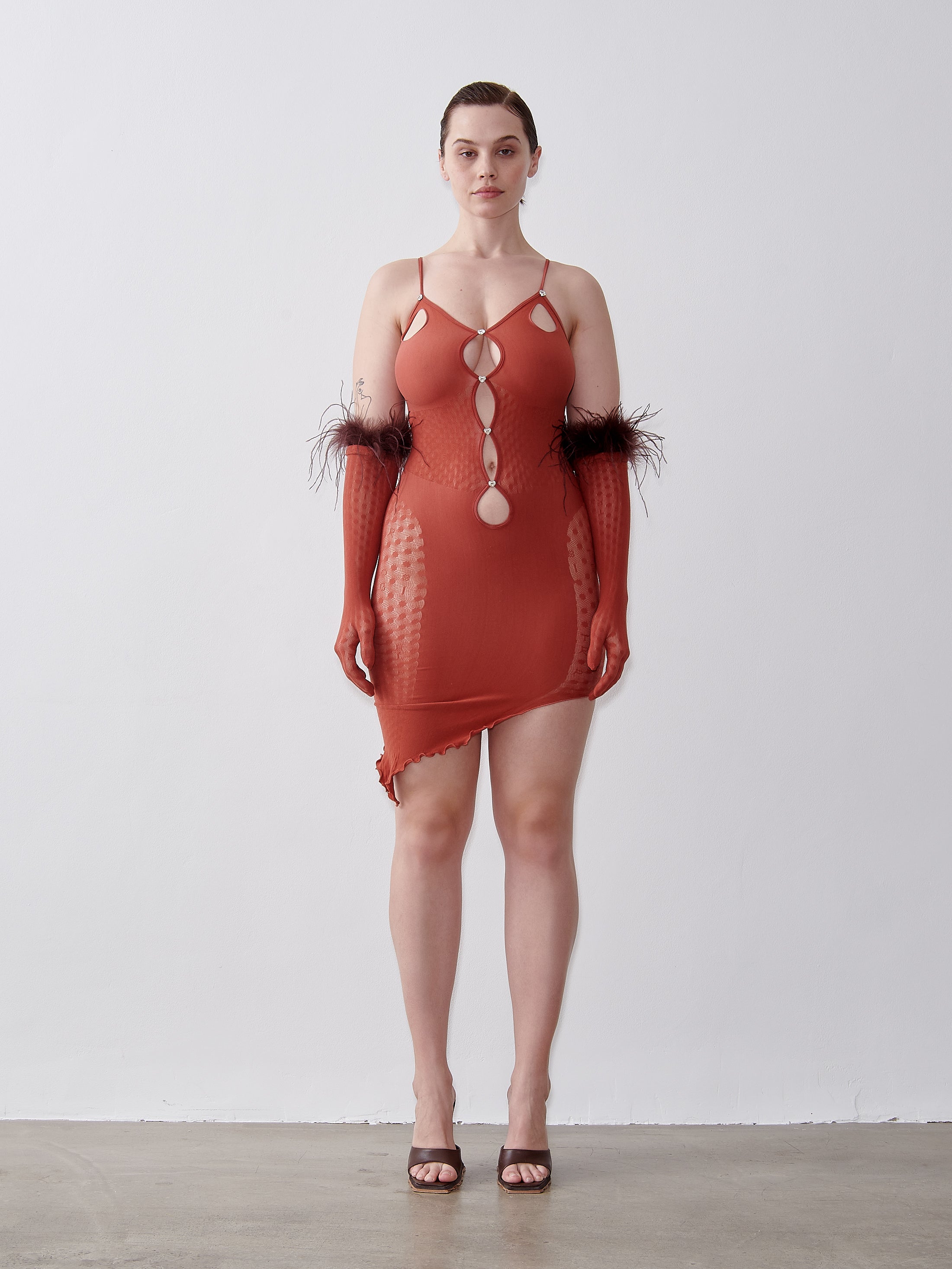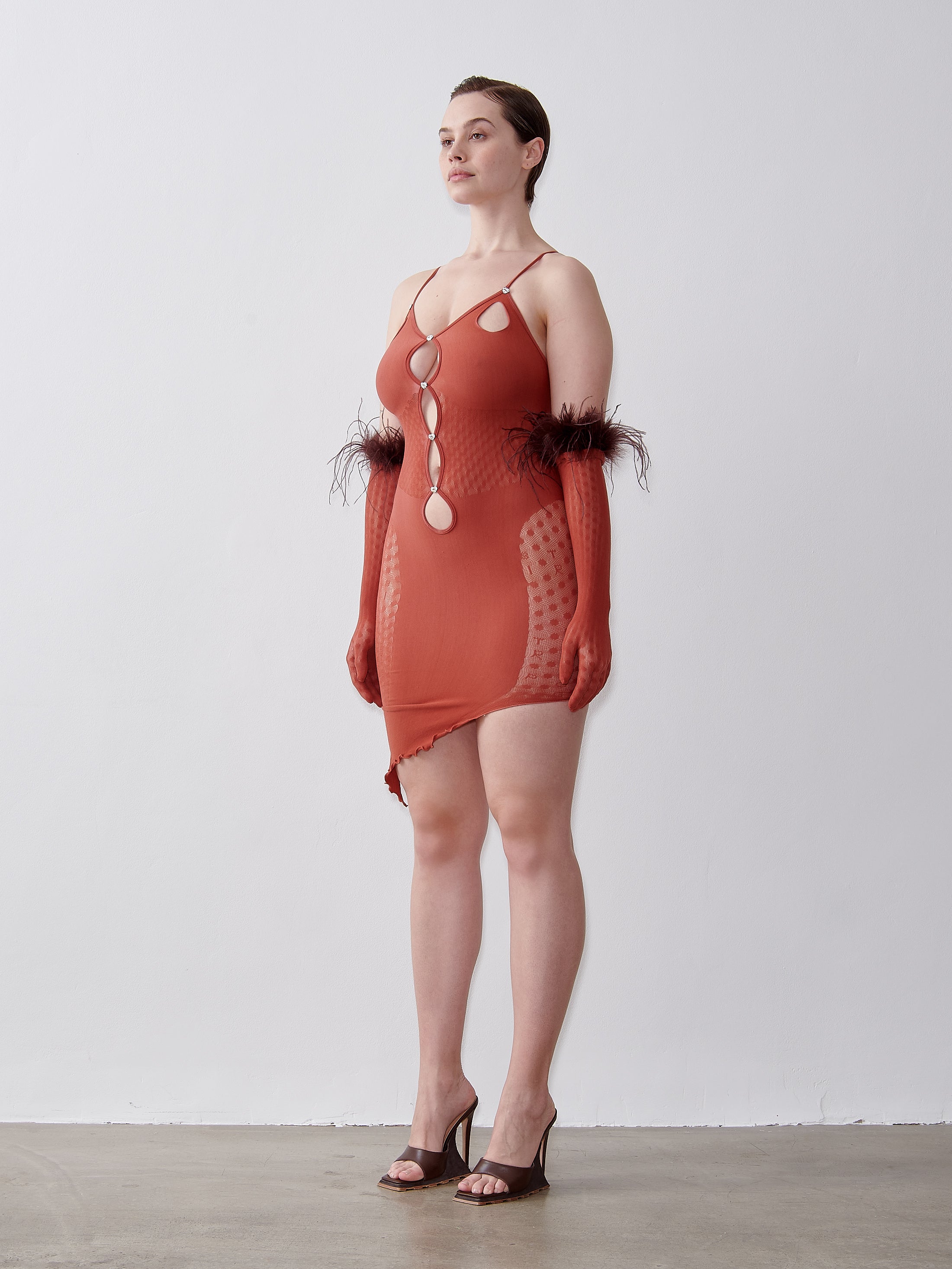 POSTER GIRL's innovative fishnet shapewear features 'logo polka dot lace' and suctions you in all the right places. Cutout crystal heart embellished details in the open-work cut out front. The brand logo is stamped into the back neck and softly spun yarns makes for maximum comfort.