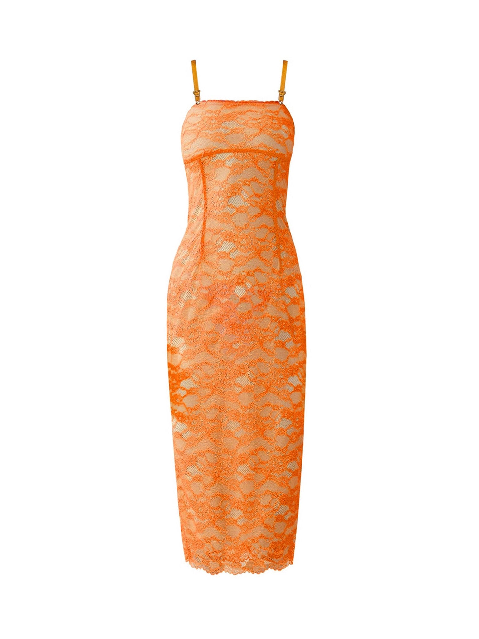 This midi dress allows you to take the allure of lingerie beyond the bedroom - it has a slimming slip silhouette with delicate lace. Gold plated hardware features adjustable bra straps and delicate lace scallop edging.