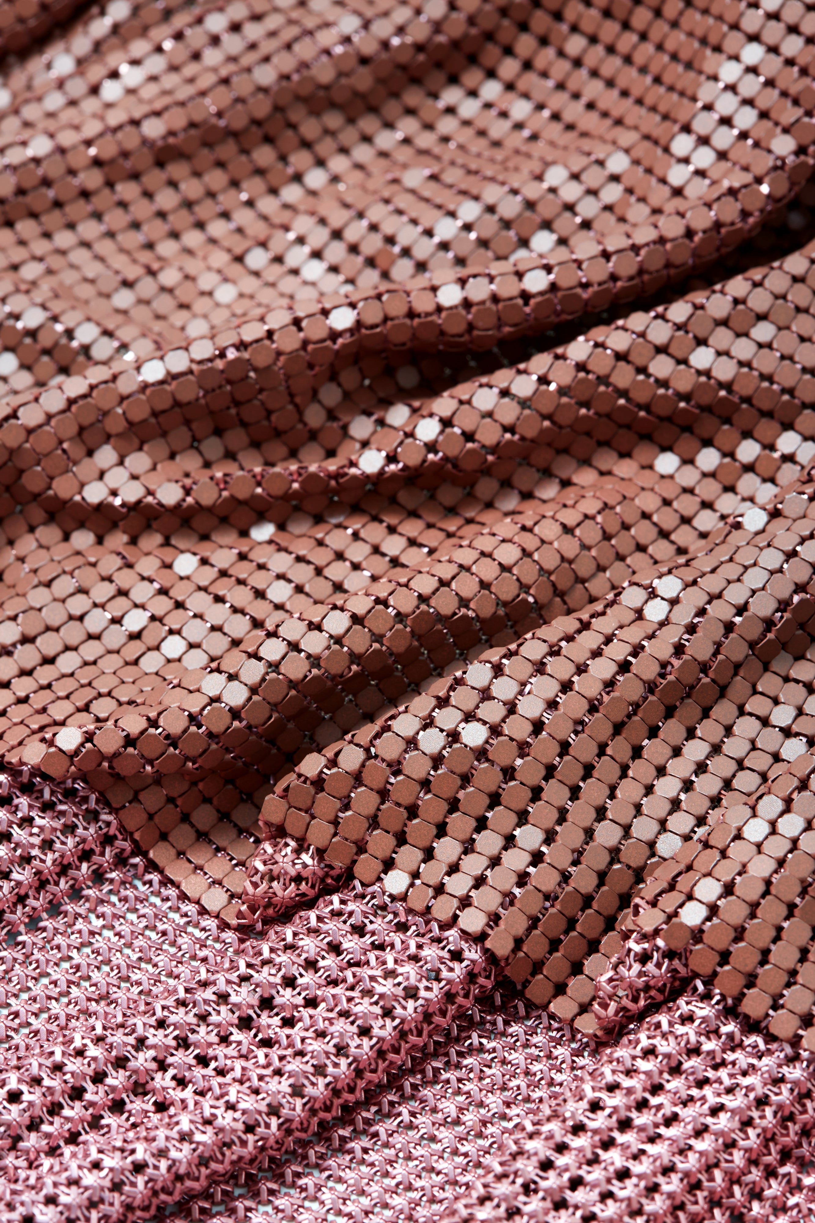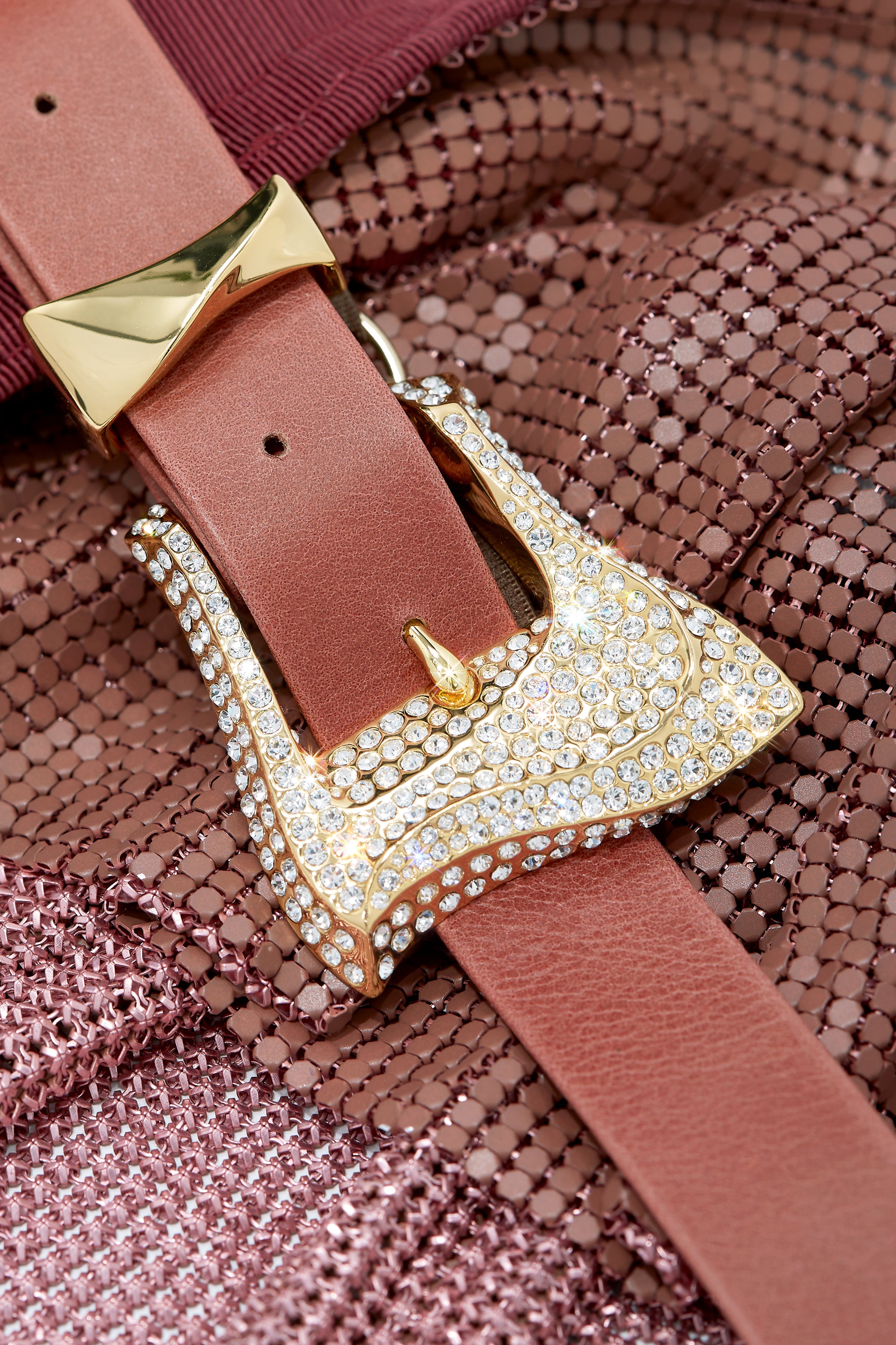 The Adrianne Dress has forever been our signature statement Dress. Crafted in London in heavy weight Dune and Cigar chainmail, the dress features a flattering cowl drape neckline construction. Luxurious leather straps secure the top with adjustable plush bra straps for the perfect fit. Finished with our iconic dazzling diamanté buckle, engraved with our logo. A wrap elasticated back skirt secures at the centre with silver plated hardware, that can be adjusted for the perfect fit. Fully lined with logo stretch mesh.