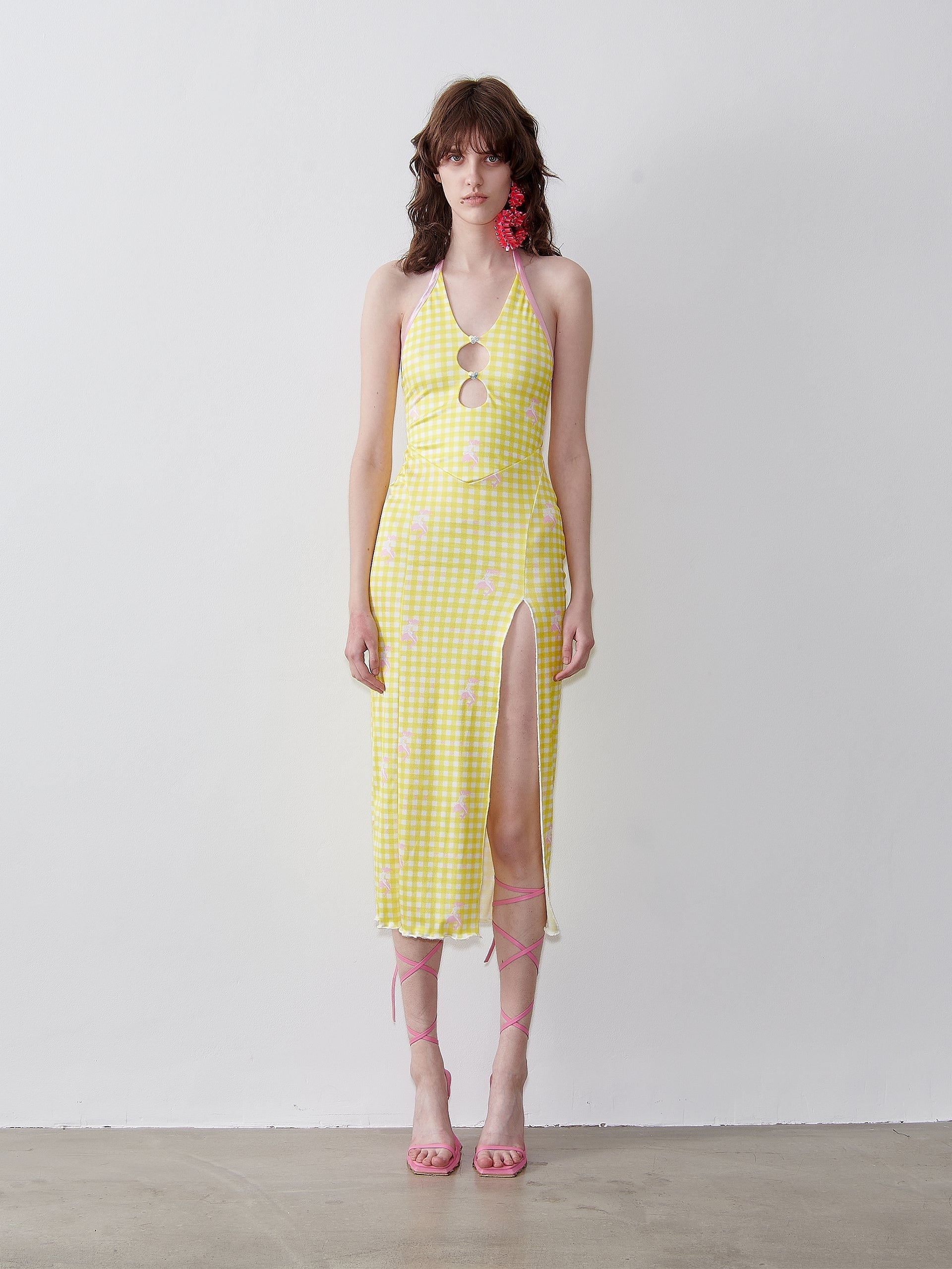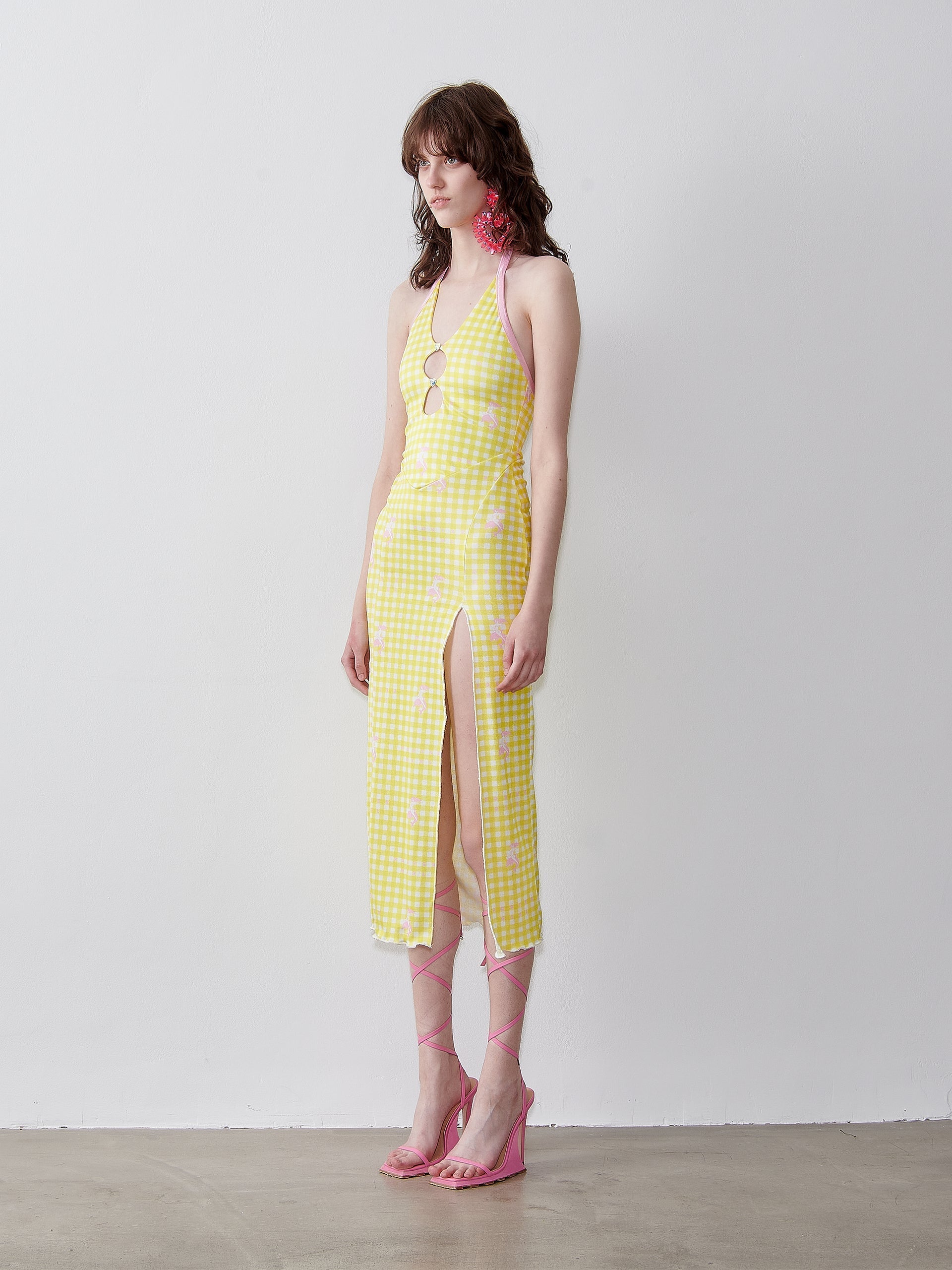 Dive into the exclusive POSTER GIRL POOLSIDE collection with the Heather Midi Dress. The midi dress is crafted in luxurious powermesh and debuts our iconic POOLSIDE gingham logo print. The Heather Dress features our signature cut out crystal heart detailing and long adjustable back tie. Finished with a high rise split and lettuce hem edging the Heather Dress is the perfect from poolside to the dance floor.