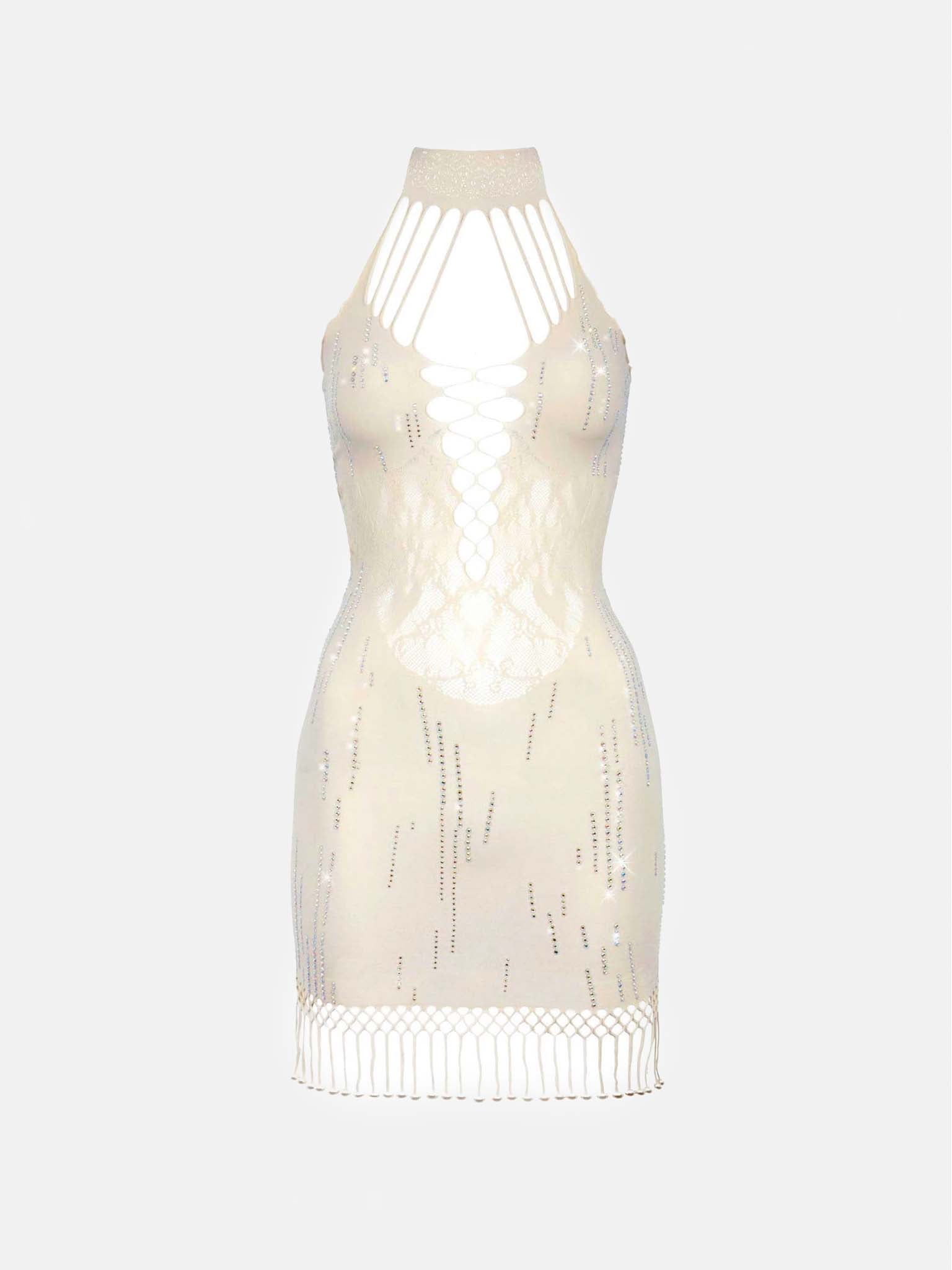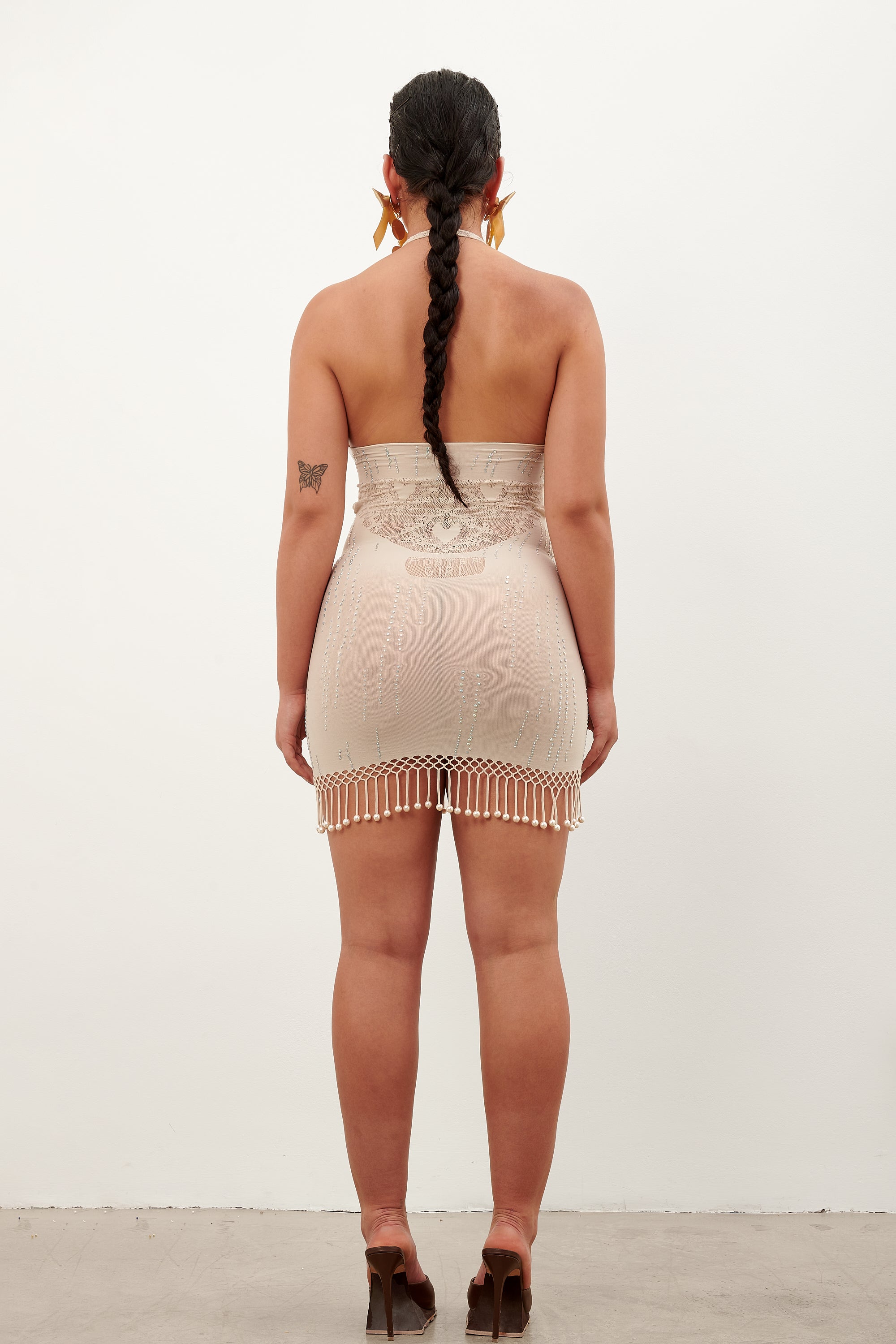 POSTER GIRL's shapewear category is designed to suction you in all the right places, releasing and supporting your natural curves where needed. The Poseidon Dress is a brand new design for AW23, featuring our brand new heart & bow intricate lacing, swarms of iridescent rhinestones, a halter neck and fringing detailing - finished with beaded pearls. As always, our shapewear features our infamous peep hole cut outs with heart iridescent buttons. Exclusively available in Candy Pink. Always remember, the brand logo is stamped into the lower back of all shapewear designs as POSTER GIRL's mark of authenticity.