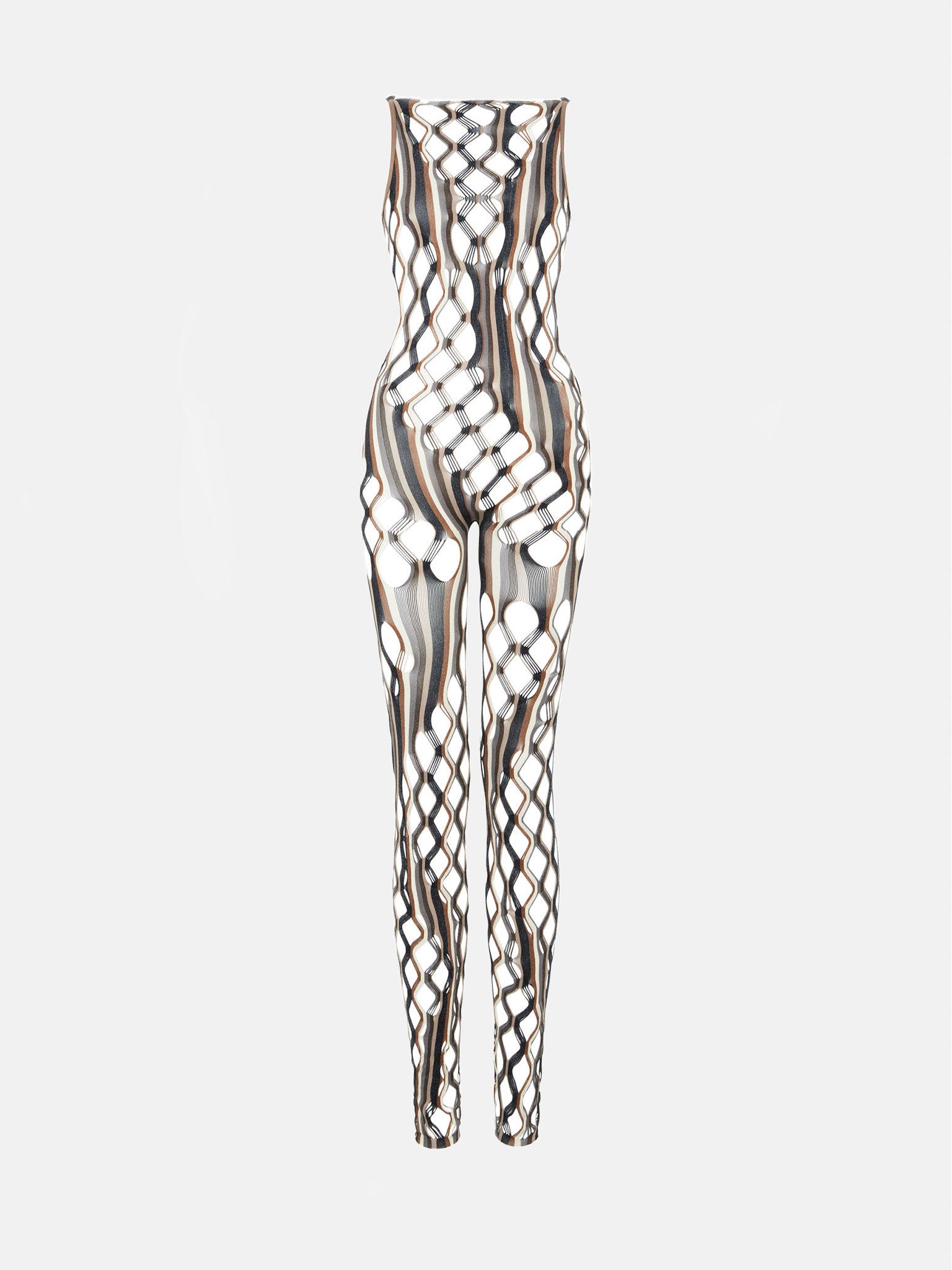The Reef Jumpsuit is brand new for AW23. Featuring our newly developed semi sheer shapewear, hand dyed yarns that blend together in Oyster and Burgundy stripe and our infamous diamond cut open weave lacing, contouring every body to perfection.