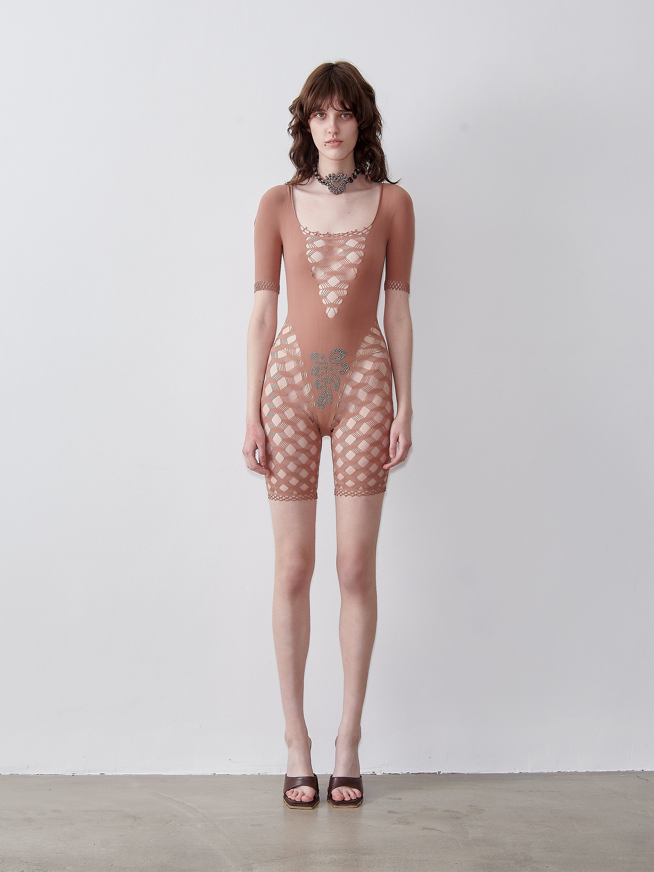POSTER GIRL's daring Shelly Playsuit is one for the brave. Lattice diamond cut lace frames the figure and opaque form fitting knitwear hugs and shapes the body. Finished with a cheeky fig leaf vajazzle; don't be shy you know you need it.