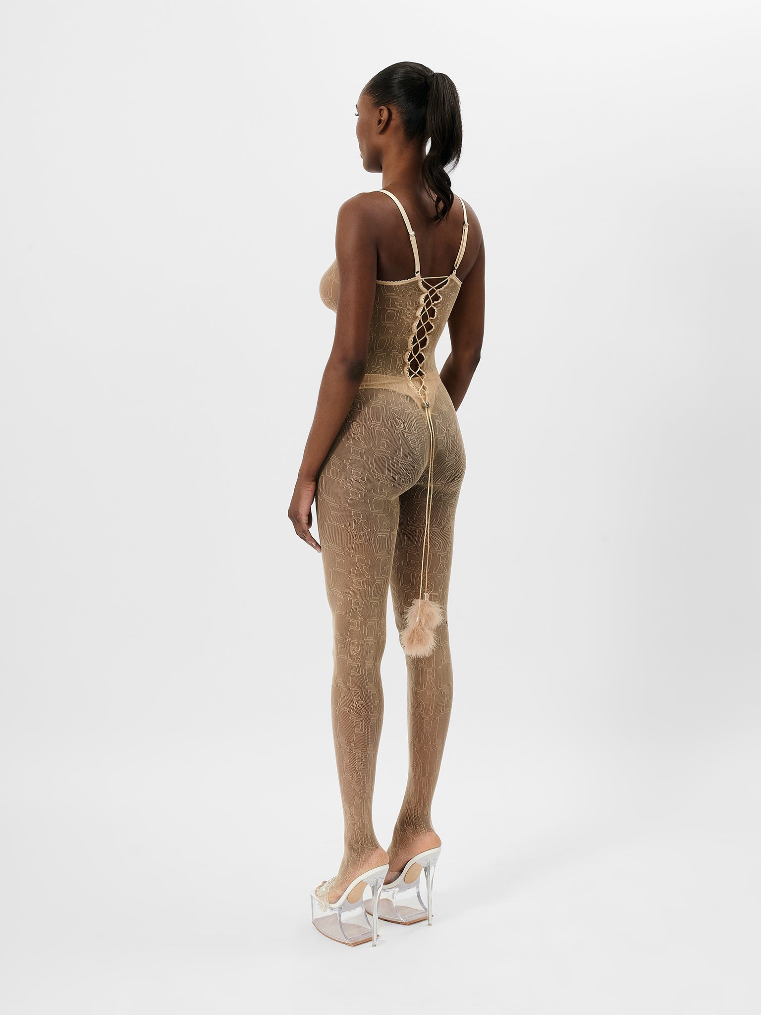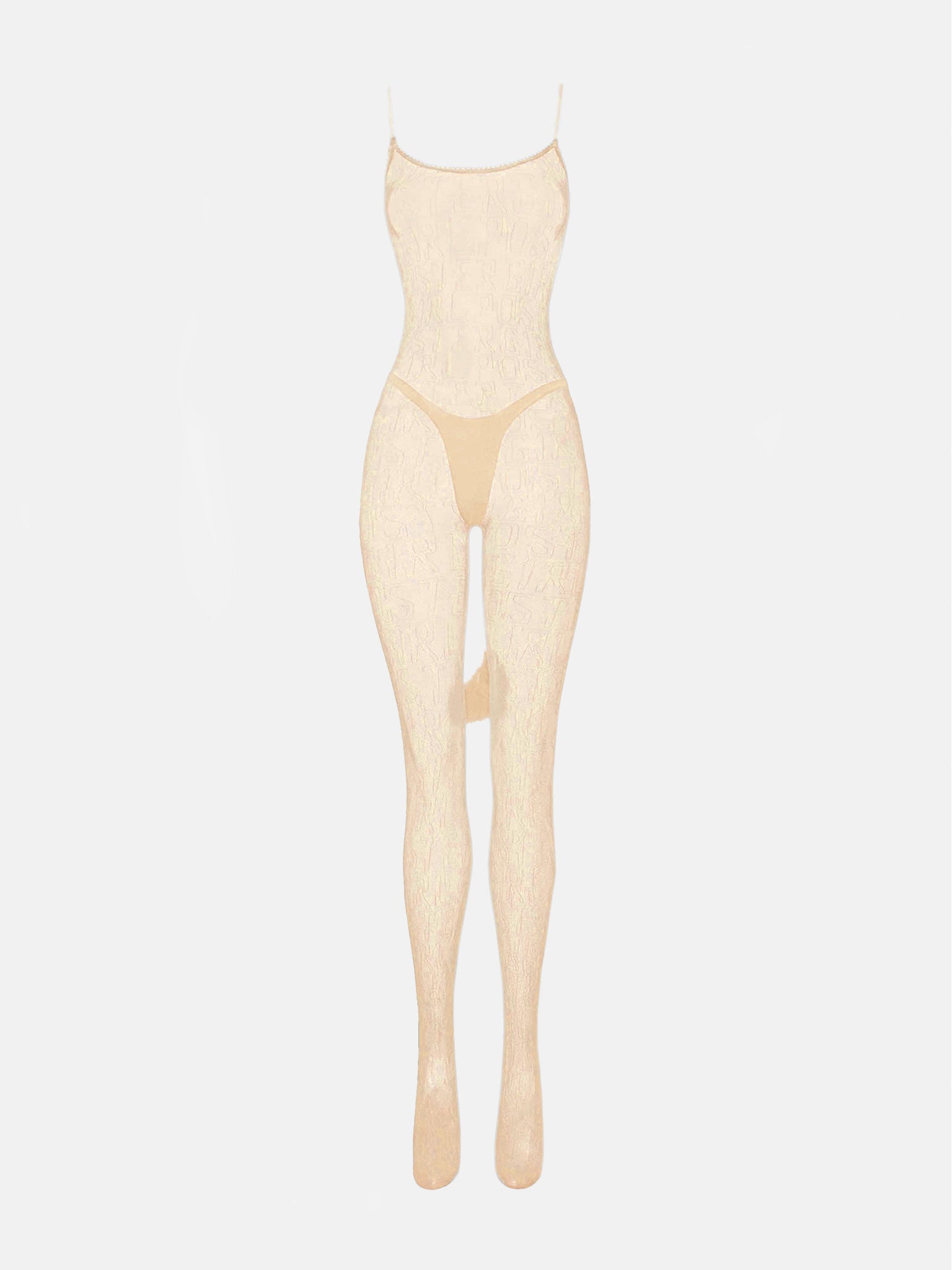 Dare to be more than ordinary in the Minted Jumpsuit. Cut from a delicate custom logo beige lace, this figure skimming full length jumpsuit features adjustable spaghetti shoulder straps and a lace-up back detailing which can be adjusted to your desired fit. Temper the sheerness with the matching beige thong and our Niparon Premium Nipple Covers.