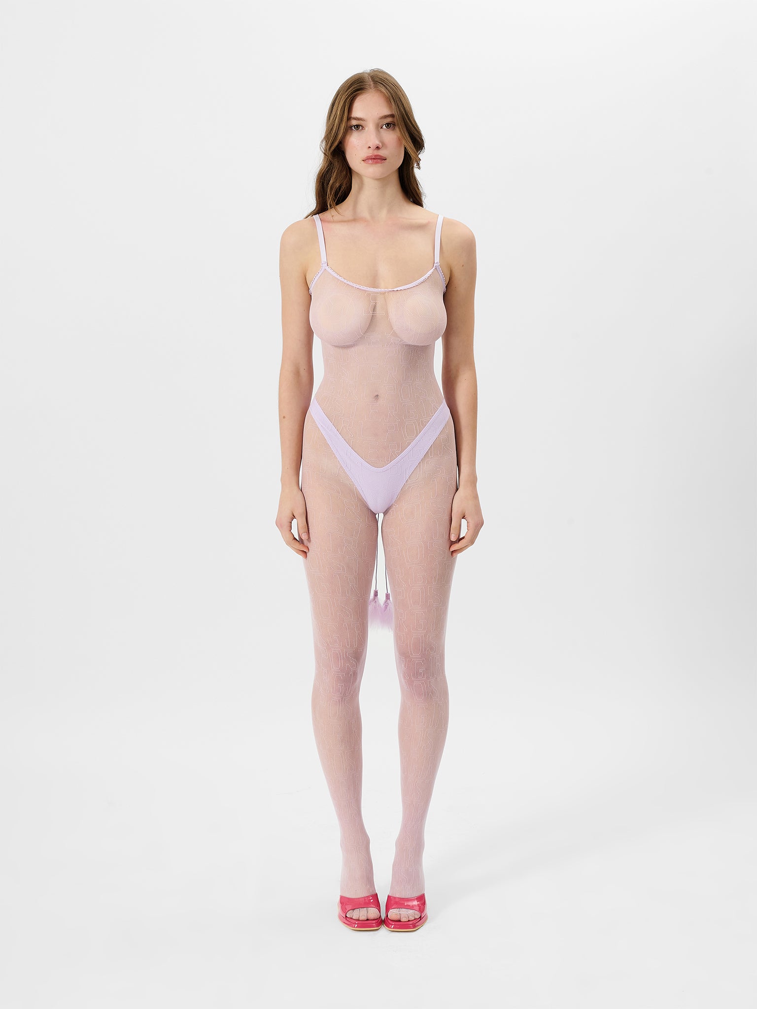 The Minted Jumpsuit includes a matching lilac thong.