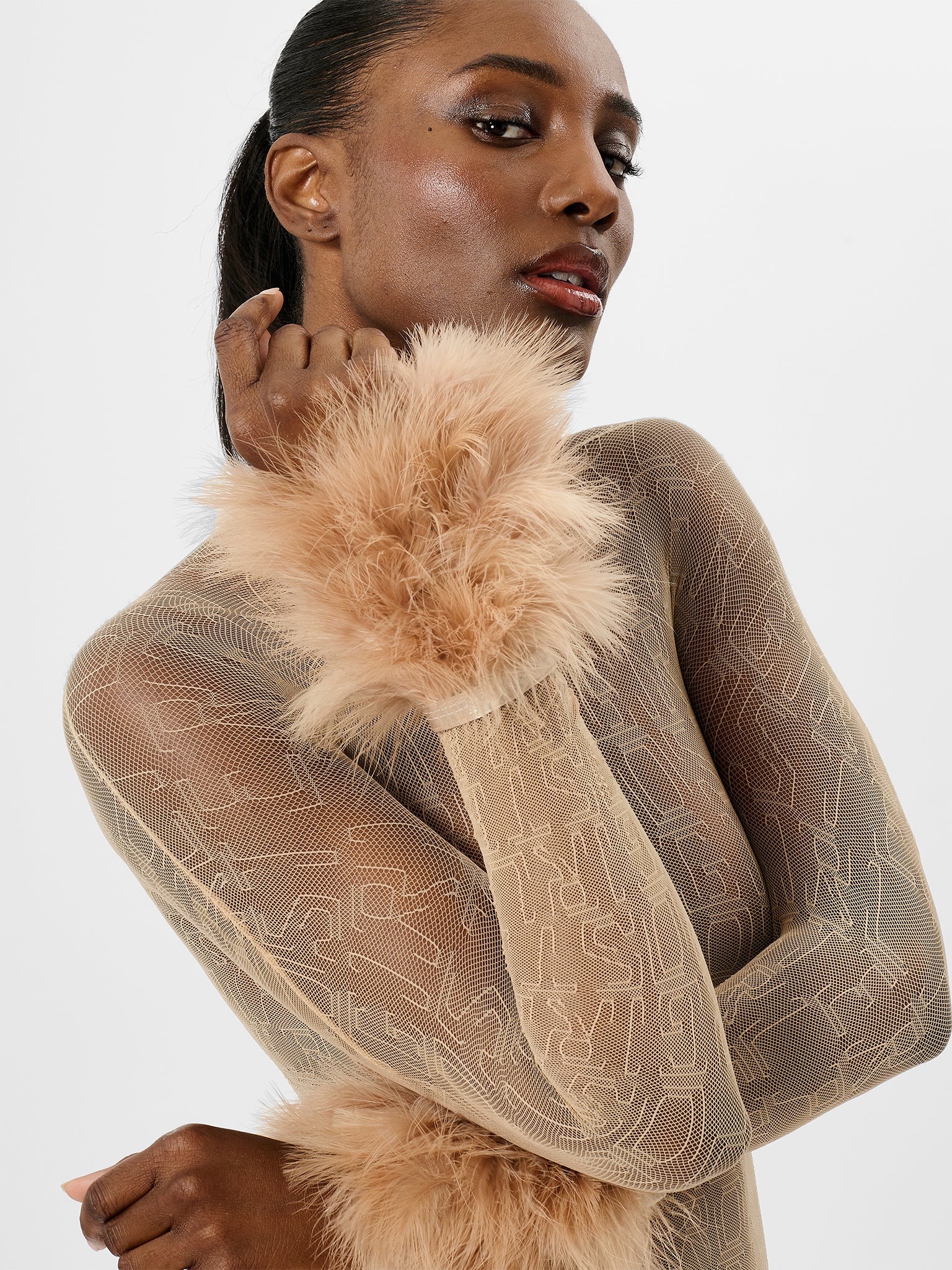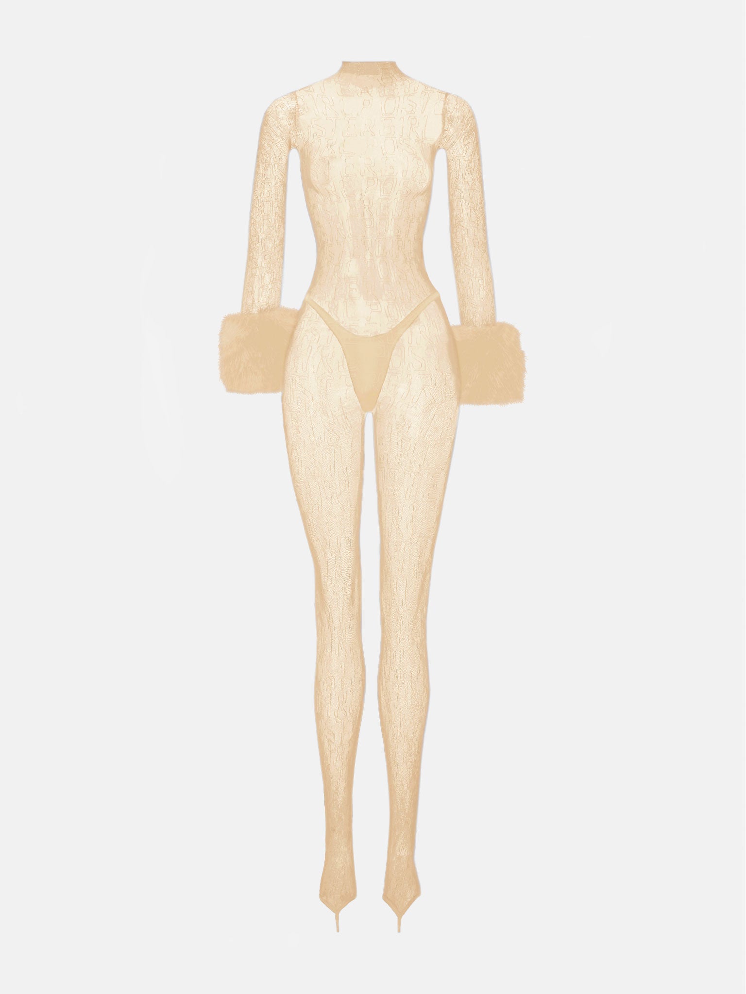 Uncover the enchantment of the Trophy Jumpsuit. Designed in a delicate custom logo translucent beige lace, this sheer jumpsuit features detachable marabou feather wrist cuffs and feet stirrups to elongate the legs. We recommend styling with our Niparon Premium Nipple Covers.