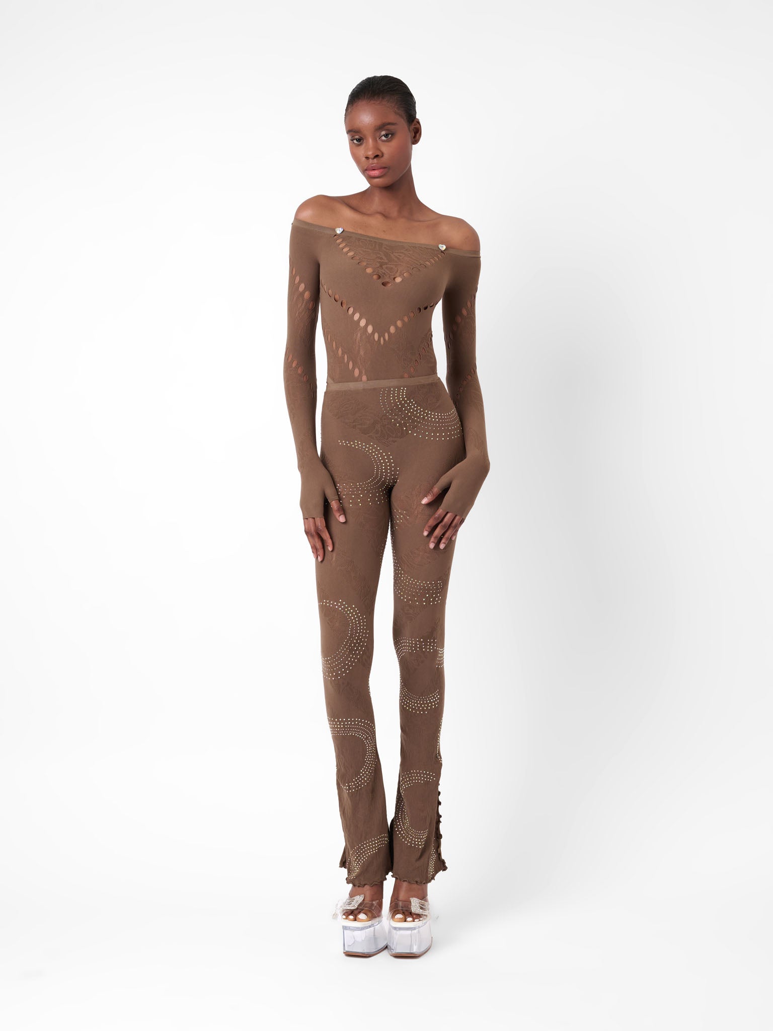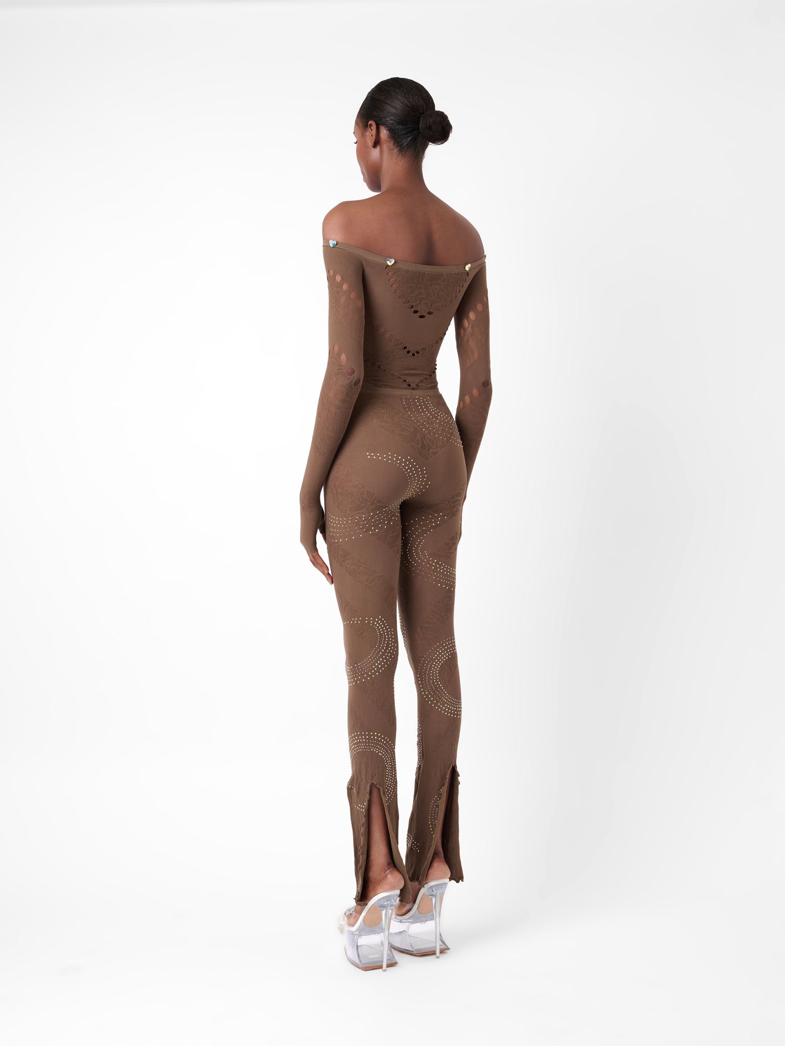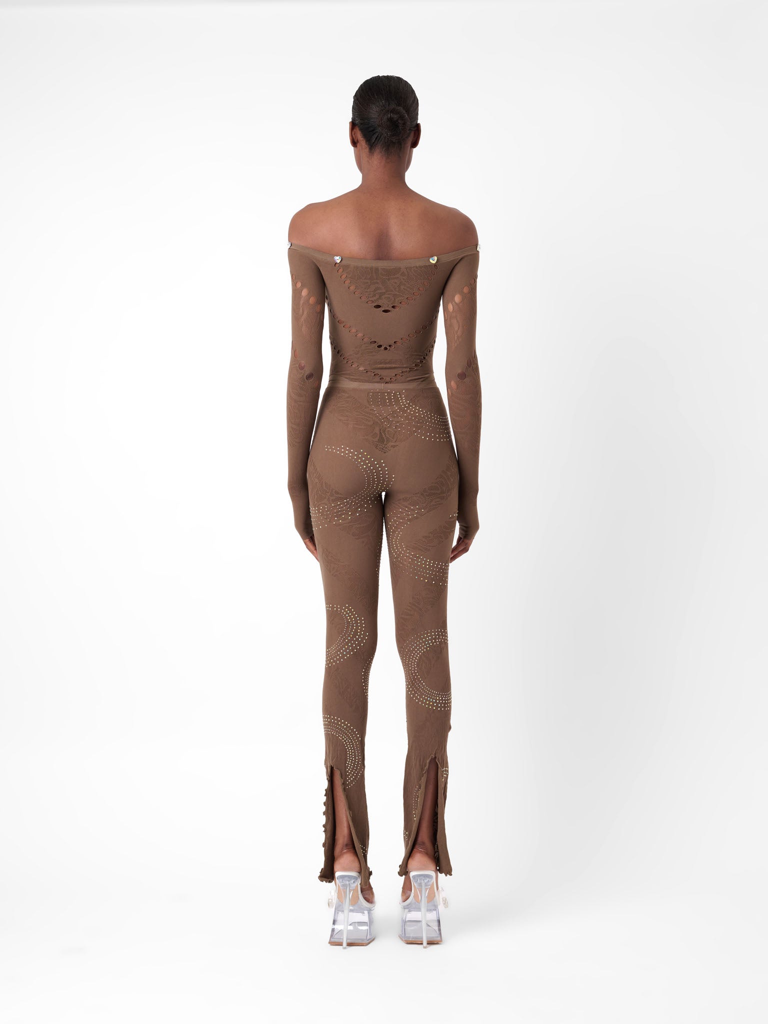 The Maia Pants have been uniquely designed with asymmetrical space panelling and a slim fit through the thighs before falling to flared lettuce hems. These versatile leggings feature contrasting lace swirls and opaque textures and clusters of iridescent rhinestones. Pair with the Nikita Top & Glass Slippers for the complete look.