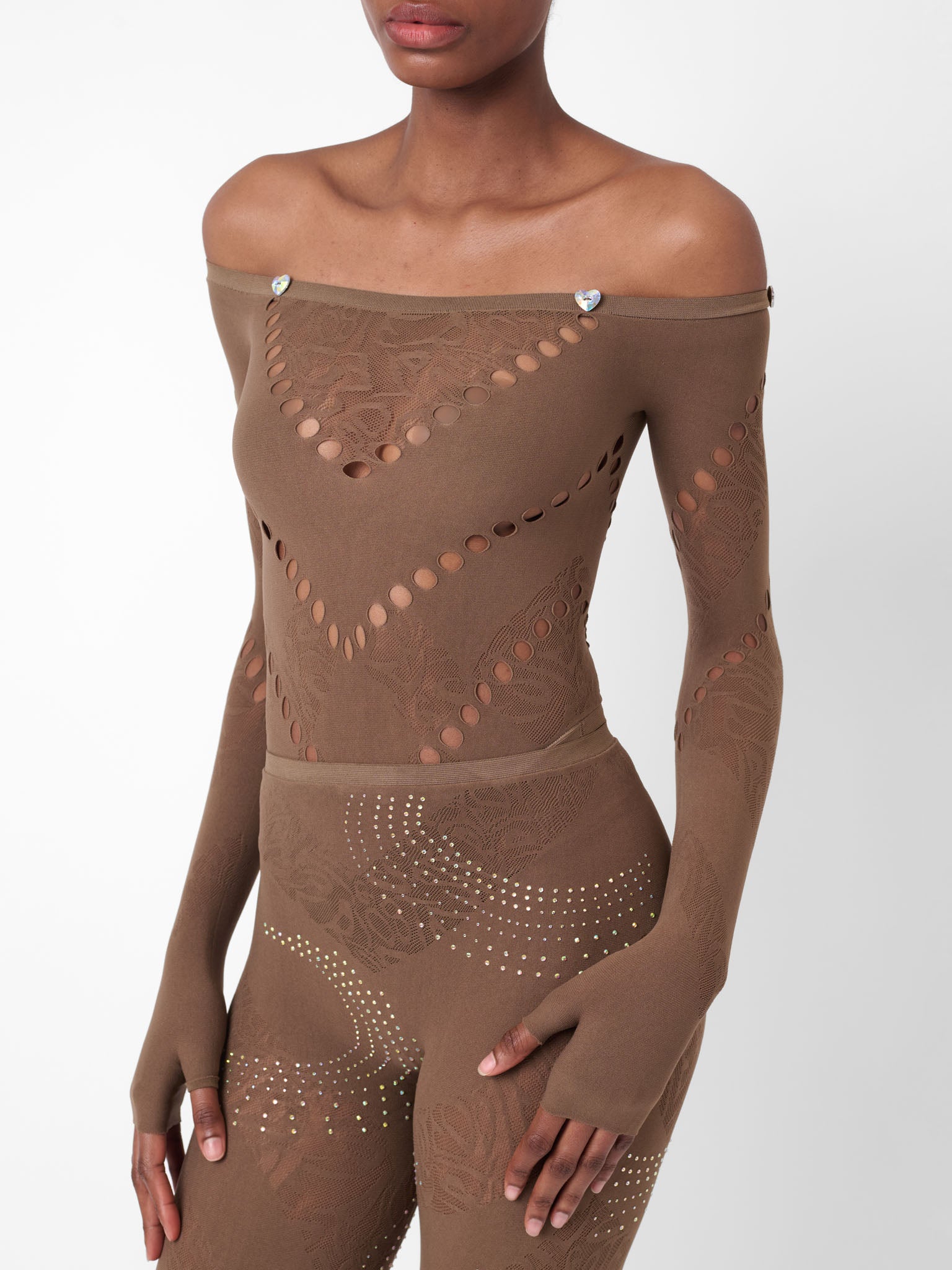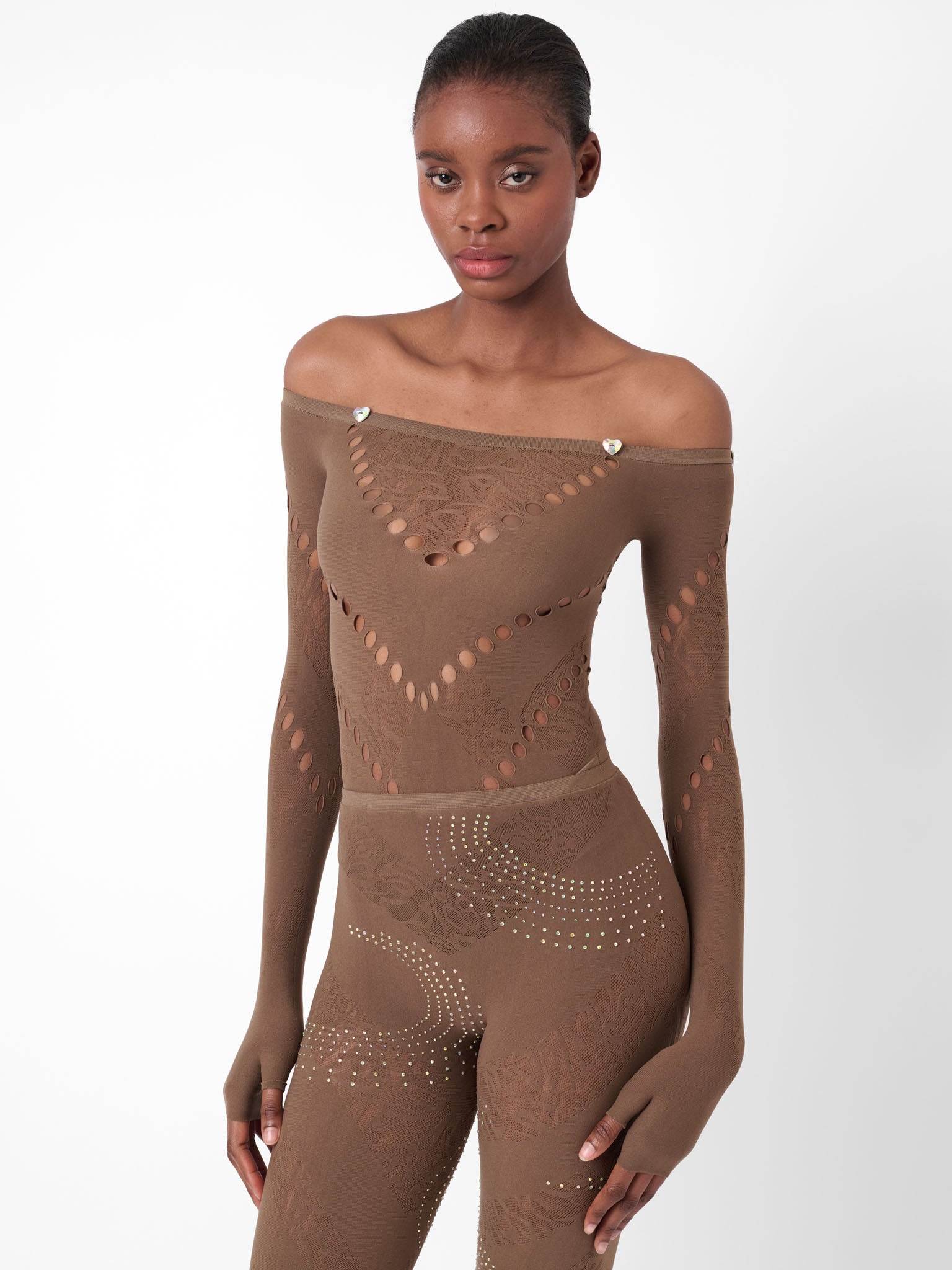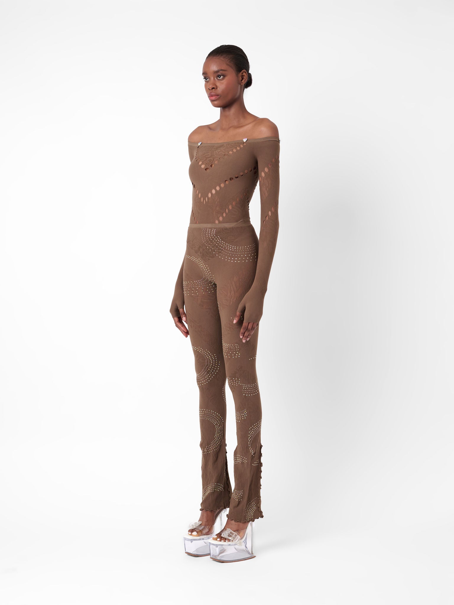 The Maia Pants have been uniquely designed with asymmetrical space panelling and a slim fit through the thighs before falling to flared lettuce hems. These versatile leggings feature contrasting lace swirls and opaque textures and clusters of iridescent rhinestones. Pair with the Nikita Top & Glass Slippers for the complete look.