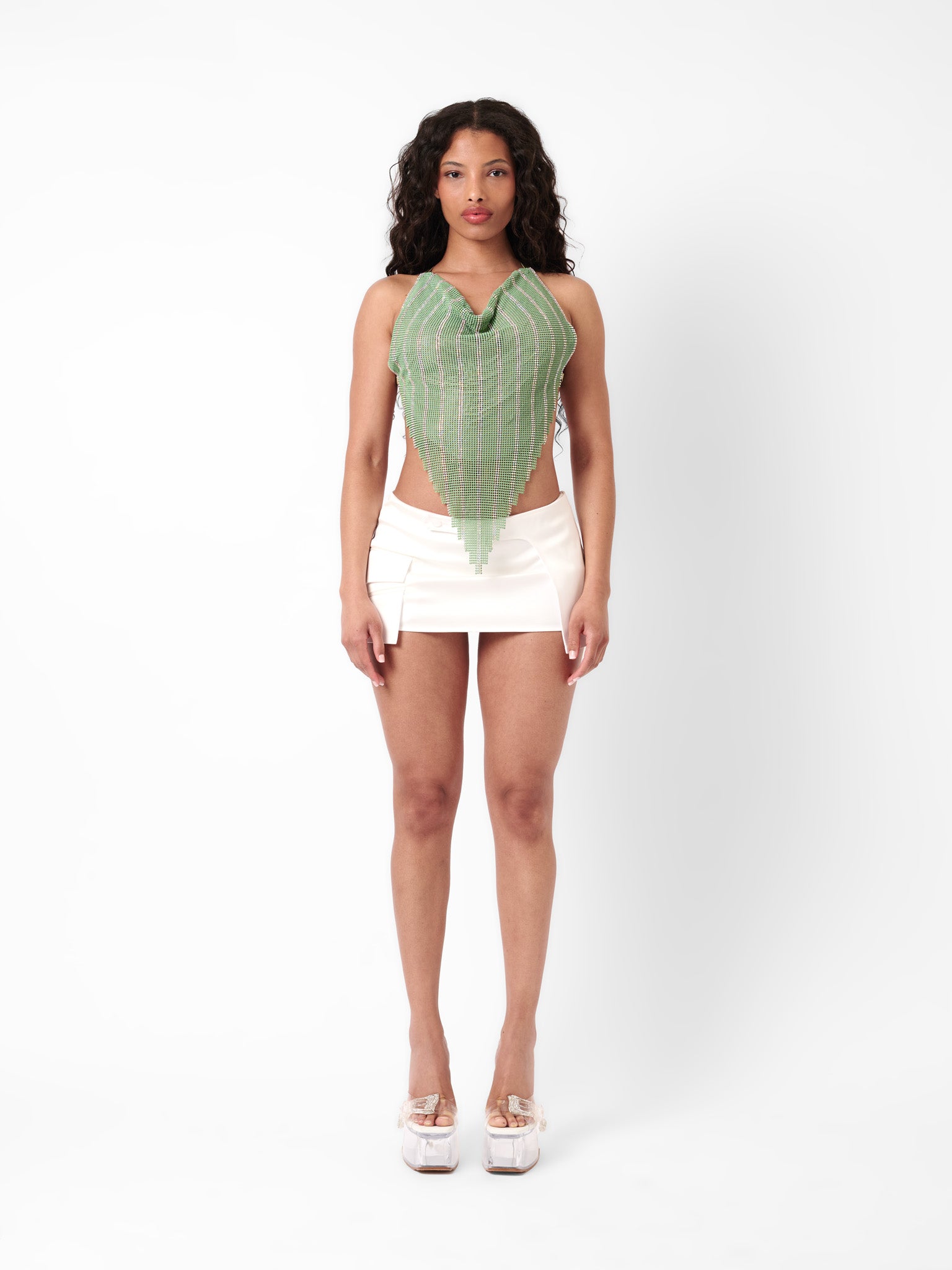 Our iconic Beyan top is back due to popular demand in an exclusive new striped chainmail. Crafted from a matte green chainmail with rhinestone stripe detailing, our intricate Beyan top features a high cowl drape neckline and adjustable cross over back straps with heart sliders. Handmade in London with each sheet of chainmail cut, linked and sewn together by hand to achieve the perfect slink.
