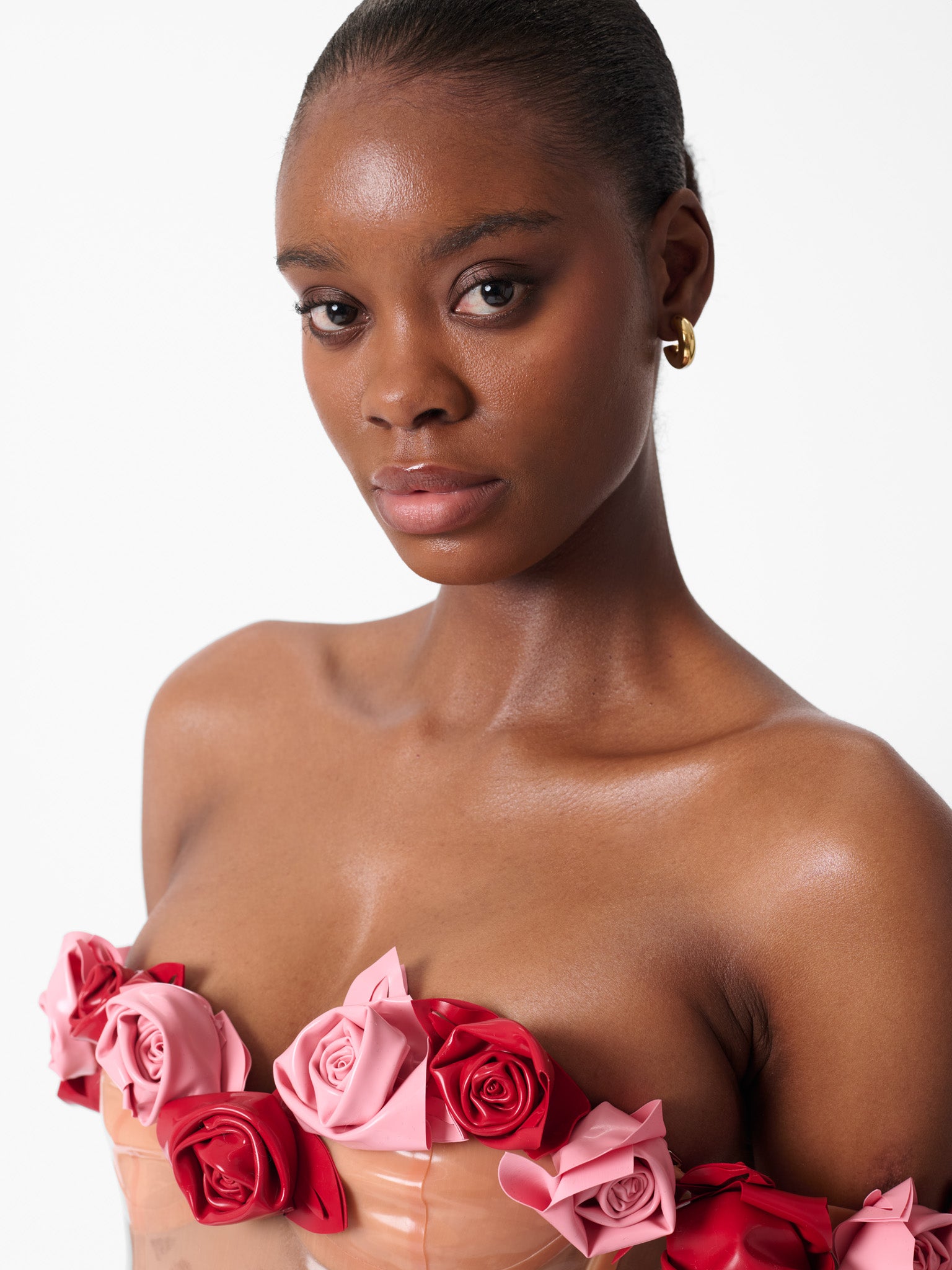 Introducing our exclusive Fantasy Dress. This dreamlike mini dress has been meticulously hand-crafted in our London atelier. Red and pink latex roses bloom from the bust and drape across the shoulders and around a transparent bust and midriff nipped in to bring your fantasy to life. Don't forget to use the latex wipe to give it that extra shine.