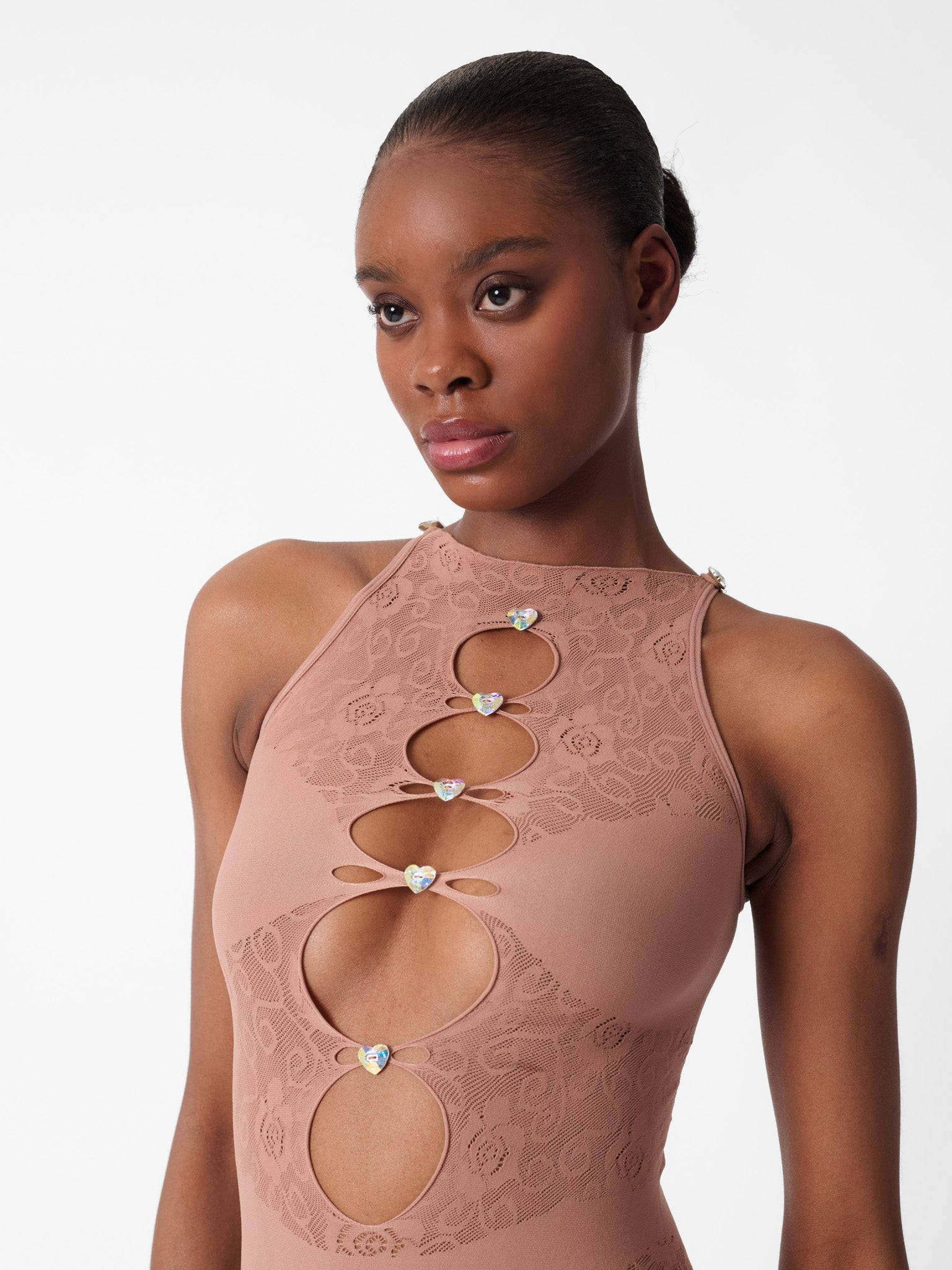 POSTER GIRL's iconic innovative fishnet shapewear features 'psychedelic rose swirl lace' and suctions you in all the right places. With cutout crystal heart embellished details and the brand logo stamped into the lower back and softly spun yarns makes for maximum comfort.