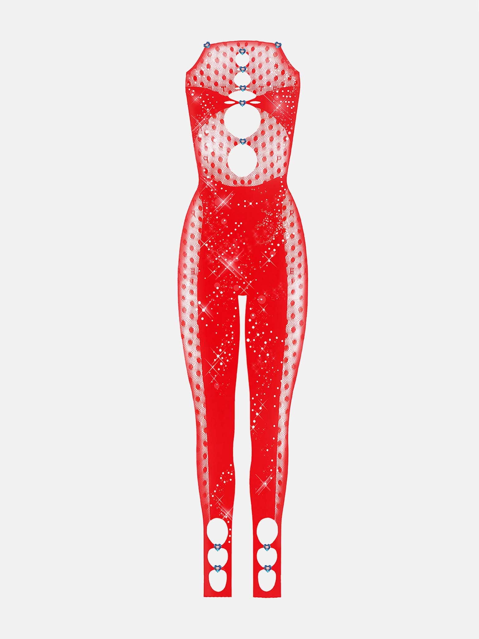 Murmurations of iridescent rhinestones swarm front & back, iconic cutout peep holes descend on the bust & legs, and our signature suctioning shapewear sweeps your curves to perfection.