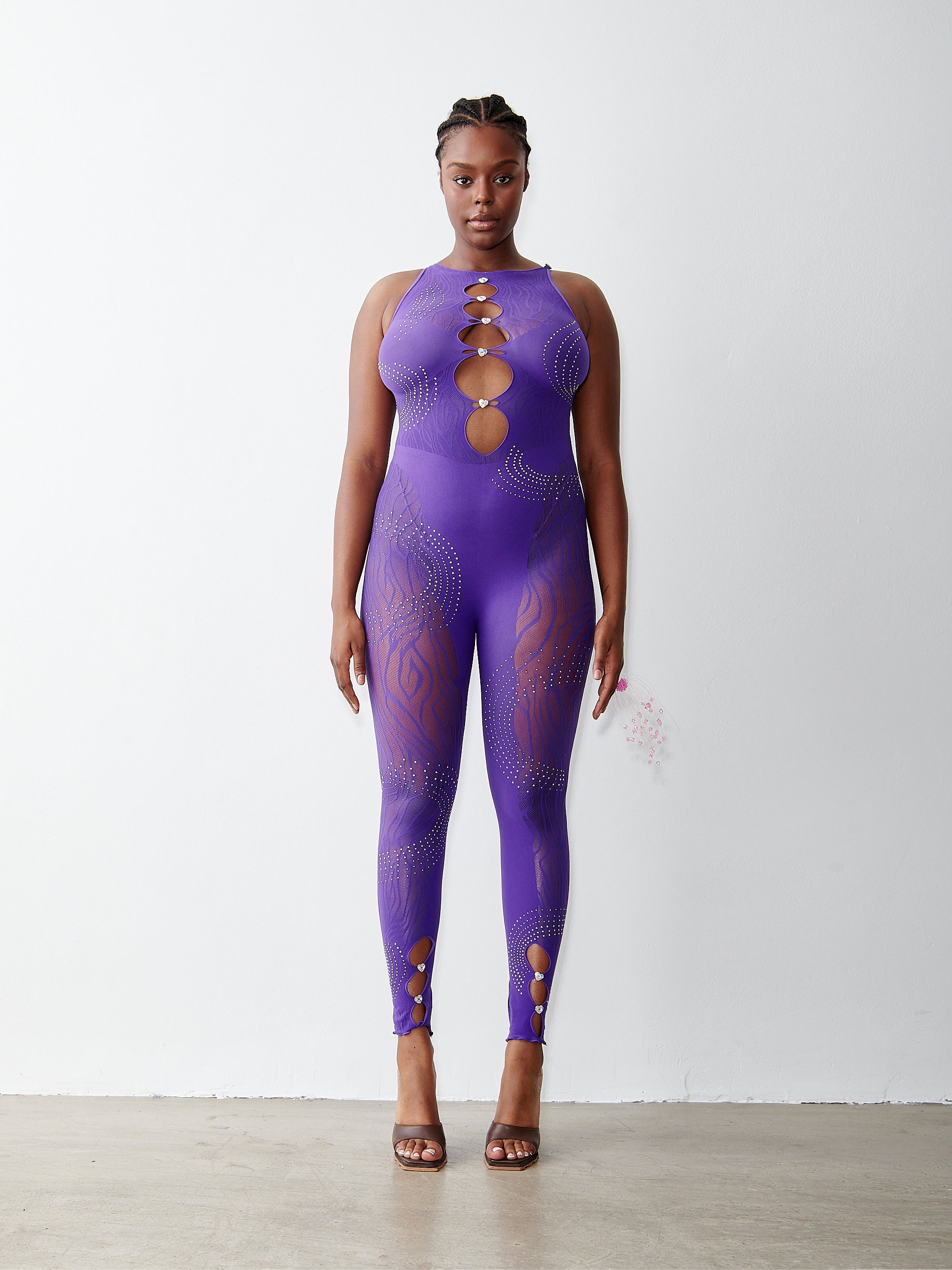 Murmurations of iridescent rhinestones swarm front & back, iconic cutout peep holes descend on the bust & legs, and our signature suctioning shapewear sweeps your curves to perfection.