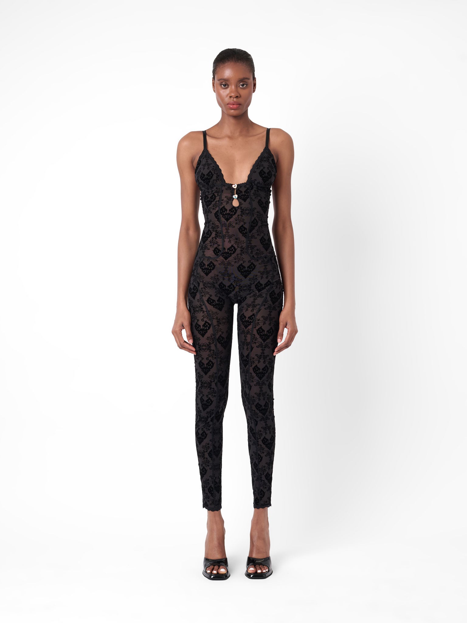 The Scarlett corselette jumpsuit is back due to popular demand. Designed for the perfect fit; constructed with a four way stretch, shape control and semi sheer coverage. Inspired by luxurious lingerie, featuring our infamous cut-out heart crystal details, plush adjustable bra straps and our brand new custom lace print. Take a closer look to see the brand logo subtly placed. Pair with our Glass Slippers for the full look.