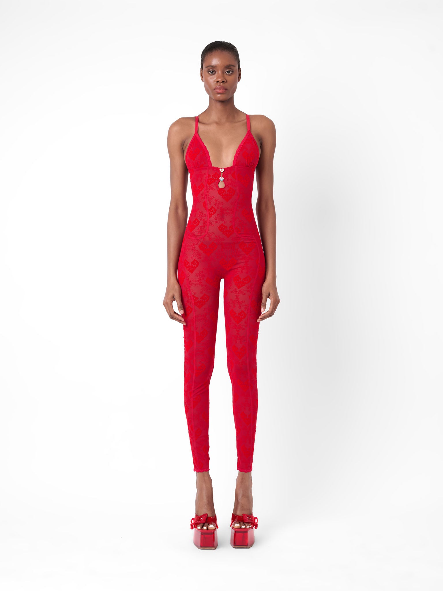 The Scarlett corselette jumpsuit is back due to popular demand, in a new red colourway. Designed for the perfect fit; constructed with a four way stretch, shape control and semi sheer coverage. Inspired by luxurious lingerie, featuring our infamous cut-out heart crystal details, plush adjustable bra straps and our brand new custom lace print. Take a closer look to see the brand logo subtly placed. Pair with our Glass Slippers for the full look.