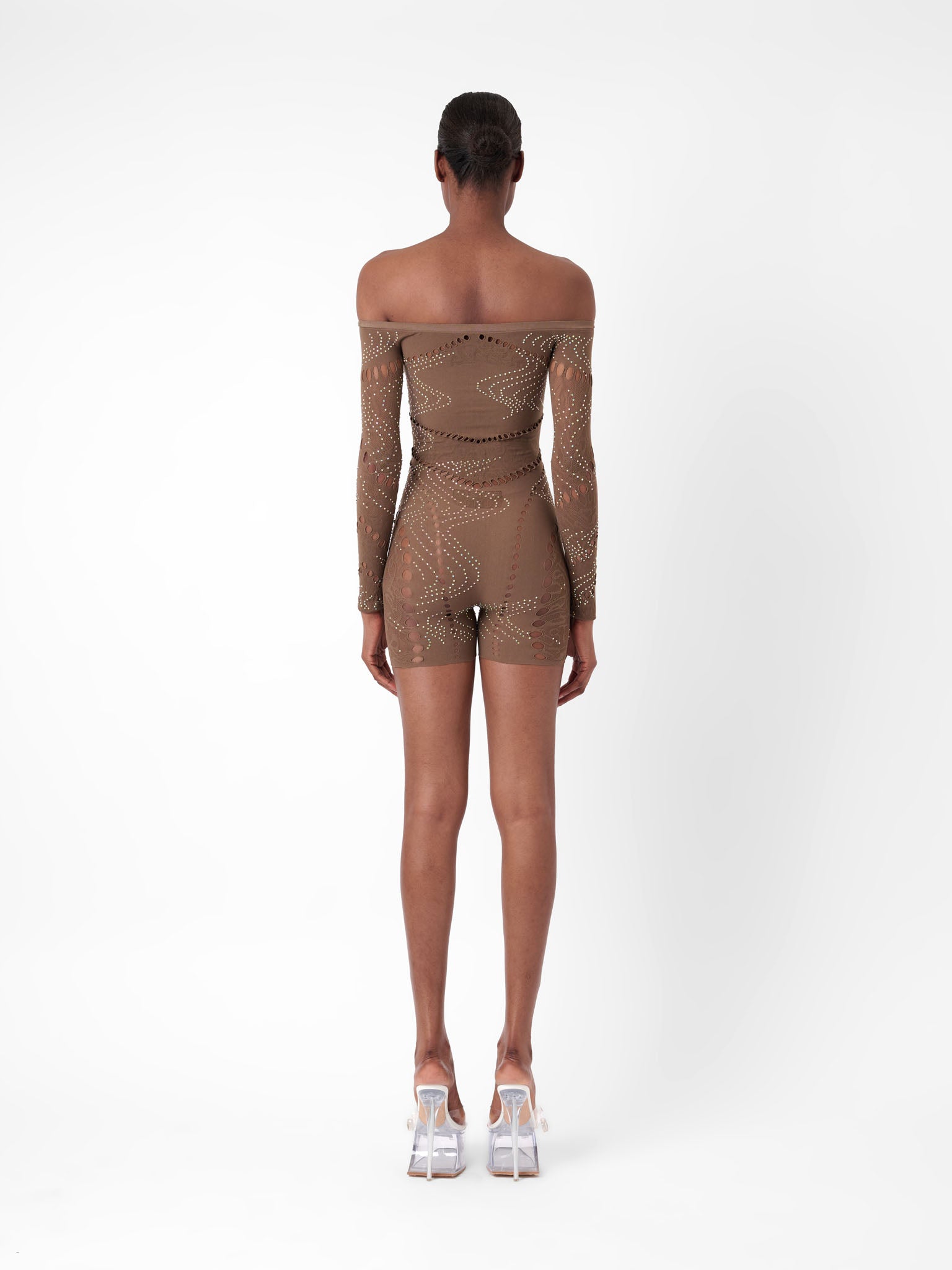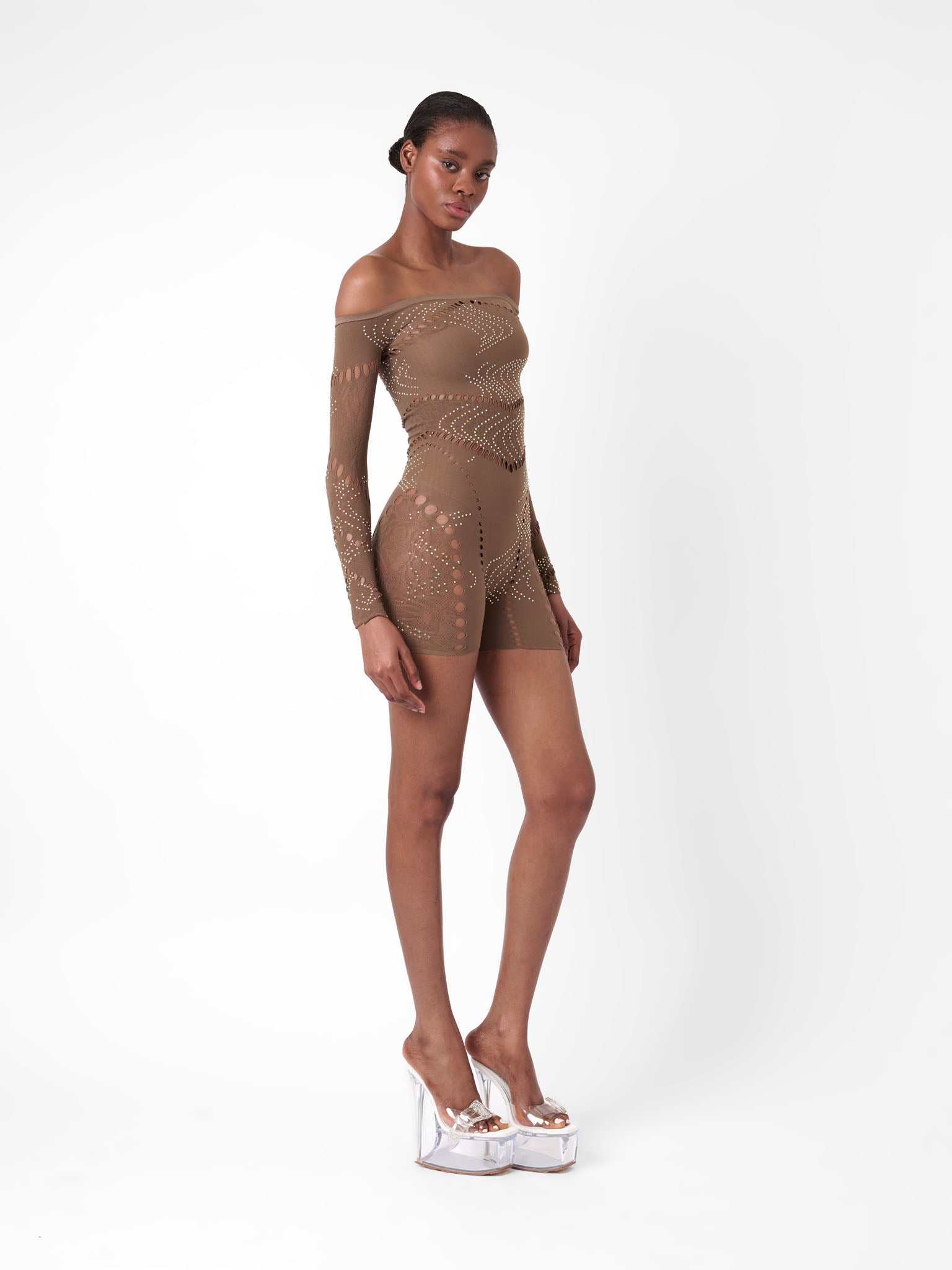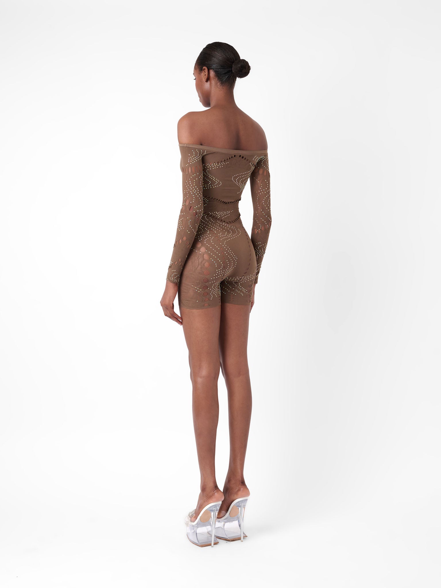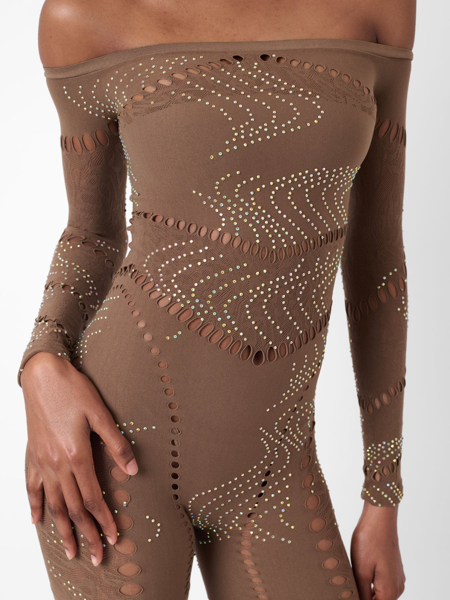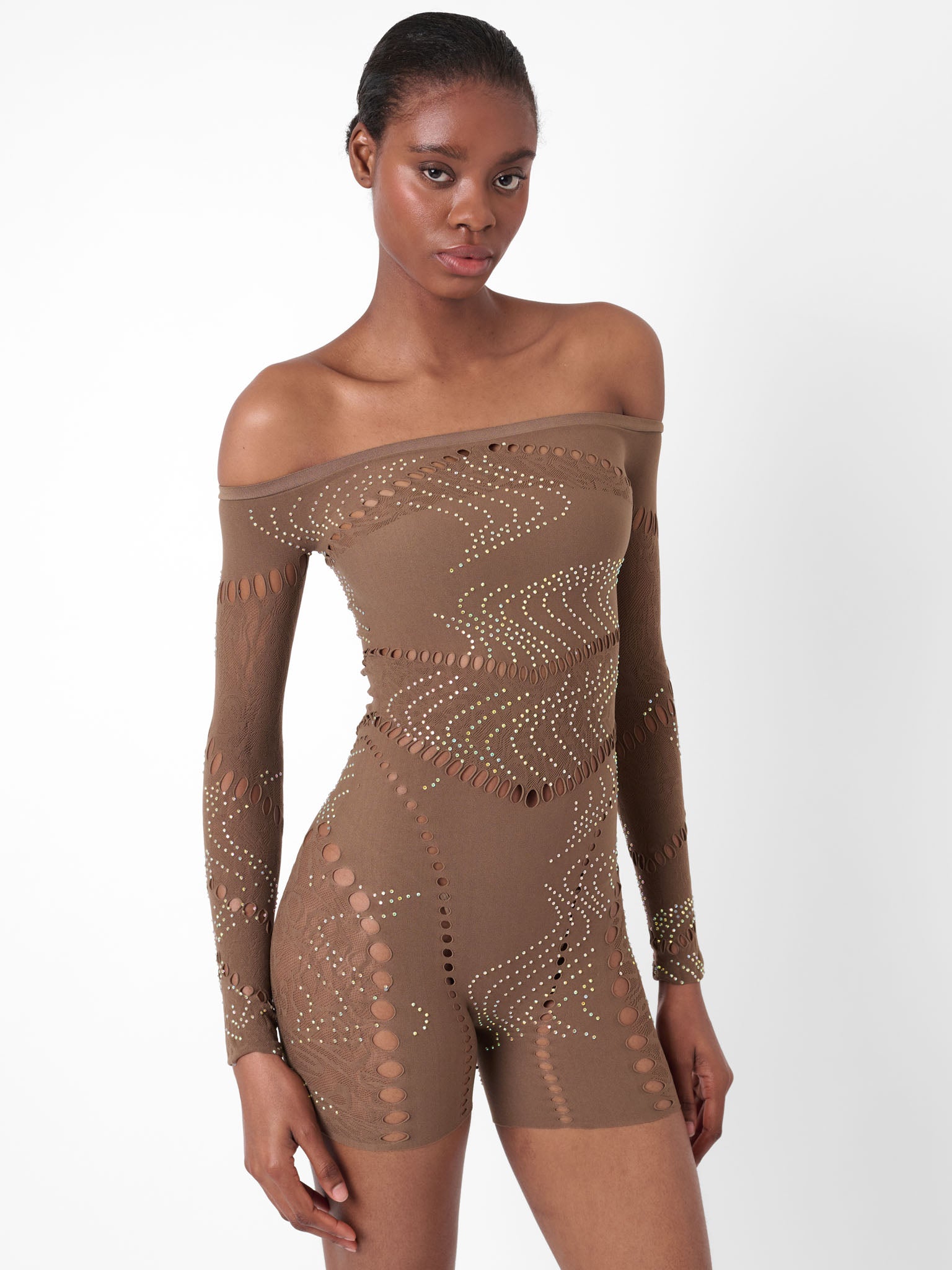 The Sonya Jumpsuit is uniquely designed with asymmetric cut out details across the bust, arms and thighs and contrasting textures. This off the short shoulder jumpsuit also features rhinestones to give it that extra sparkle. Always remember, the brand logo is stamped into the lower back of all shapewear designs as POSTER GIRL's mark of authenticity.