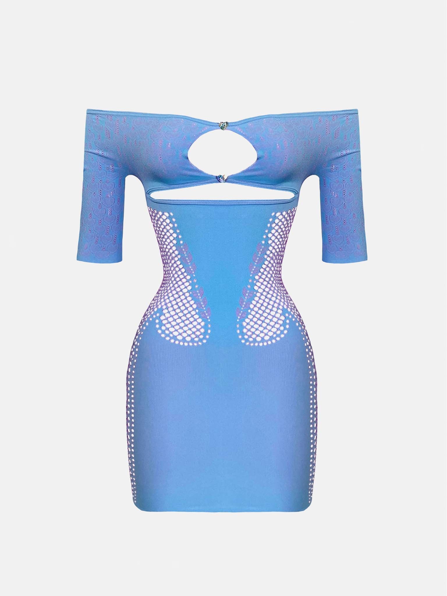 Indulge in luxury and sophistication with the Archer Dress in Crypto Blue. This stunning off the shoulder bodycon dress features heart buttons on the sleeve and a delicate peephole detail. The blue color adds a touch of elegance, while the arrow motif adds a unique and artistic touch. Elevate any occasion with this exclusive dress.
