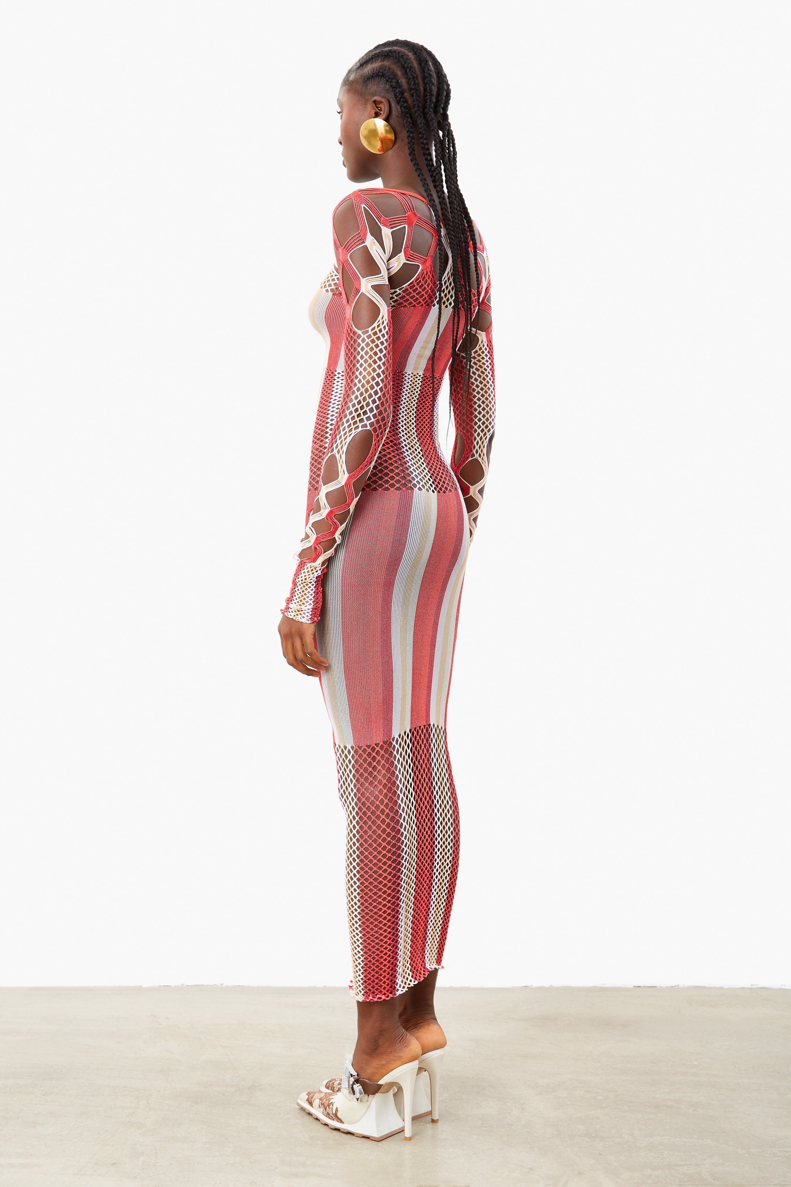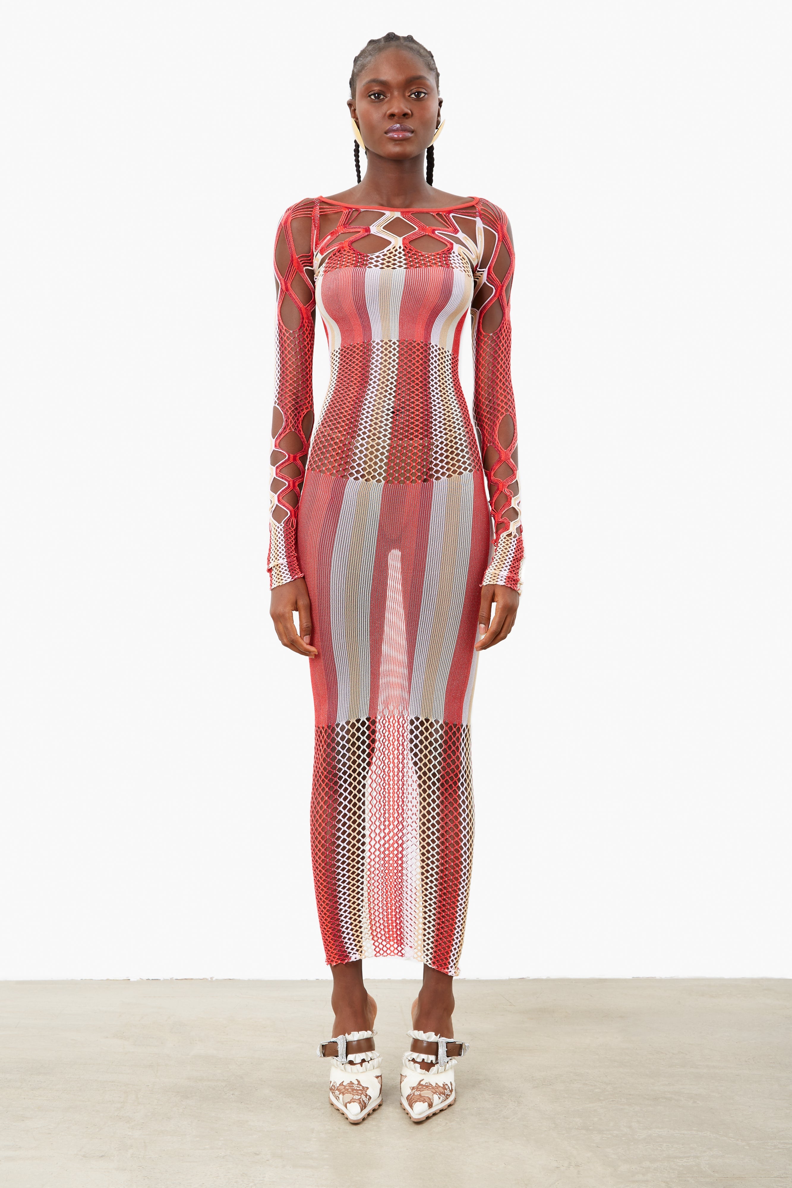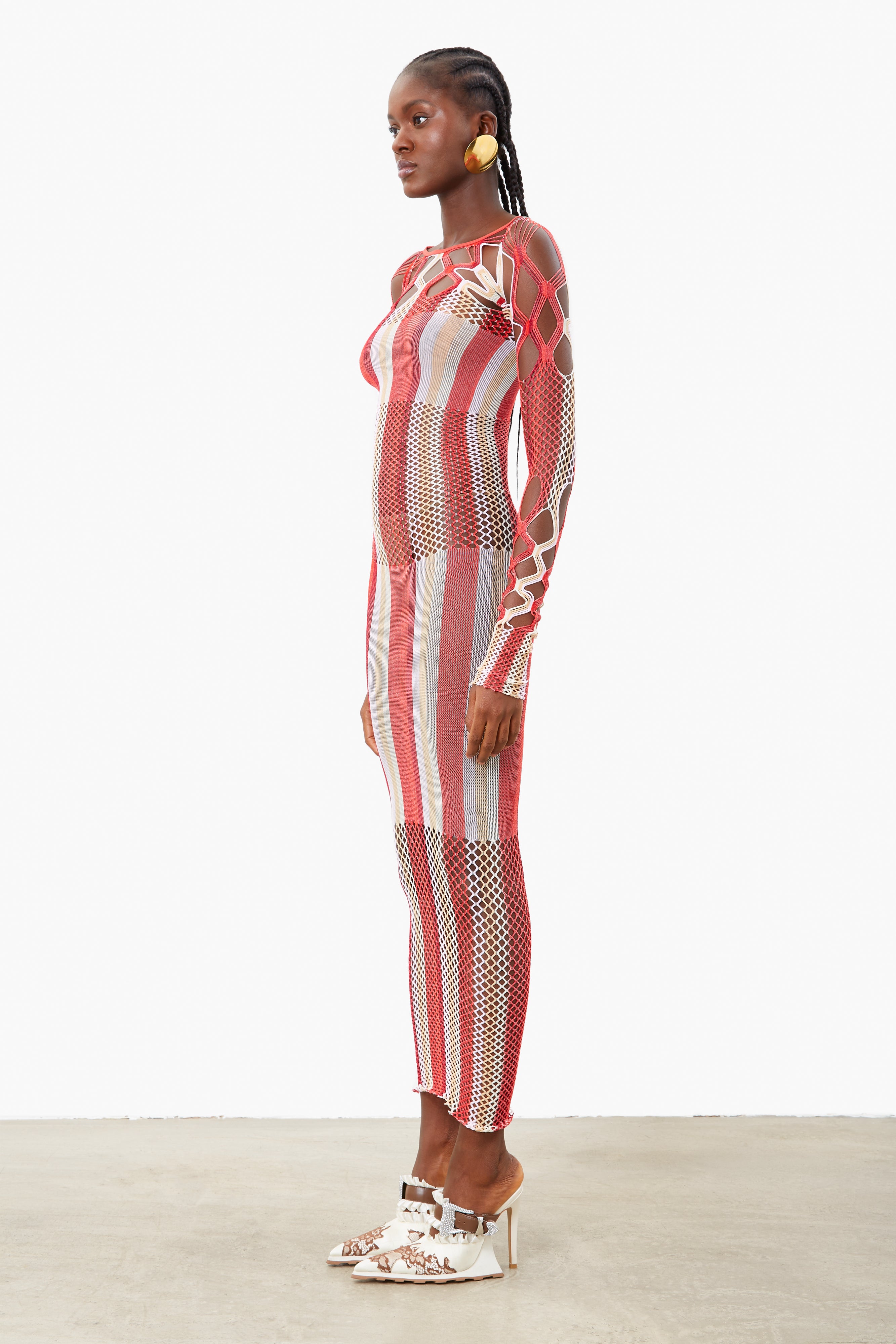 The Koral Maxi Dress is brand new for AW23. Featuring semi sheer stretch shapewear, hand dyed yarns blended together in Oyster and Burgundy stripe and our infamous diamond cut open weave lacing that contours every body to perfection.