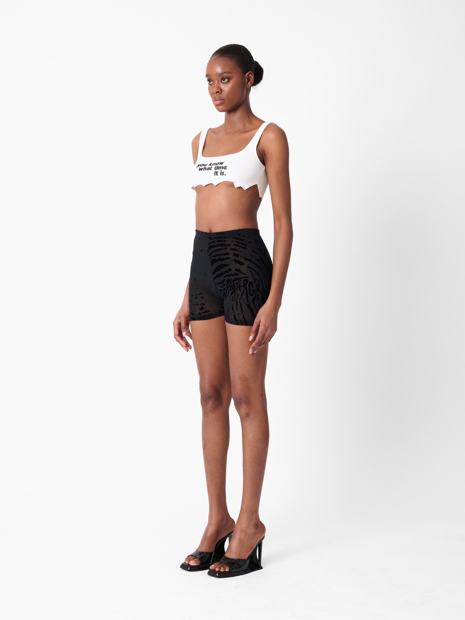 The Knockout Shorts Black Zebra print have been designed for the perfect fit; constructed with a four way stretch, shape control and semi sheer coverage. These mini shorts have been cut from a brand new custom POSTER GIRL sheer logo zebra print fabric and feature a scrunched bum detail to accentuate your derrière. A foundation wardrobe piece, our Knockout shorts can be styled with the Doll Top and layered with one of our outerwear jackets.