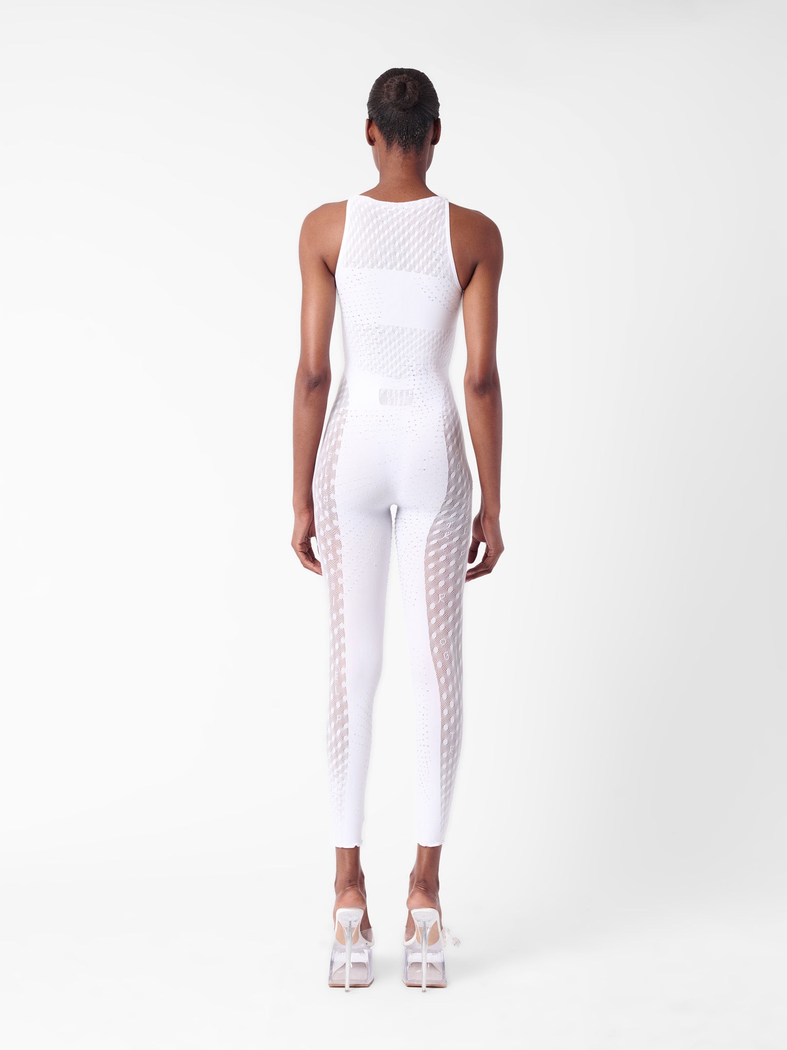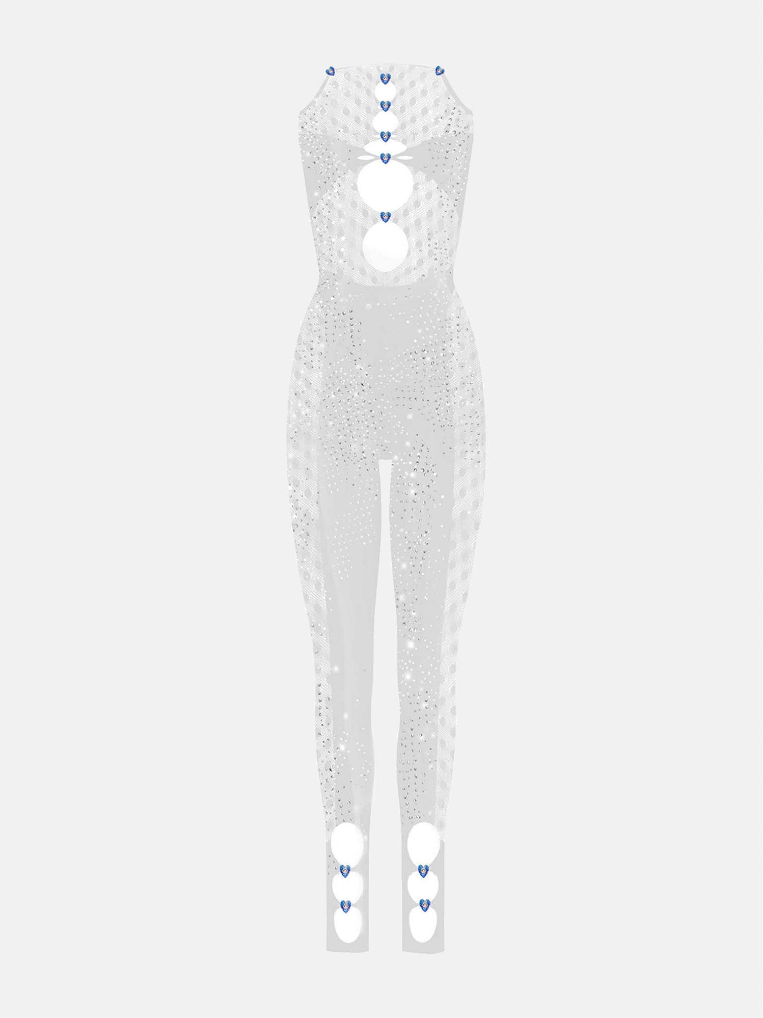 Murmurations of iridescent rhinestones swarm front & back, iconic cutout peep holes descend on the bust & legs, and our signature suctioning shapewear sweeps your curves to perfection.