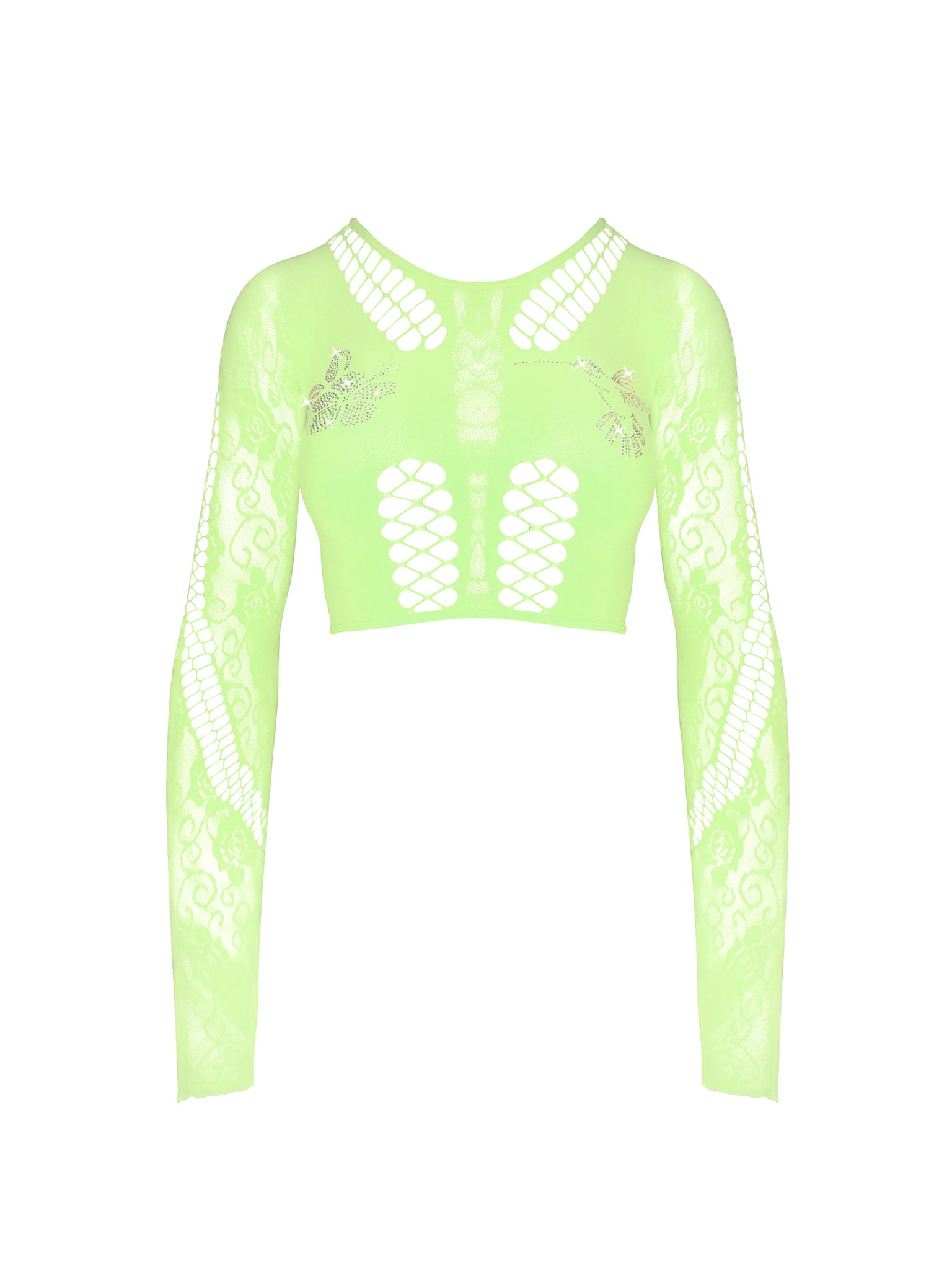 The Harlow top is crafted for a close, figure-hugging fit with a multitude of signature skin-baring cutouts. Rhinestones take the form of a hibiscus flower and hummingbird, evoking high-octane glamour to stunning effect.