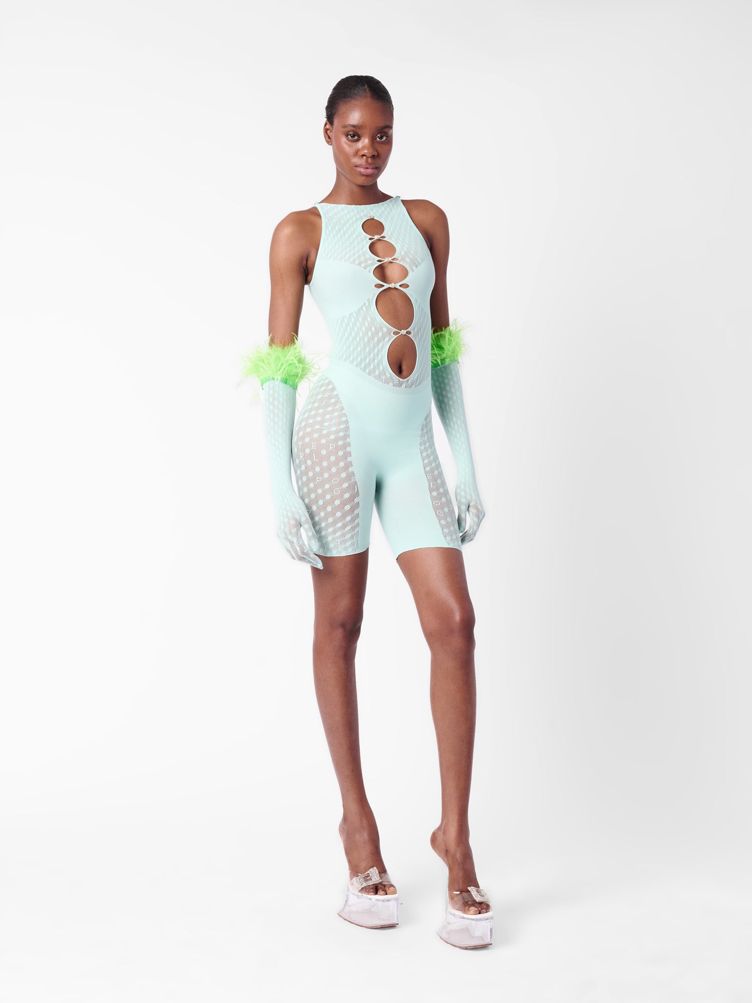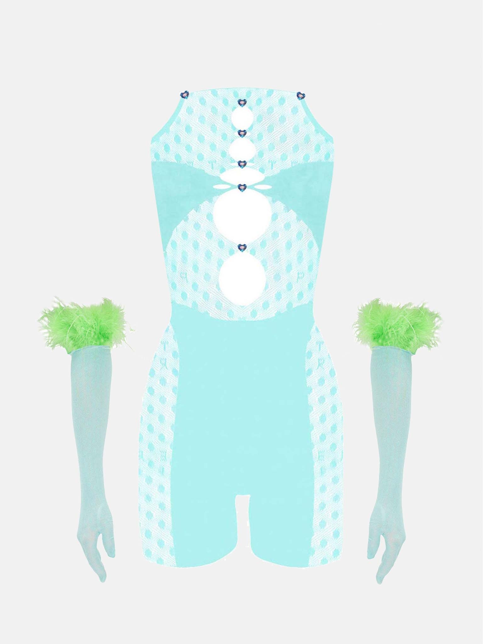 Worn iconically by Kylie Jenner; The Jetta Jumpsuit has become a must-have for your wardrobe. Signature cutout crystal heart embellishments flatter you to perfection, and its figure hugging silhouette is highlighted within the logo polkadot lace. Combined with the Gwenevere Gloves for the complete look.