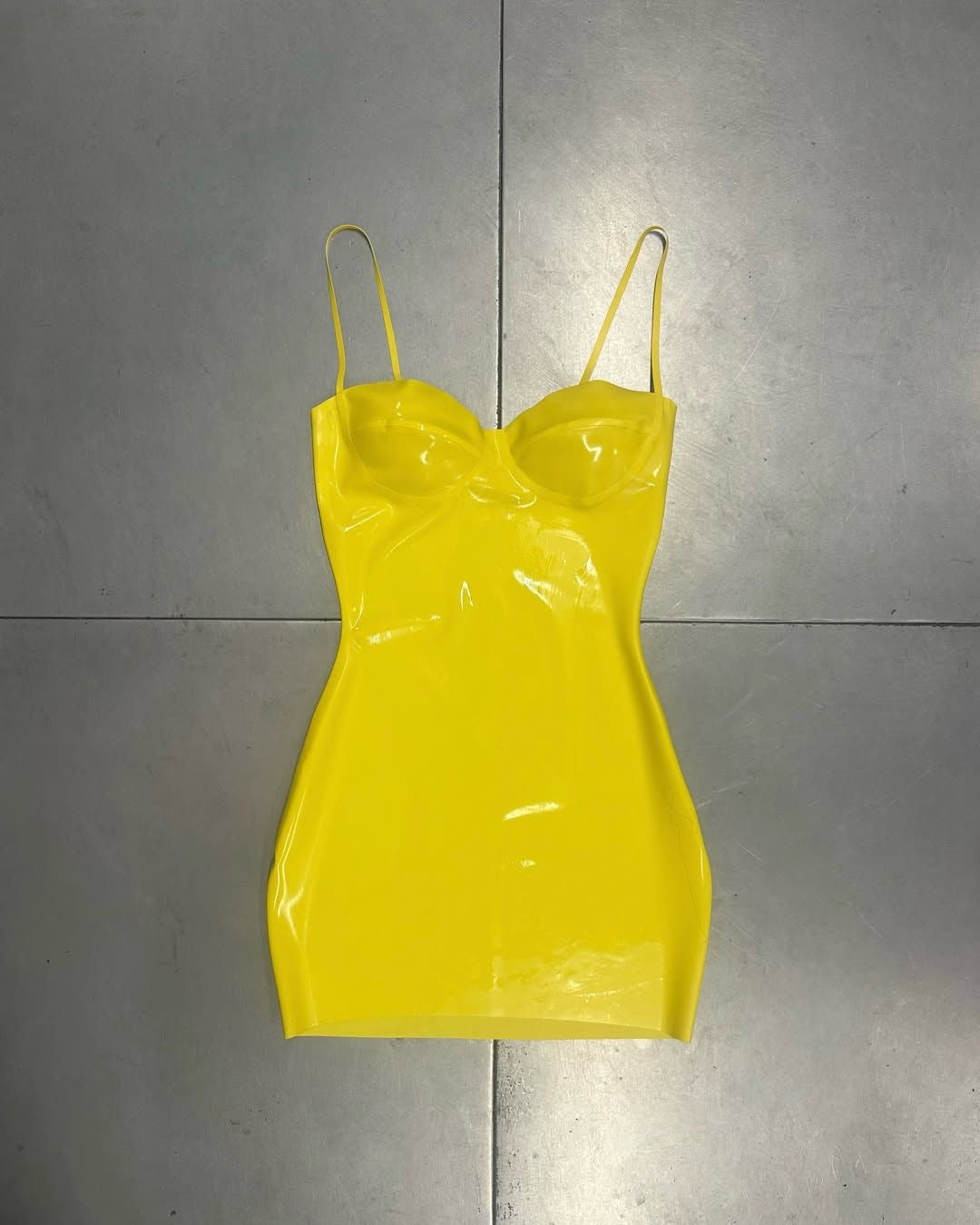 This is a sleek, body-contouring mini dress crafted from glossy latex in a off white. It features a structured, molded bust that enhances and shapes the silhouette, paired with delicate, thin shoulder straps for a minimal, feminine look.