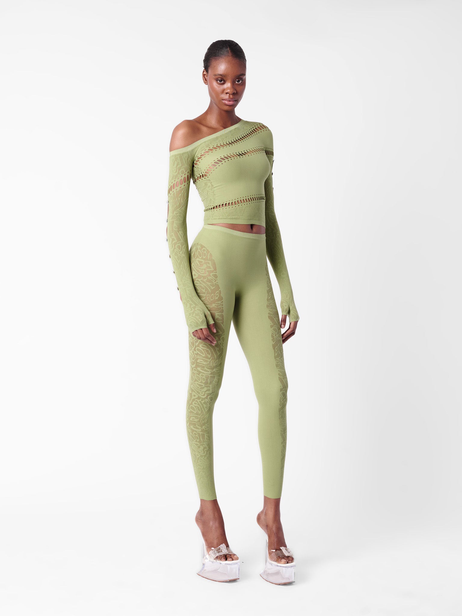Our new Ivy Legging is uniquely designed with floral cut out details and contrasting textures. Pairs perfectly with our Ivy Top in Sativa