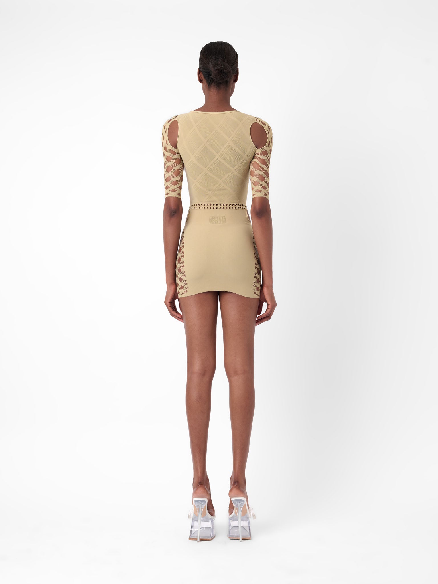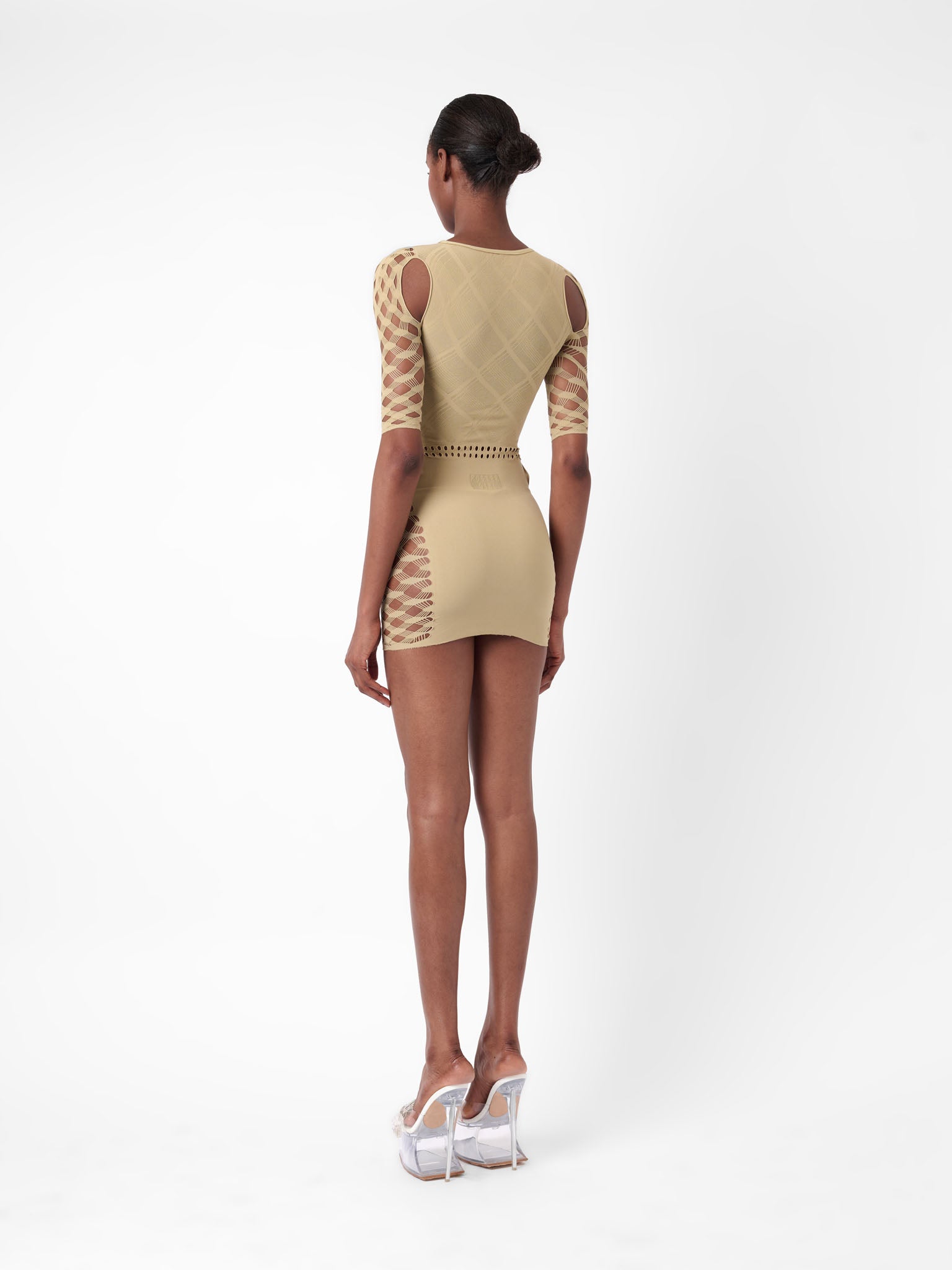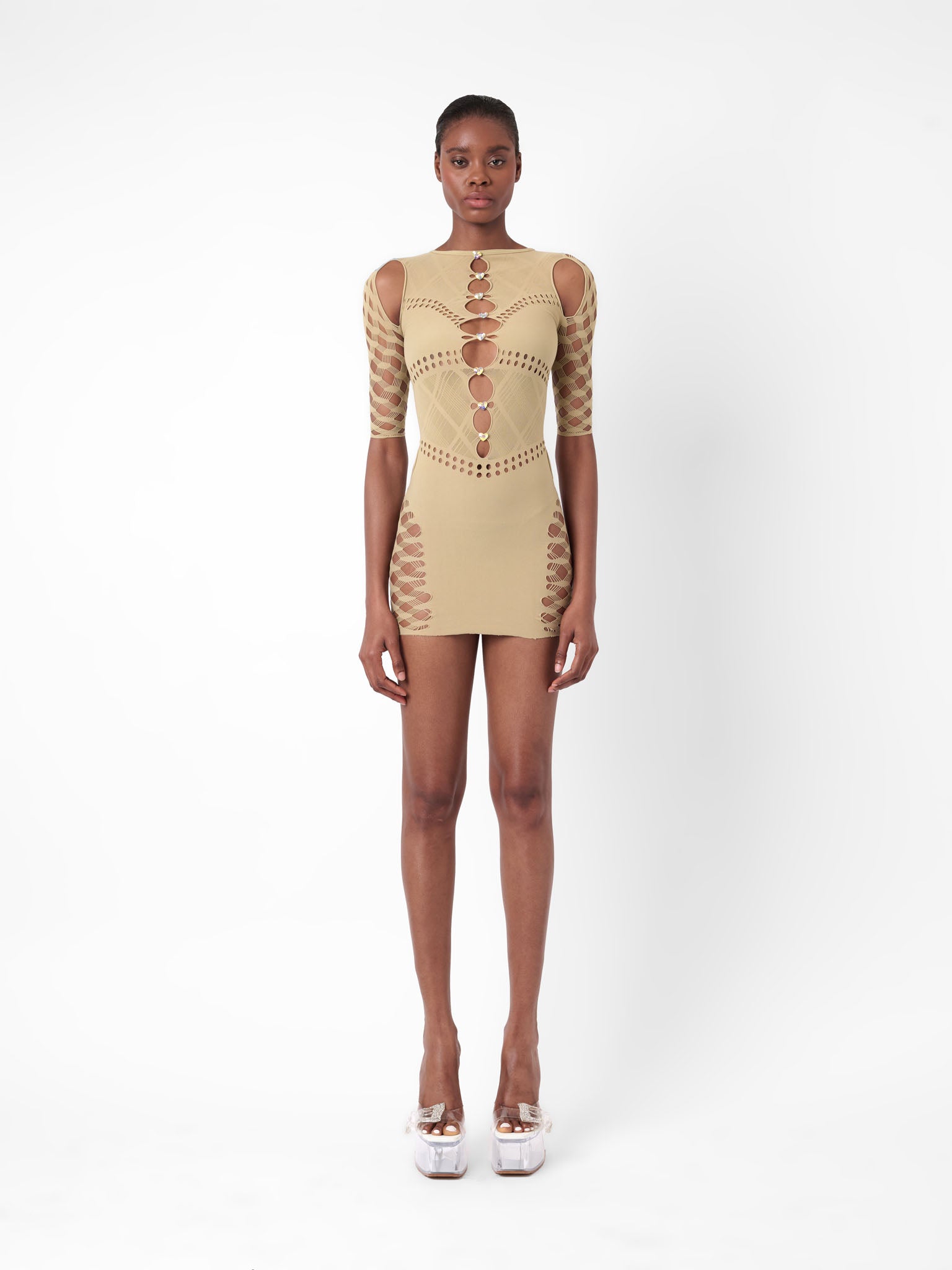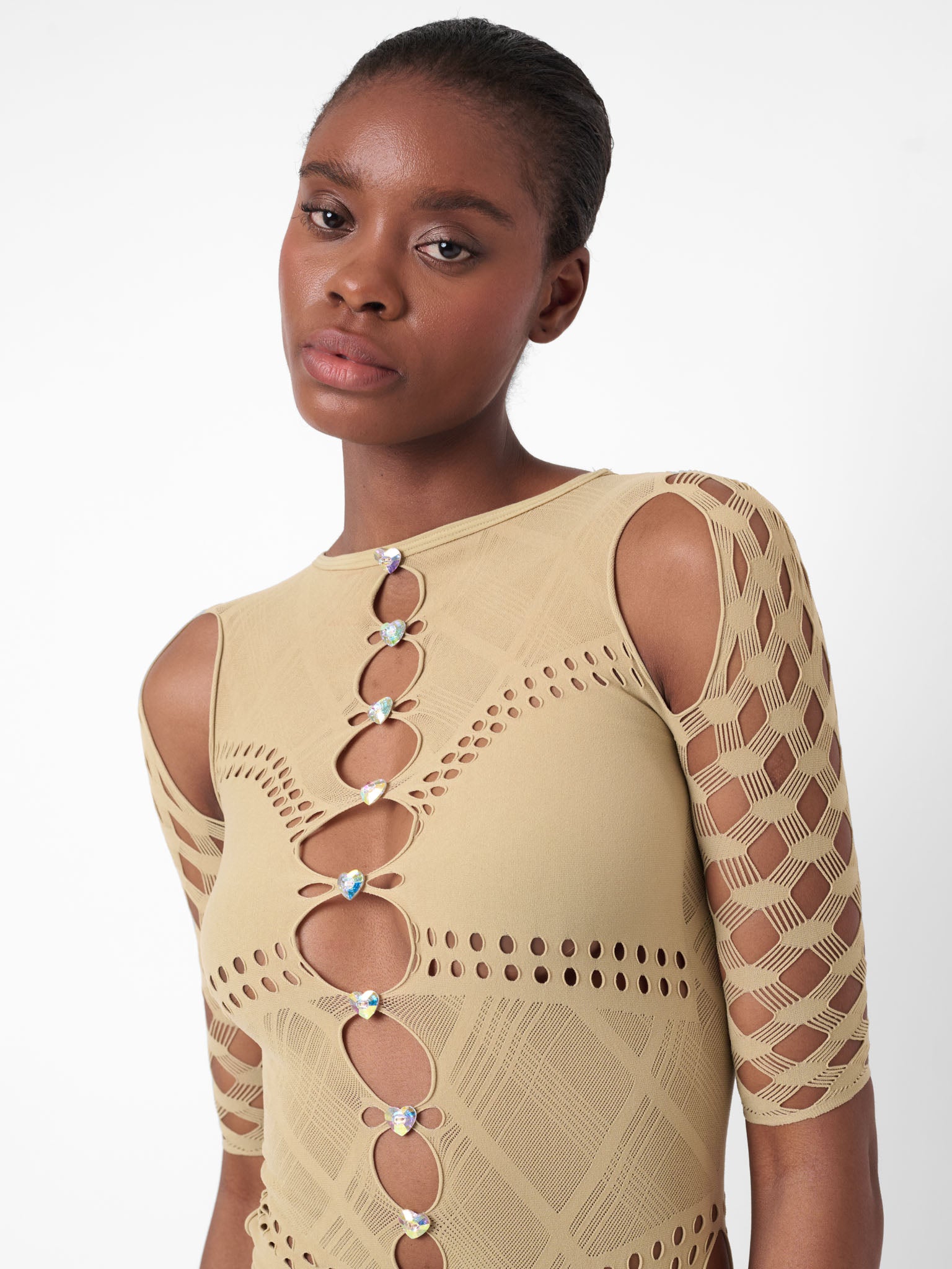 The Lola Dress has been intricately designed with asymmetric cut out details and contrasting woven fishnet texture panels. This bodycon mini dress features rhinestone heart buttons up the center top of the dress. Always remember, the brand logo is stamped into the lower back of all shapewear designs as POSTER GIRL's mark of authenticity. Pair with the Glass Slippers for the complete look.