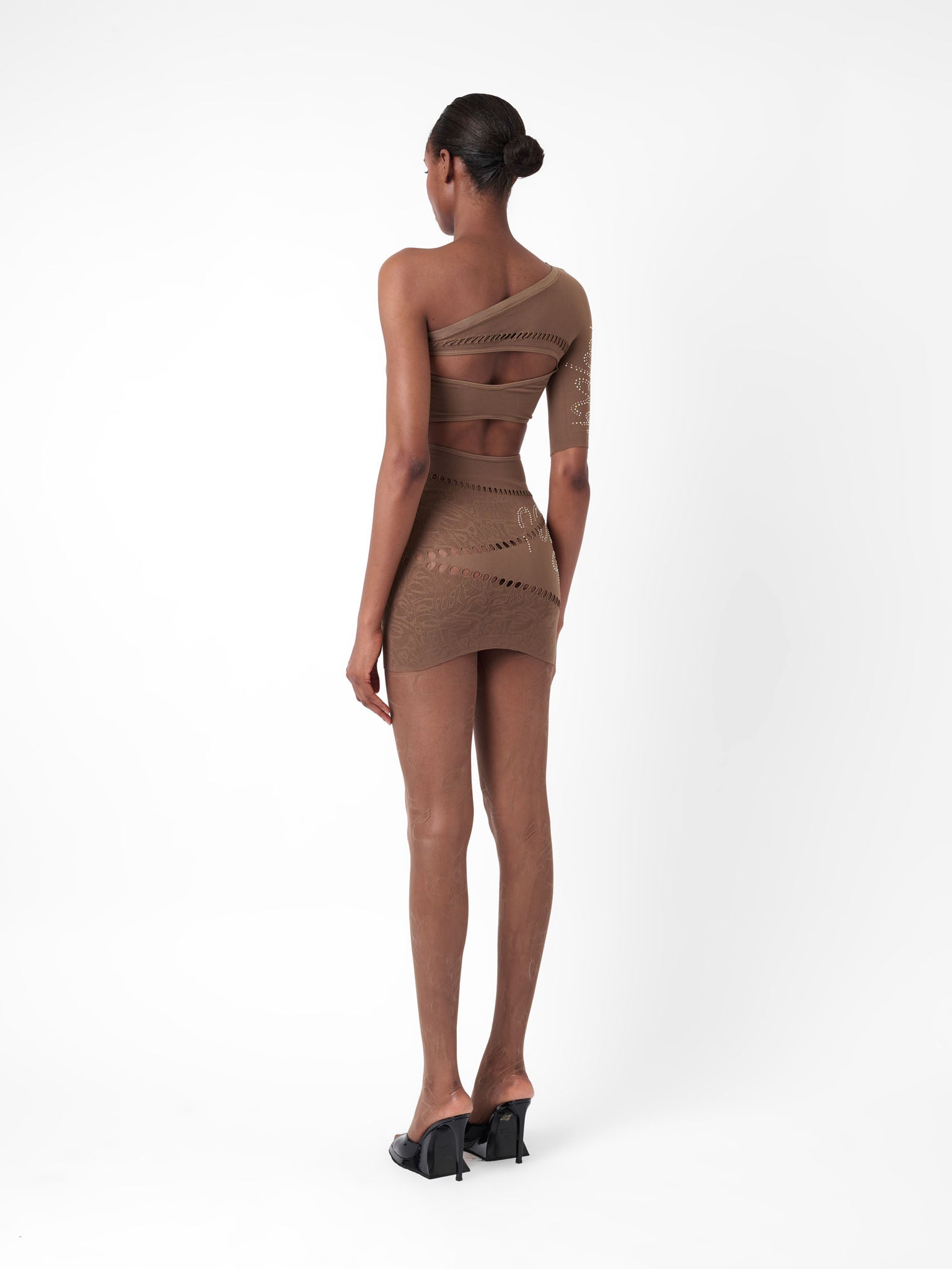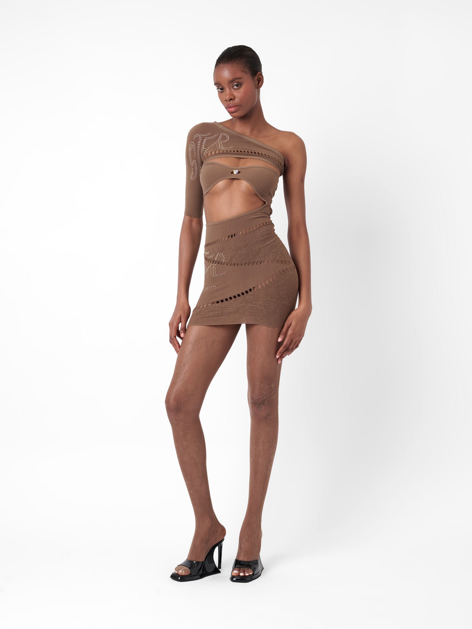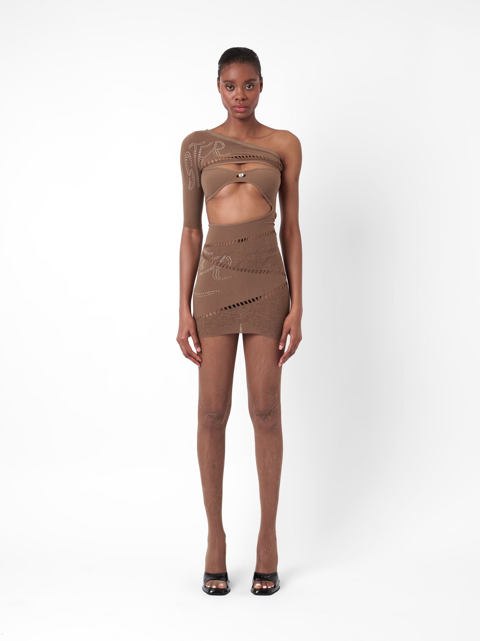The Robin Dress has been uniquely designed with asymmetric cut out details and contrasting lace swirl texture panels. This rhinestone adorned one shoulder mini dress can be styles with our Sage tights or Ursula Mules for the complete look.