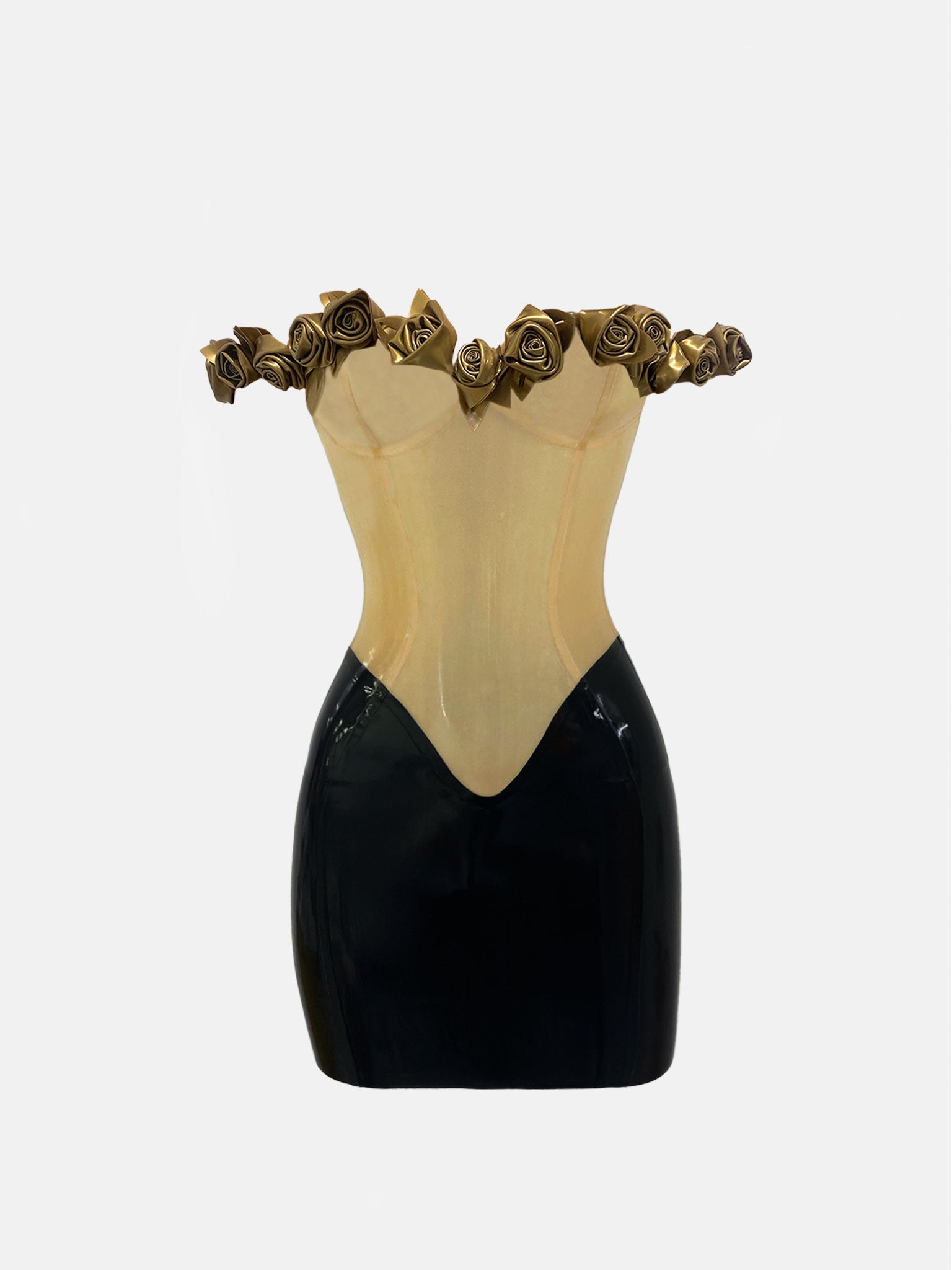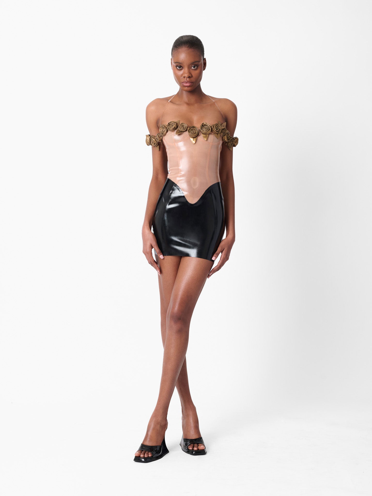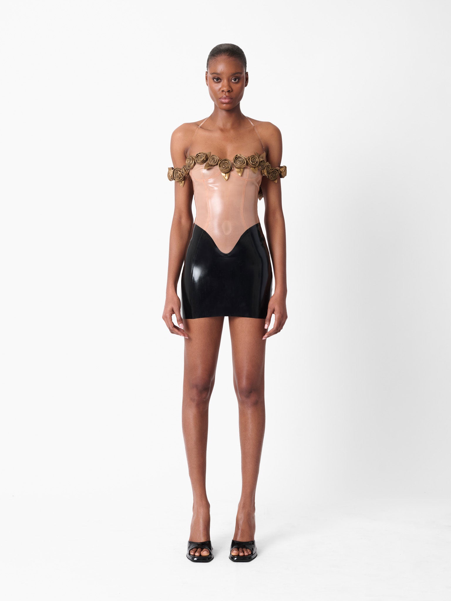 POSTER GIRL's Fantasy dress is truly dreamlike. Meticulously hand-crafted, gold latex roses drape off the shoulder and around a transparent bust and midriff nipped in to bring your fantasy to life. The final touch? Gleaming black latex that brushes the thigh. Don't forget to use the latex wipe to give it that extra shine.