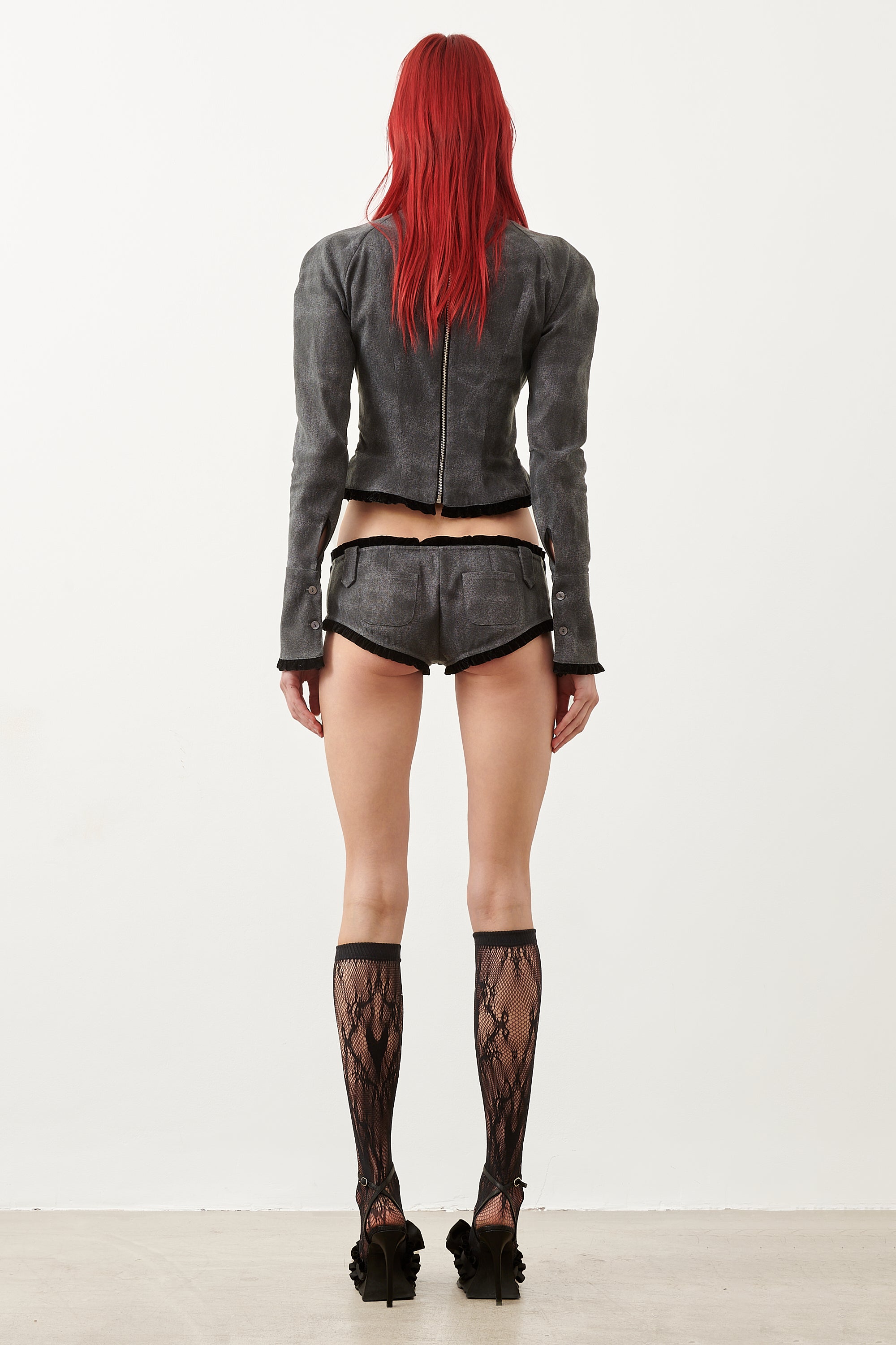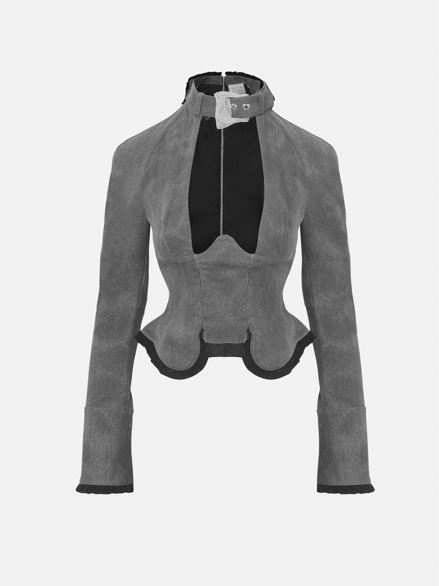 The Bermuda Top is brand new for AW23. Crafted in London with exquisite tailoring details, this long sleeve top features black worn canvas, a plunging neckline, silicone boning, underwire for full support, waist zipper details and our iconic custom buckle secured at the neck.