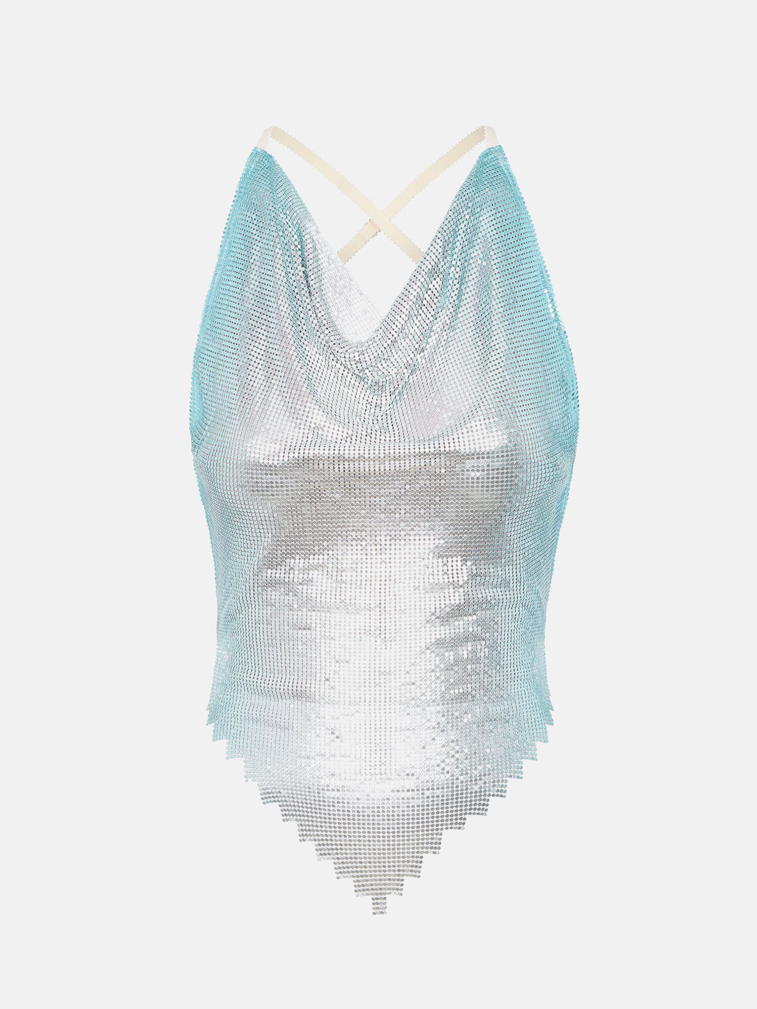Our iconic Beyan Top is back in a new chainmail print for AW23. Crafted in London in an Ombre chainmail, the top features high cowl drape neckline and an intricate hand cut stepped symmetrical hem.