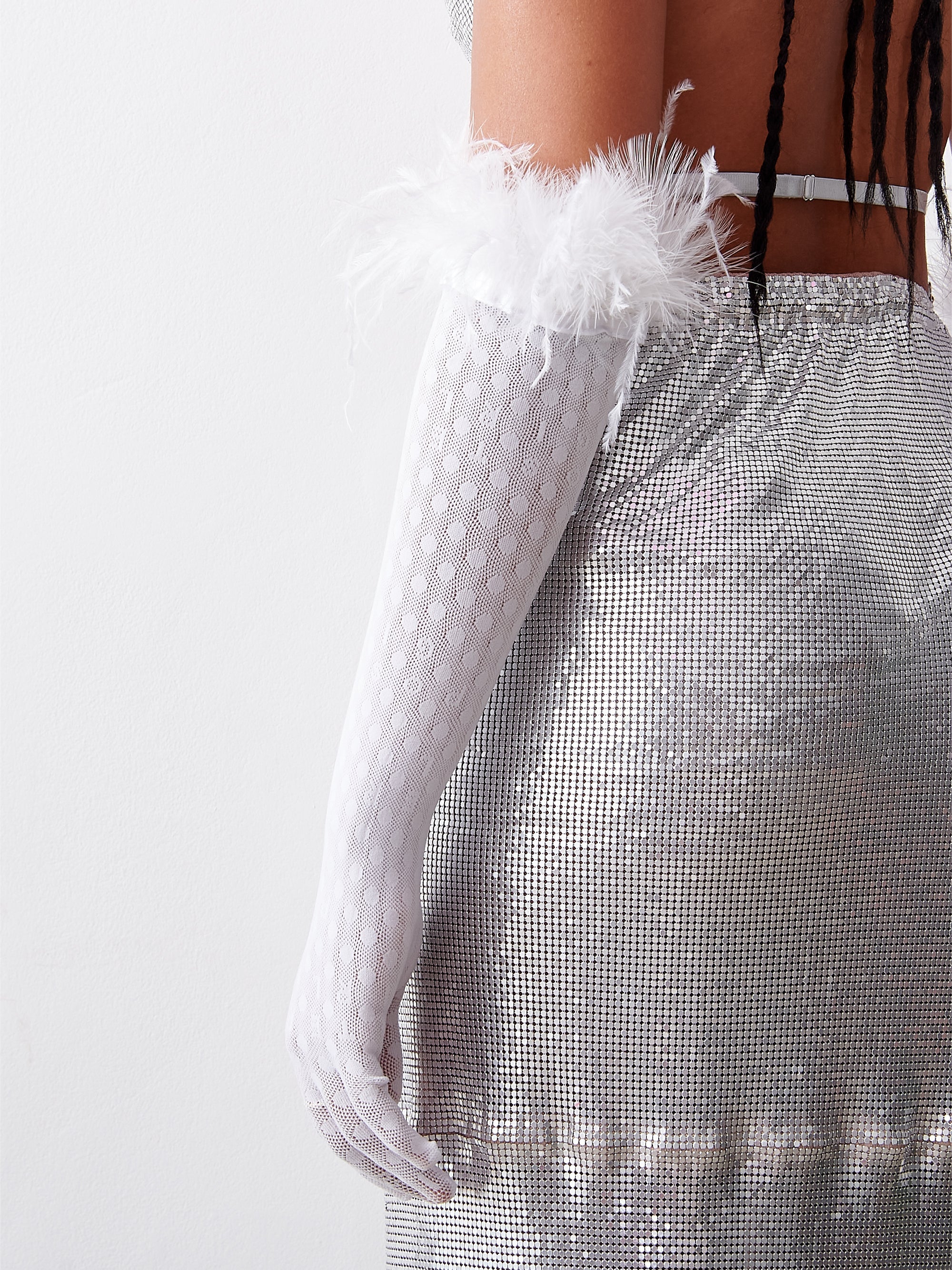 The Gwenevere Gloves are the must have item for this season. POSTER GIRL'S innovative fishnet shapewear features polka-dot logo lace and our signature ostrich and marabou feather blend on the cuffs.