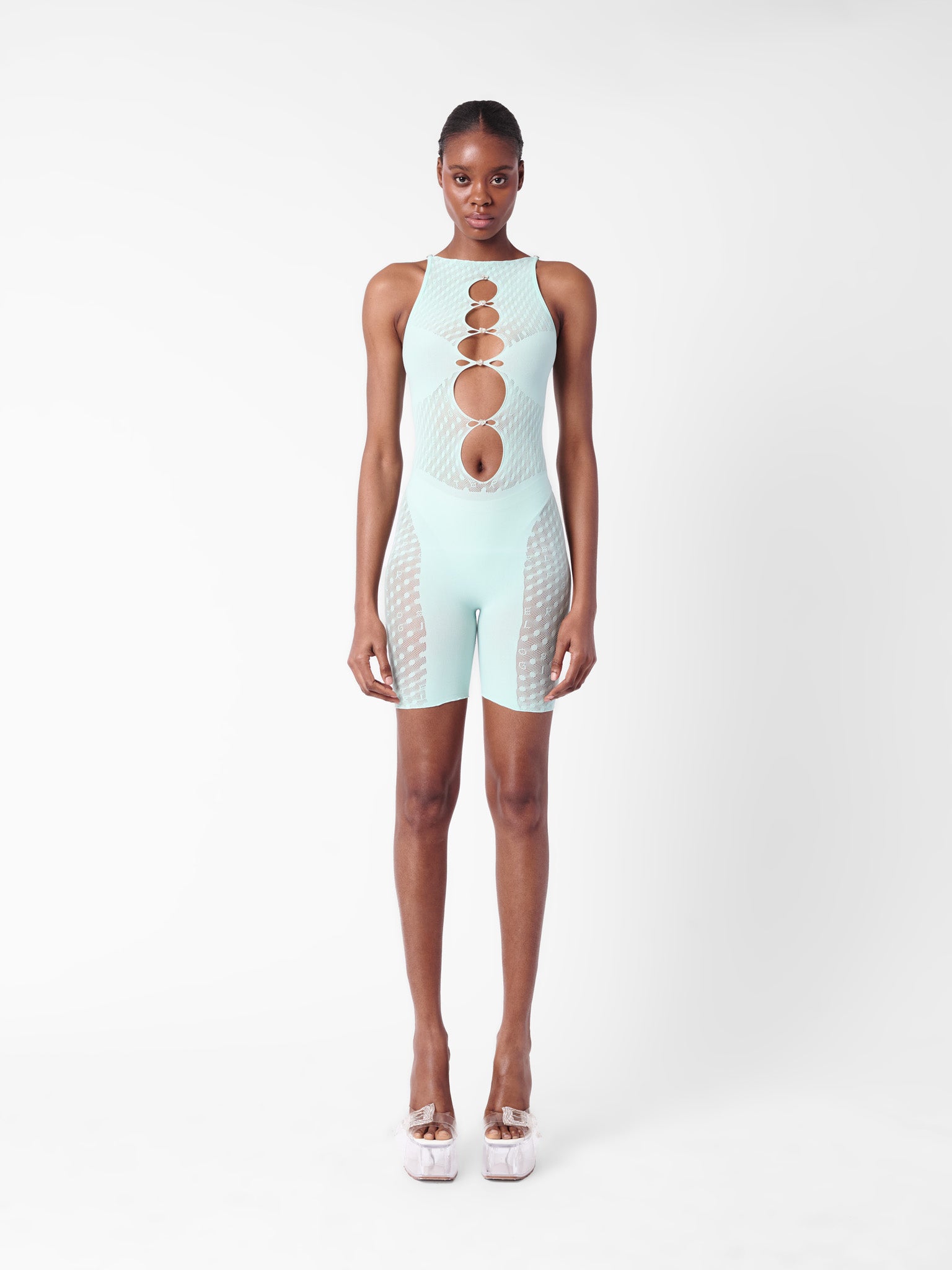 Worn iconically by Kylie Jenner; The Jetta Jumpsuit has become a must-have for your wardrobe. Signature cutout crystal heart embellishments flatter you to perfection, and its figure hugging silhouette is highlighted within the logo polkadot lace.