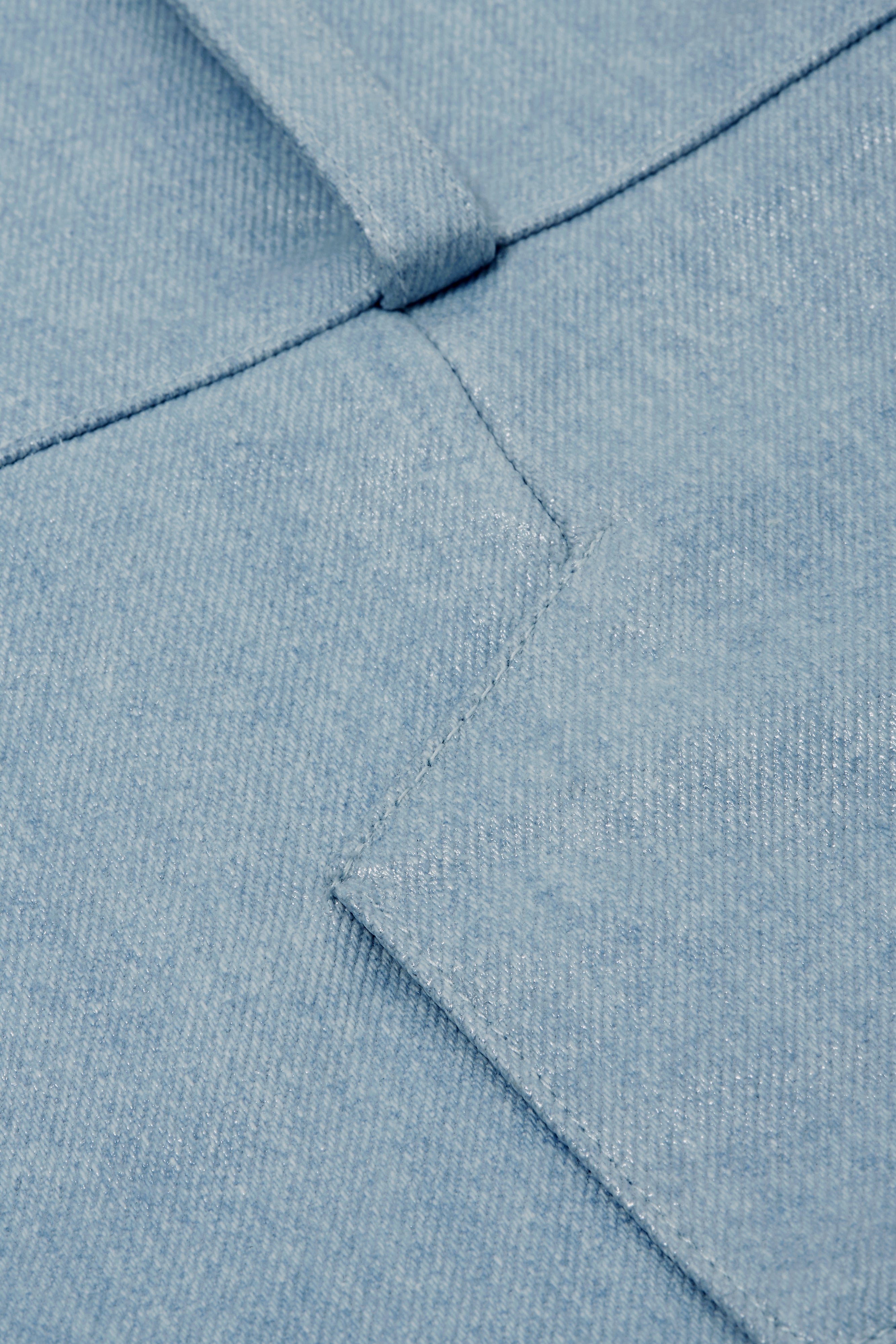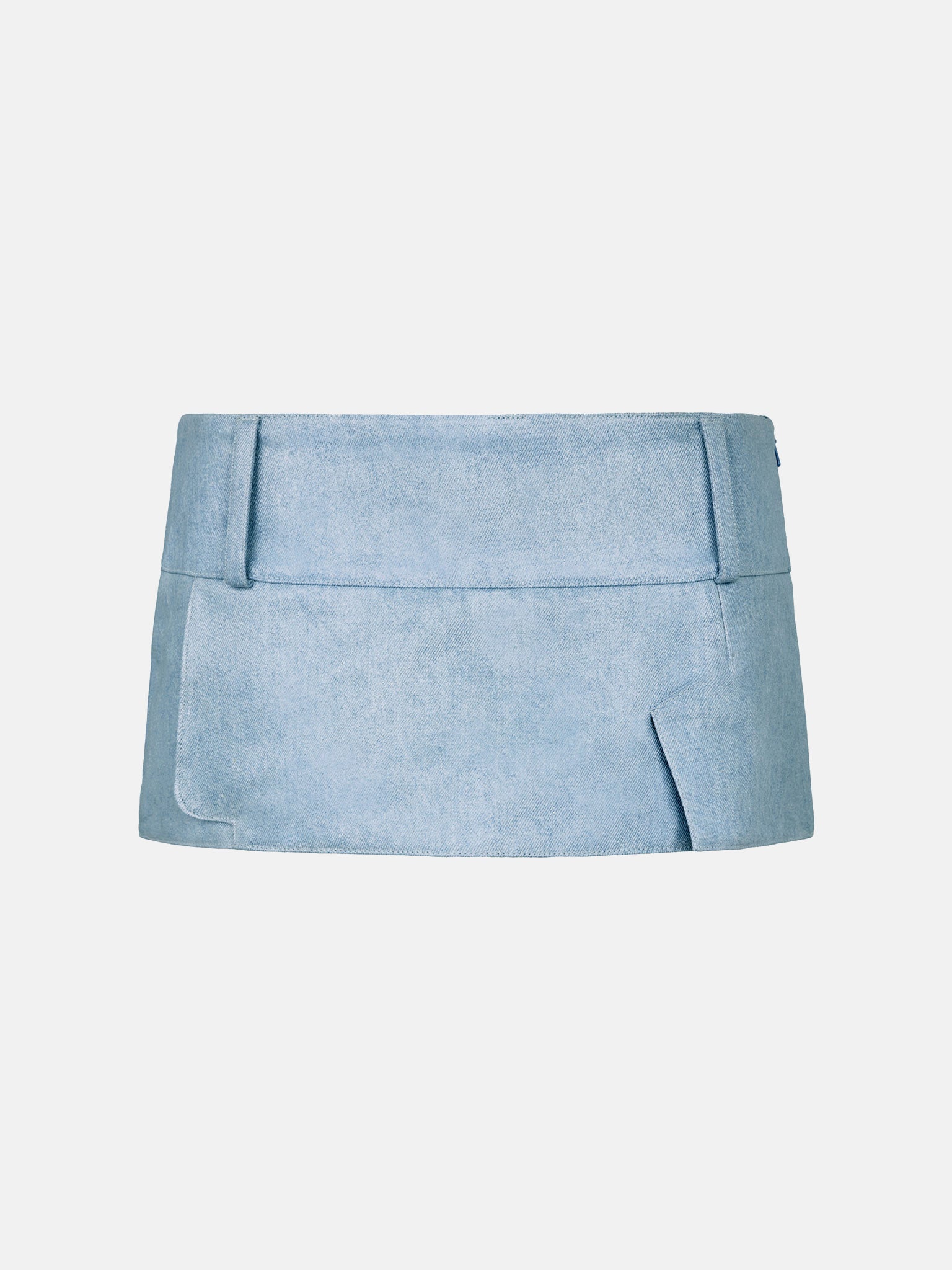 The Suzan Micro Skirt showcased on the SS23 runway. Crafted in London with exquisite tailoring techniques and lacquered denim, this ultra mini skirt features a front vent split for full movement and comfort along with belt loops and an invisible zip. Pair with the denim Calamity Corset for the double denim y2k look.