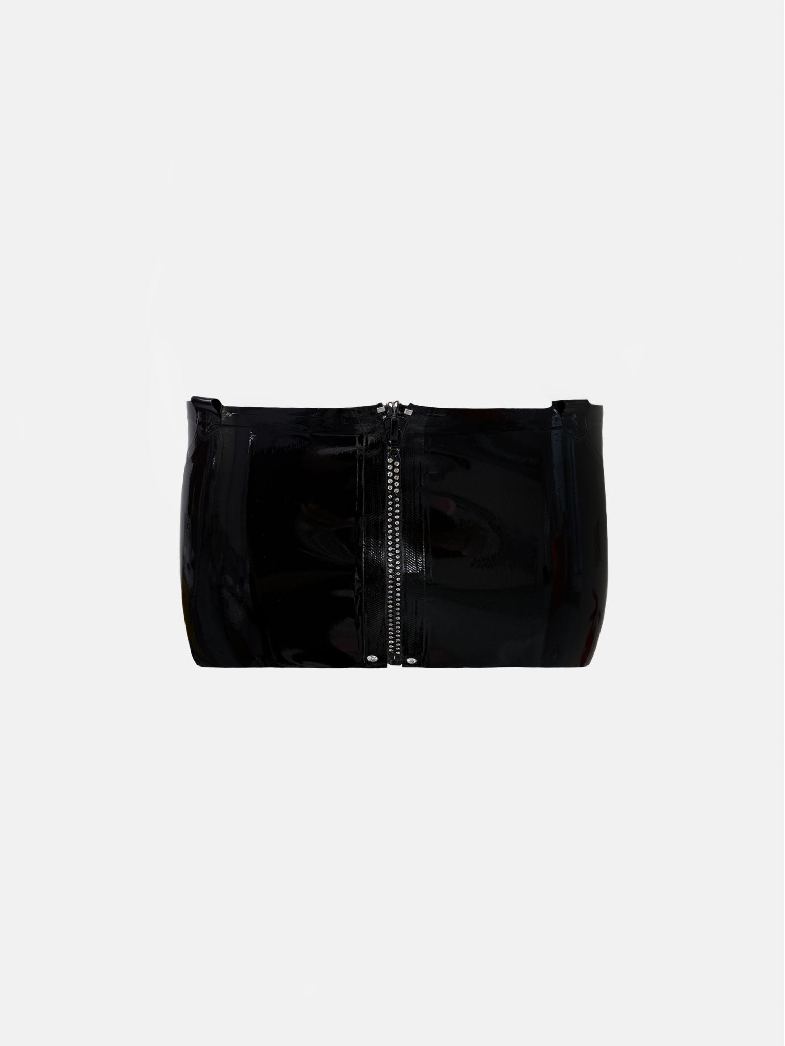Introducing the Manhattan mini skirt. This low rise latex micro mini skirt is part of our new latex party collection, and features a rhinestone front center zip and two back pocket detailing. Pair with the Tart top or Crikey Top and Ursula Mules for the complete look.