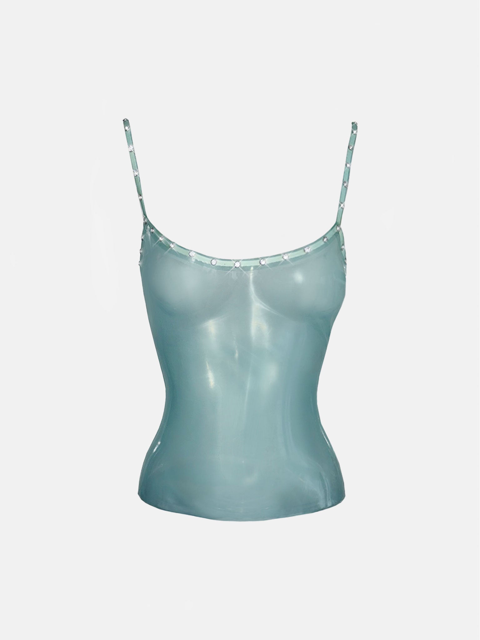 The show-stopping Whistle is back for pre-SS25, now a sexy spaghetti-strap top in translucent blue latex. Rhinestone detailing makes for a striking yet understated finish. Style with the Manhattan mini skirt for the complete jaw-dropper look.
