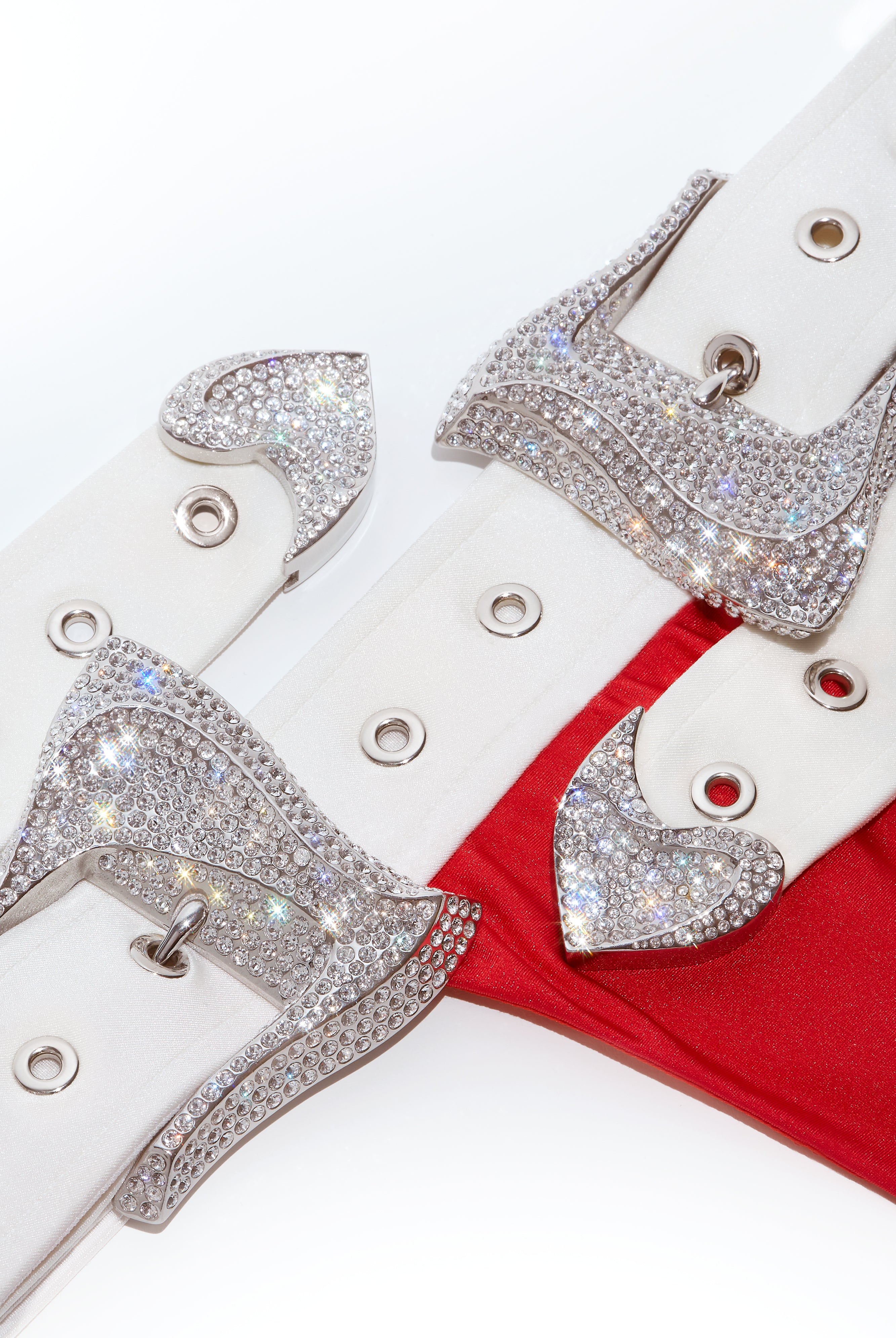 Dive into the exclusive POSTER GIRL Resort collection with the brand new Ariel Bikini. Crafted from luxurious slinky jersey in 'Gazpacho' and 'Mr Whippy' Finished with silver eyelet fastening and our dazzling diamanté buckles, this bikini can be layered with our infamous shapewear or chainmail, perfect for the poolside or dance floor.