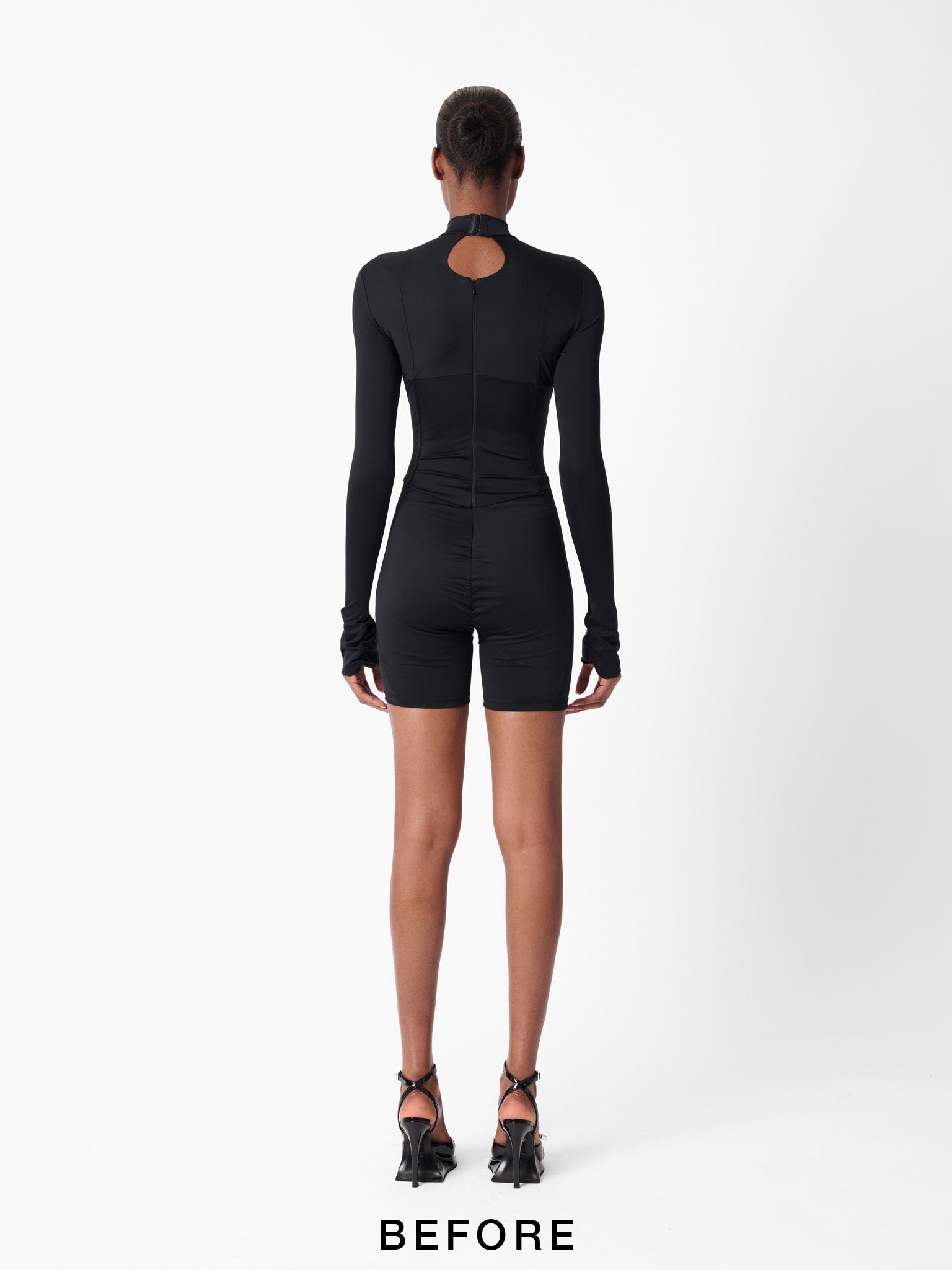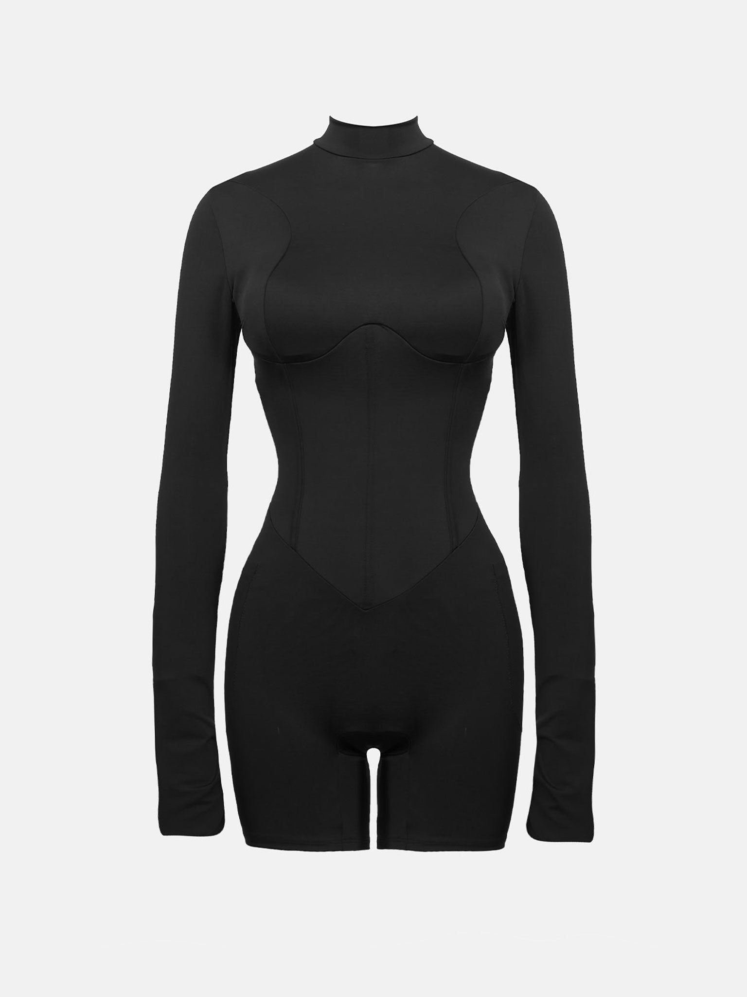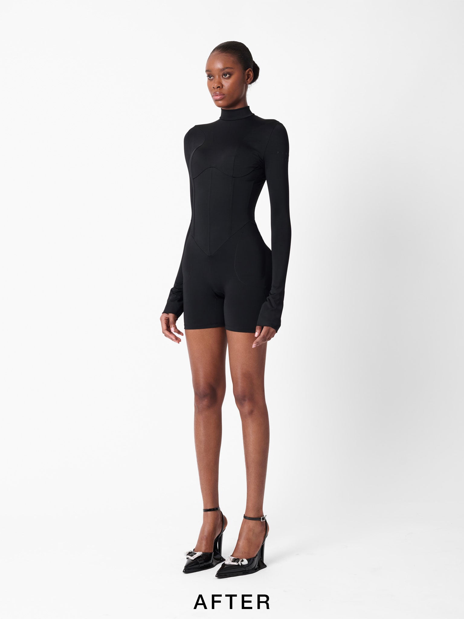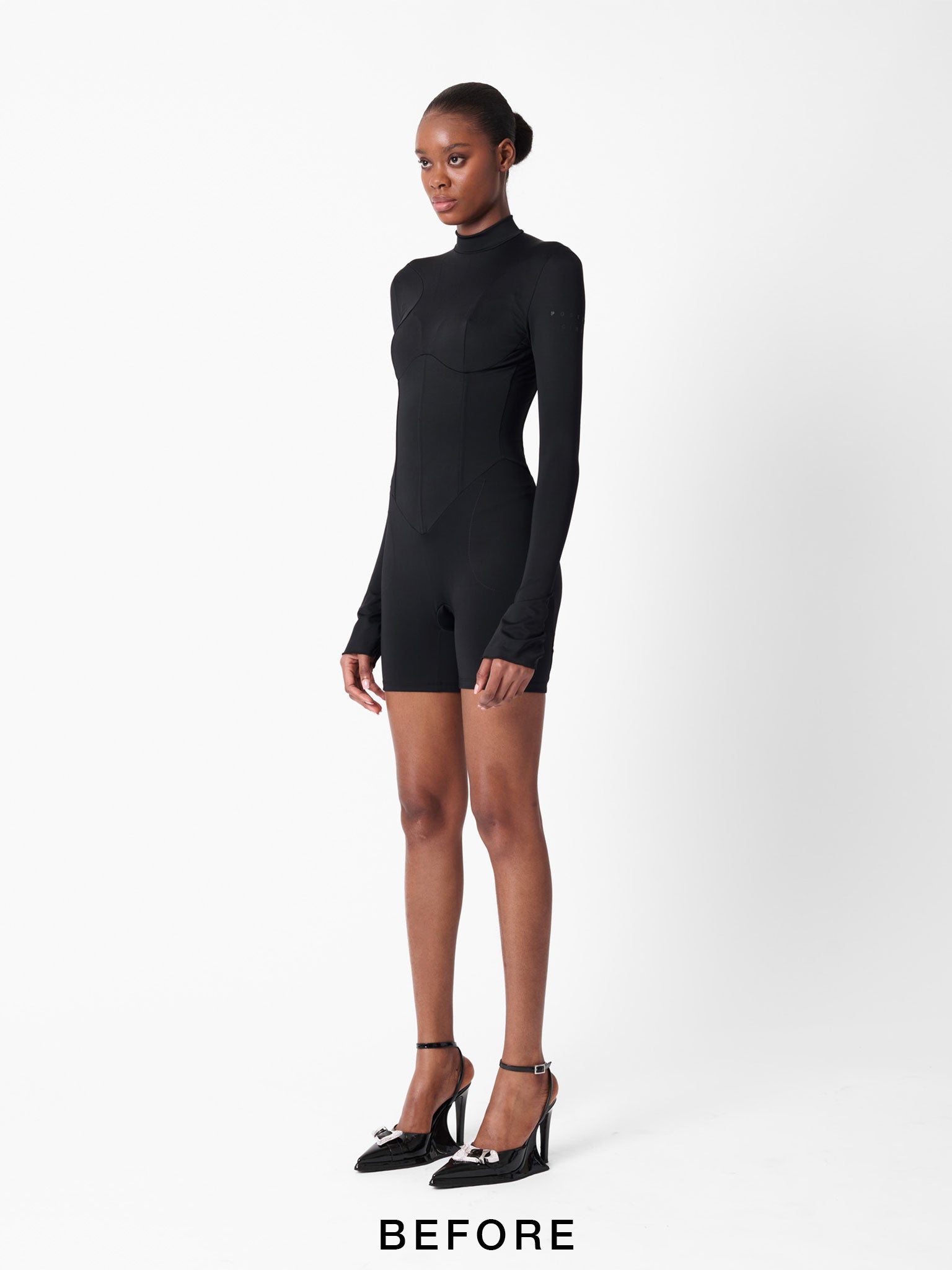 There's no going under the radar in the Cat Call playsuit. Part of our brand new padded shapewear category, the innovative body-contouring and ruched detailing will sculpt your figure like never before, with or without the removable padding for extra support. Features interior corsetry that cinches you in at the waist. With sleek proportions and a sultry jet-black fabric, she can be as styled up or as dressed down as you like.