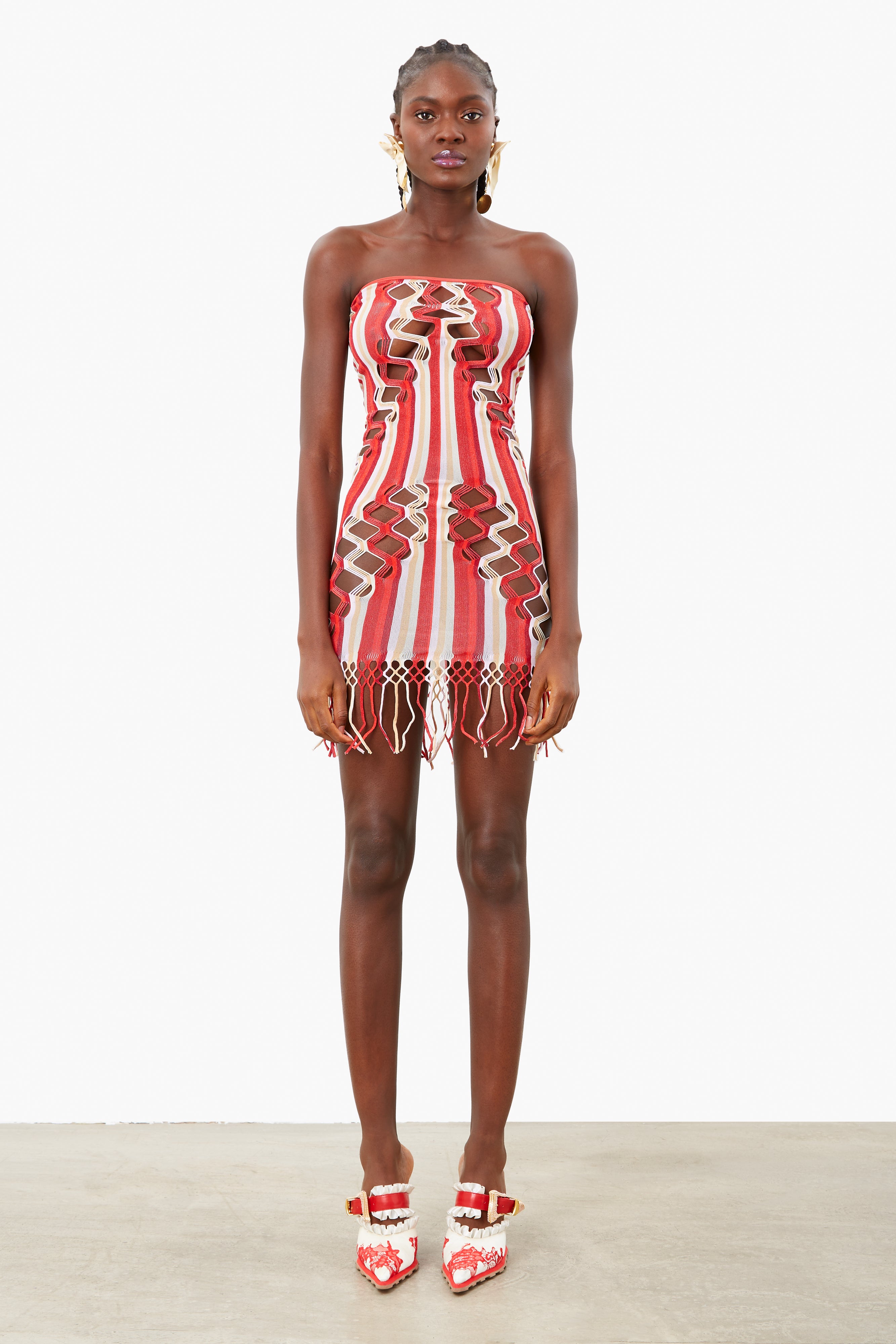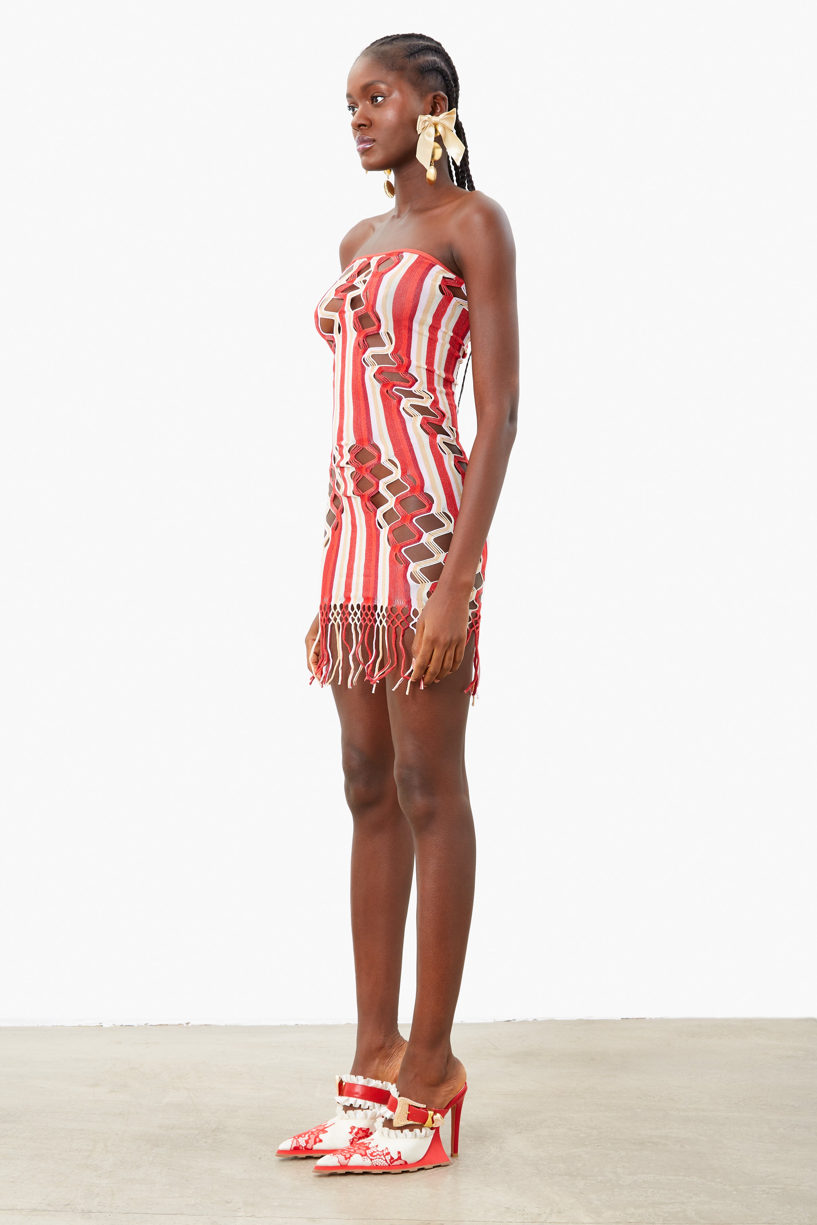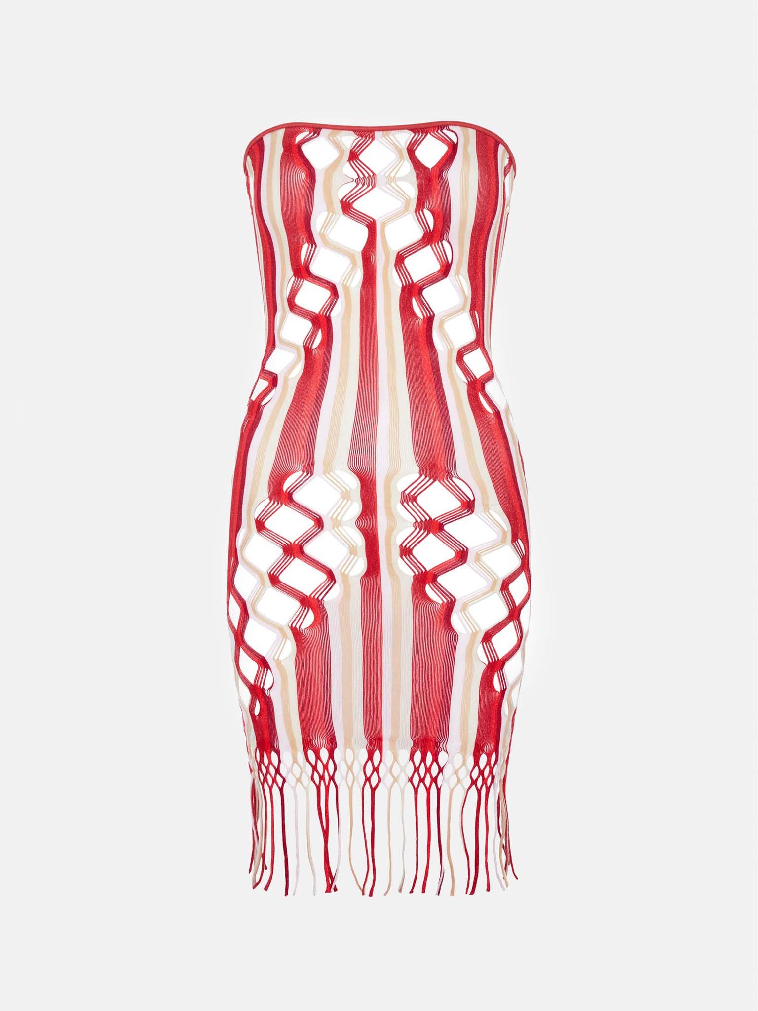 The Haze Dress is brand new for AW23. Featuring semi sheer stretch shapewear, hand dyed yarns blended together in Oyster and Burgundy stripe and our infamous diamond cut open weave lacing that contours every body to perfection. Featuring a tassel hemline and bardot neckline.